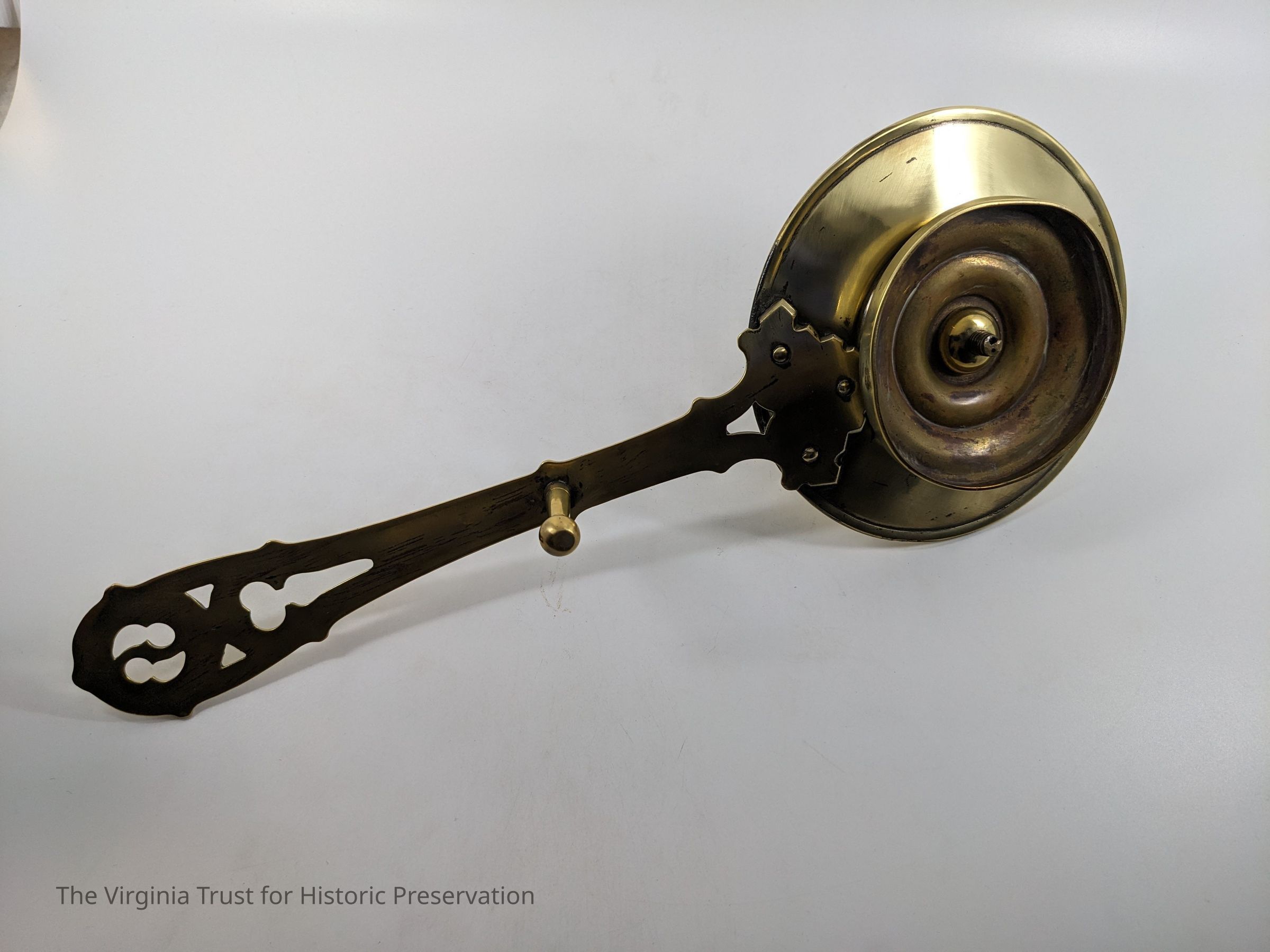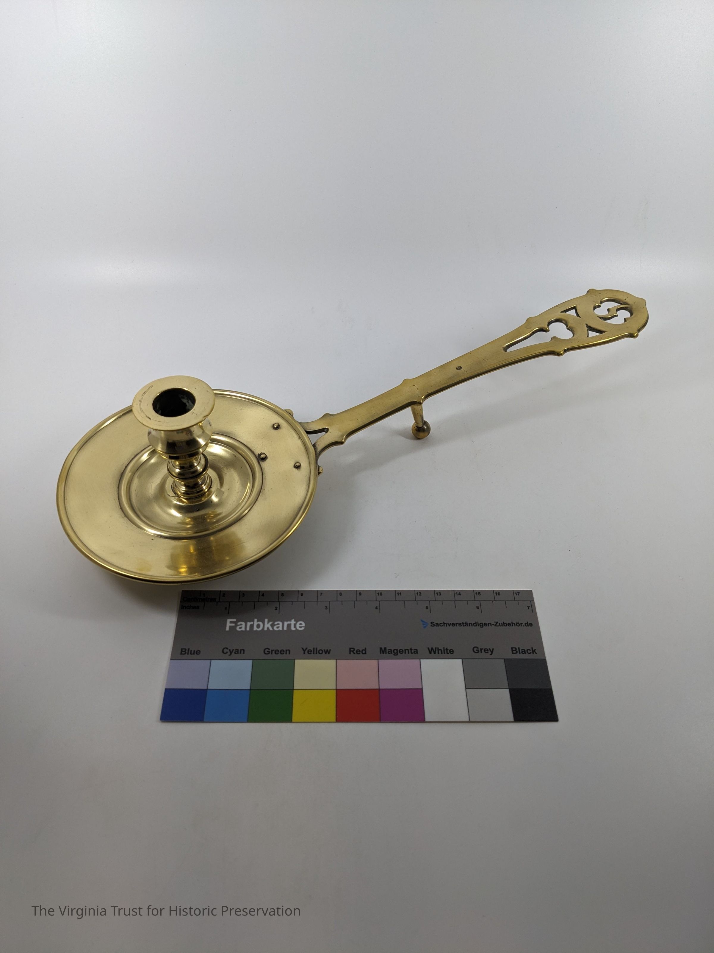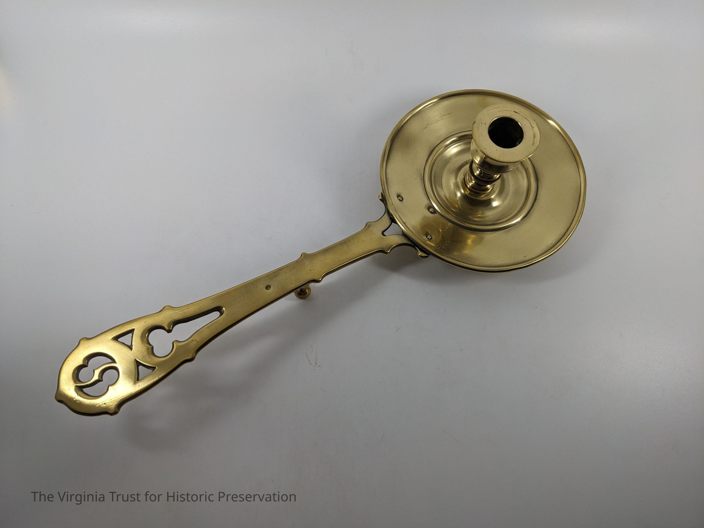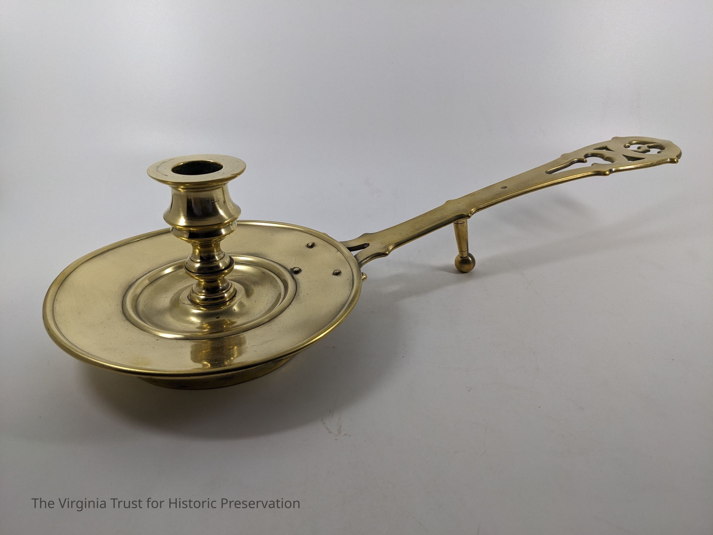 Ca. 1900 long-handled brass chamberstick with foot rest.
