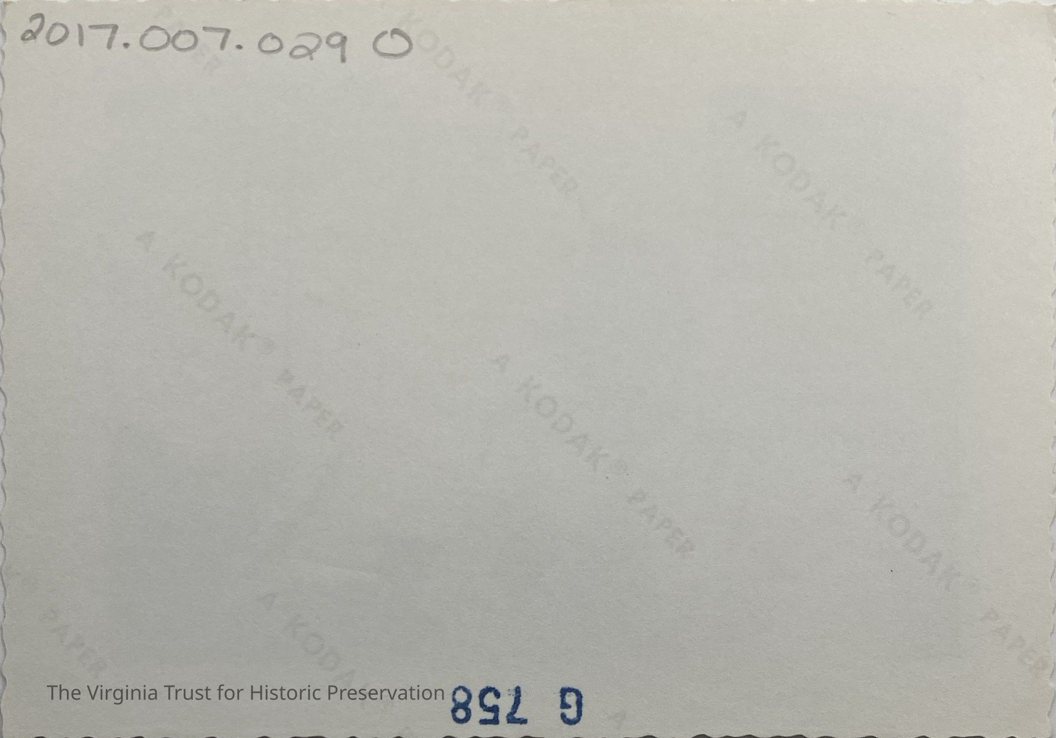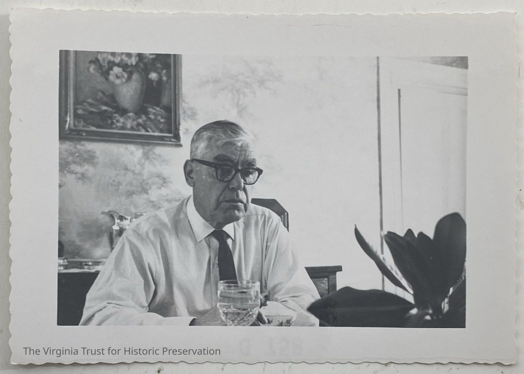 Black and white horizontal photograph of an unknown man sitting at a table. Most likely in the dining room of the Lee-Fendall House during the Lewis residence. Crystal glass and plant in foreground and a picture frame and wallpapered wall in background. Man wears white shirt and tie and glasses. White border with grooved edges.