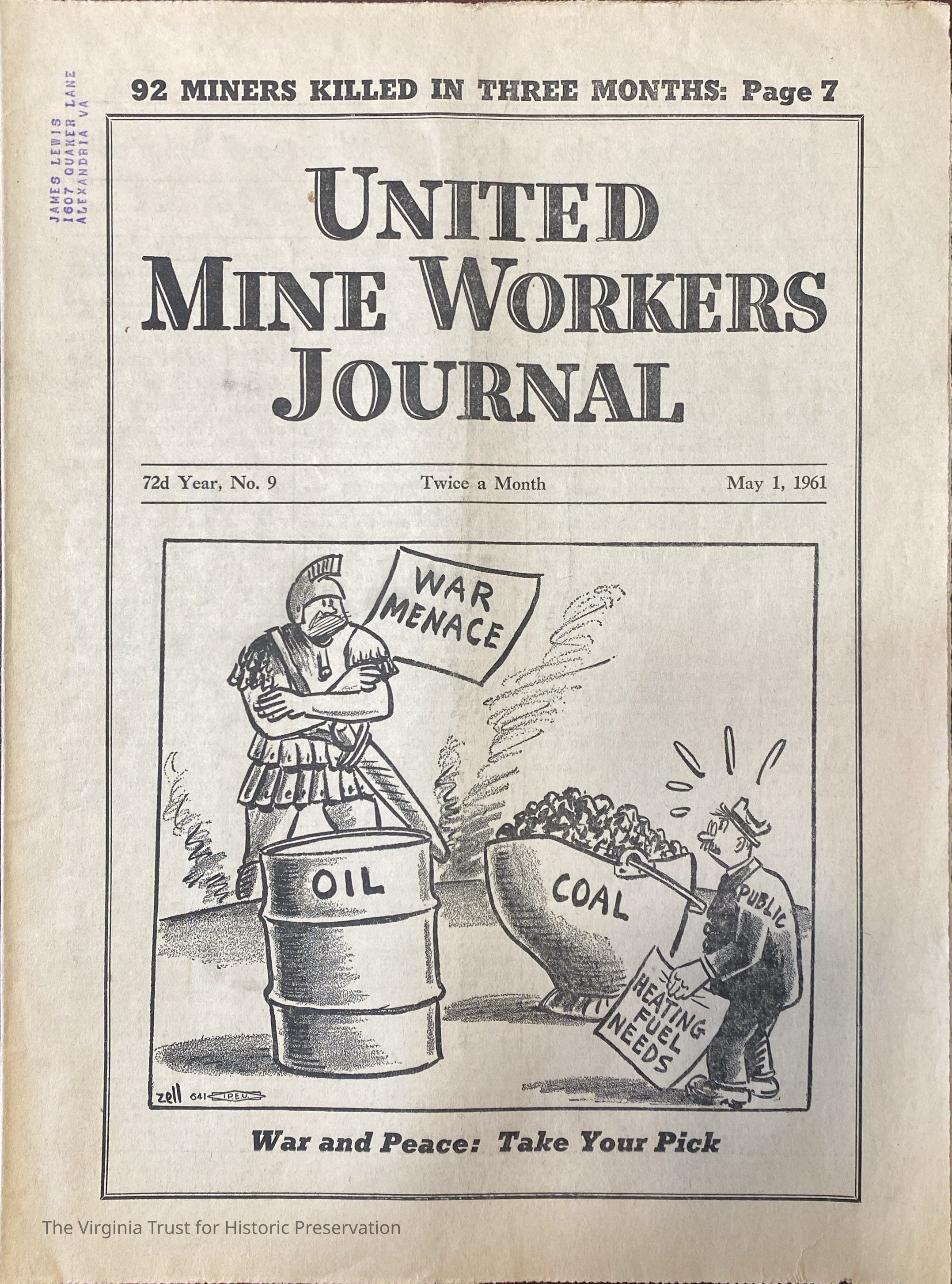 United Mine Workers of America Journal. Year 72, No. 9. May 1, 1961. Cover image, titled "War and Peace: Take Your Pick, depicts a roman soldier labeled "War Menace" facing a man labeled "Public" and holding a sign that says "heating fuel needs". A barrel of oil and a barrel of coal stand between them. Stamp address to James Lewis at 1607 Quaker Lane, Alexandria, Virginia.Dimensions