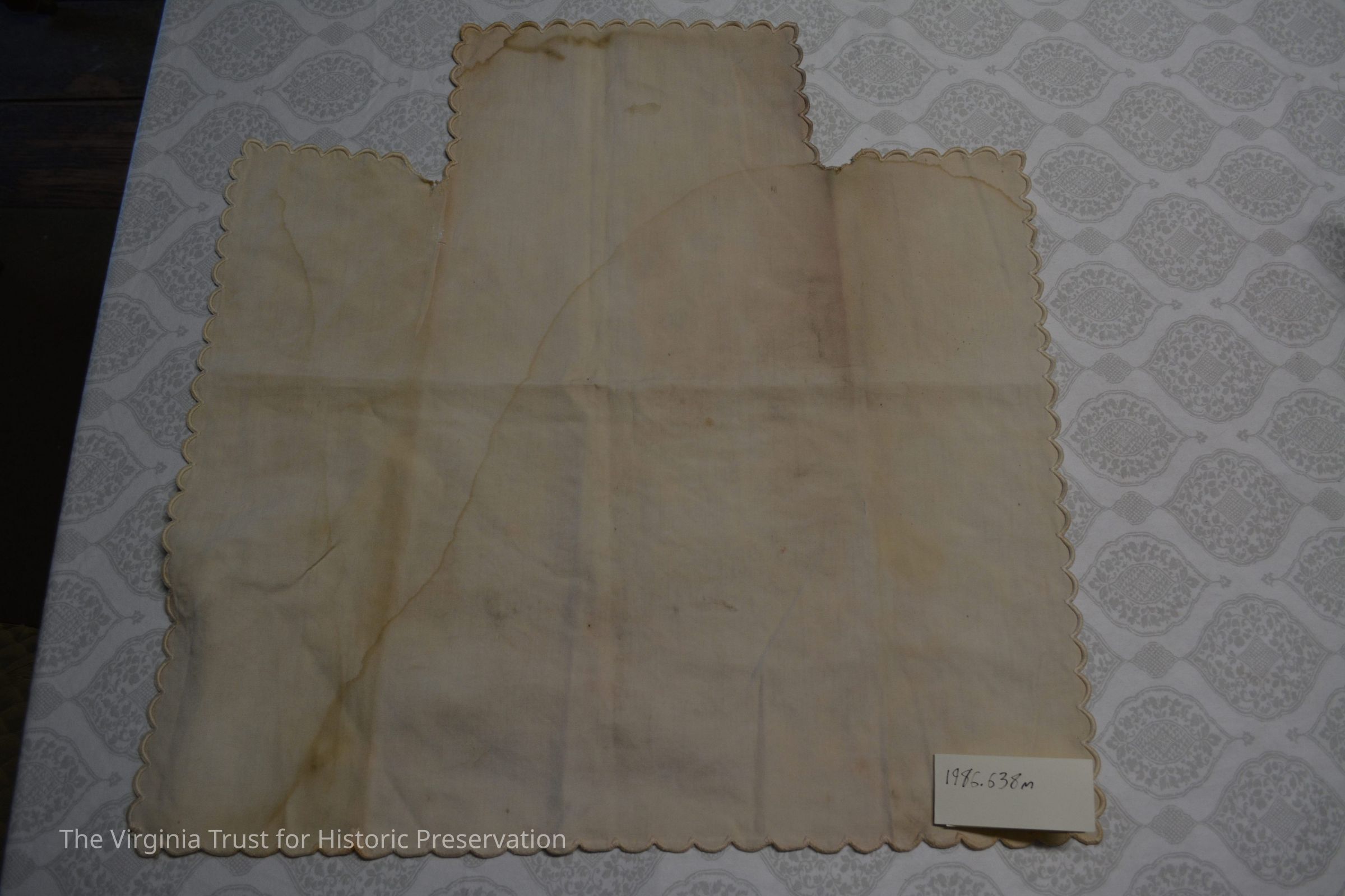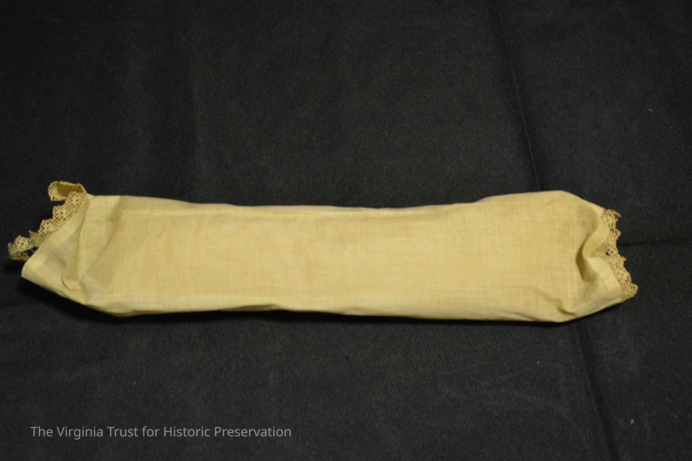 Wooden four poster doll bed with linens. Includes frame (A), 7 slats (B-H), tufted mattress (I), bolster (J), two pillows (K-L) and white linen spread with embroidered scalloped edges (M) and two matching pillowcases (N-O). Pillows have floral design.Dimensions