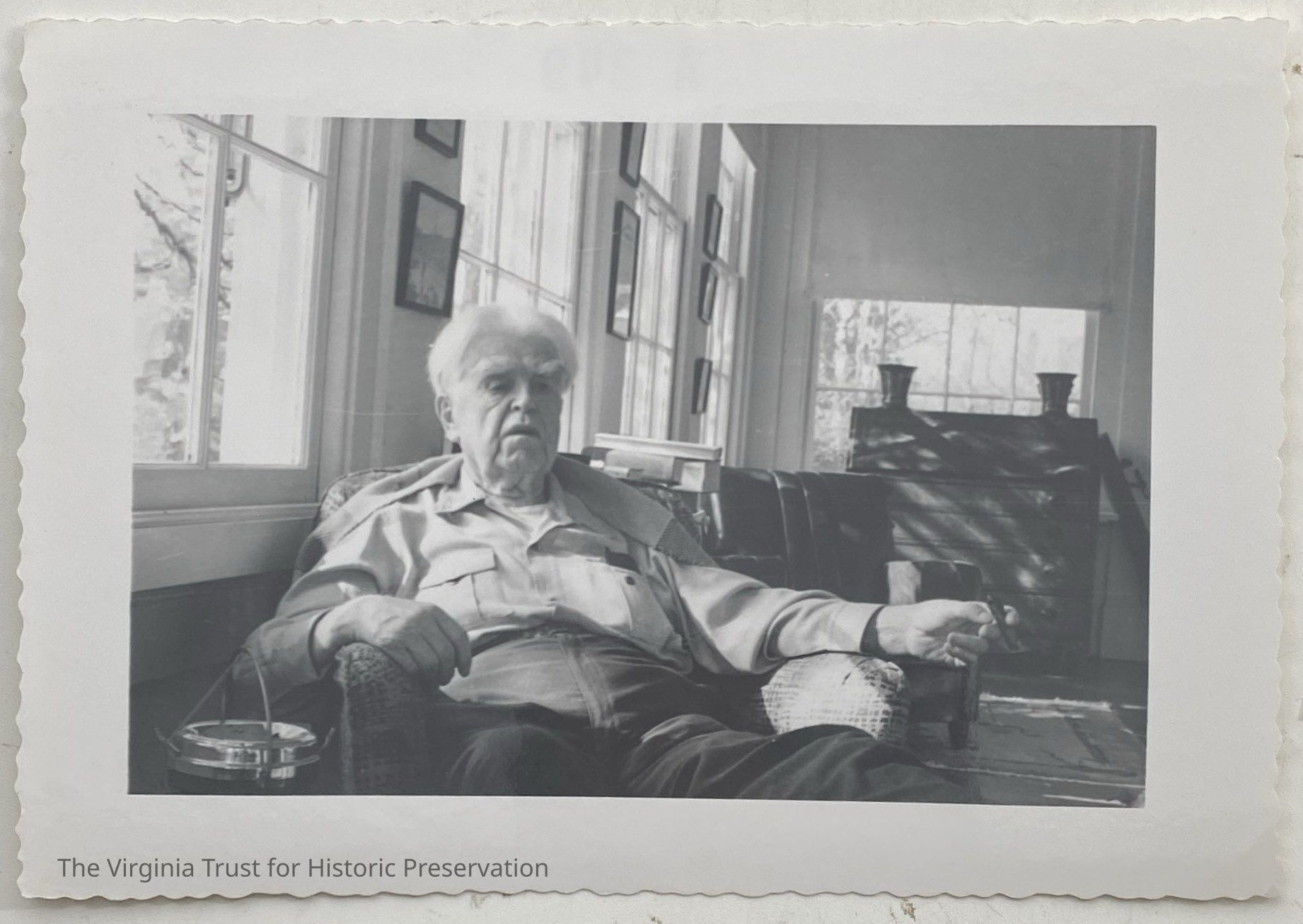Black and white photograph of John L. Lewis sitting in a chair, holding a cigar, and facing the camera. Furniture and picture frames hanging on the walls in the background. Lewis sits in the back porch of the Lee-Fendall House. White border with grooved edges.