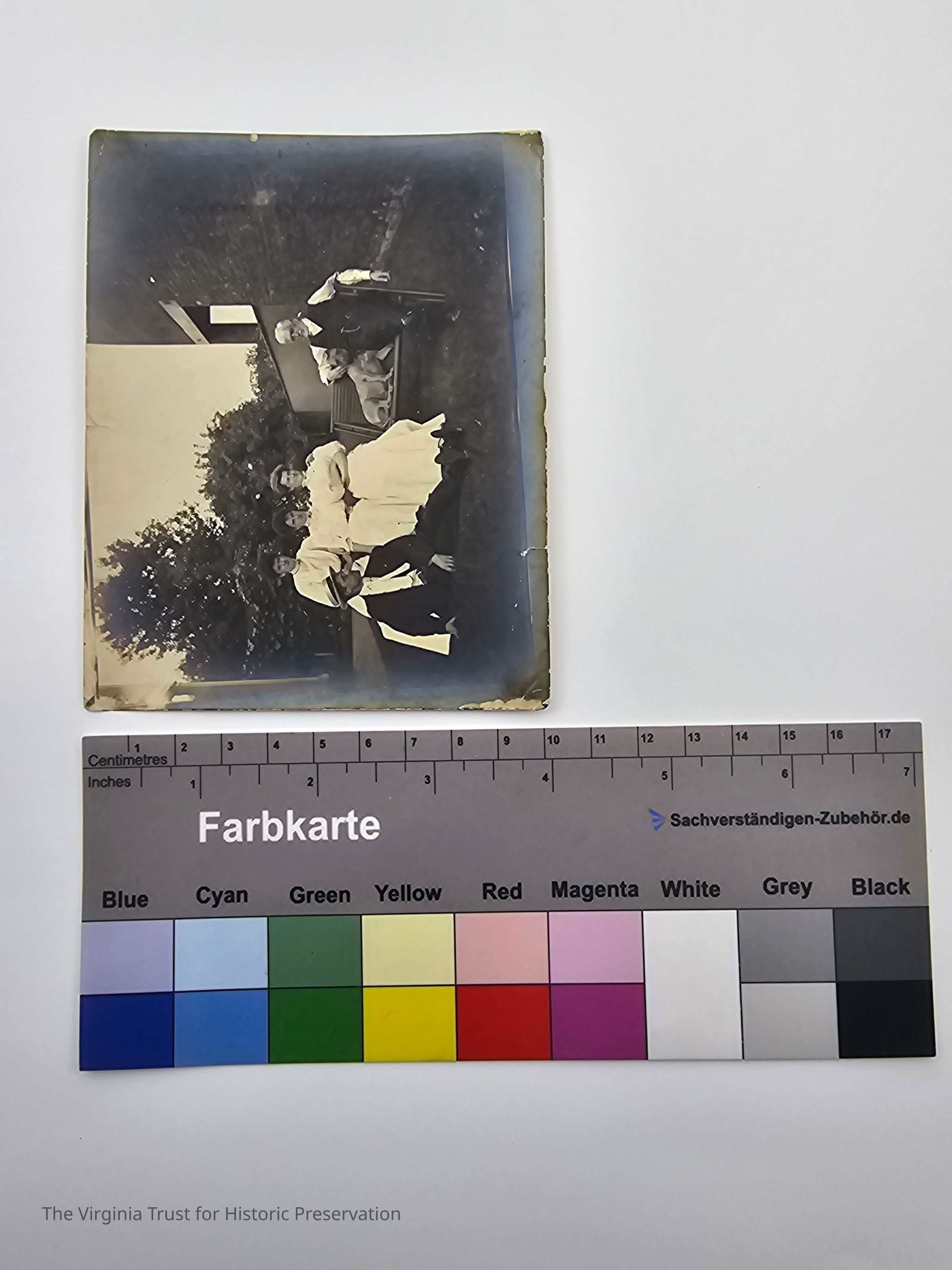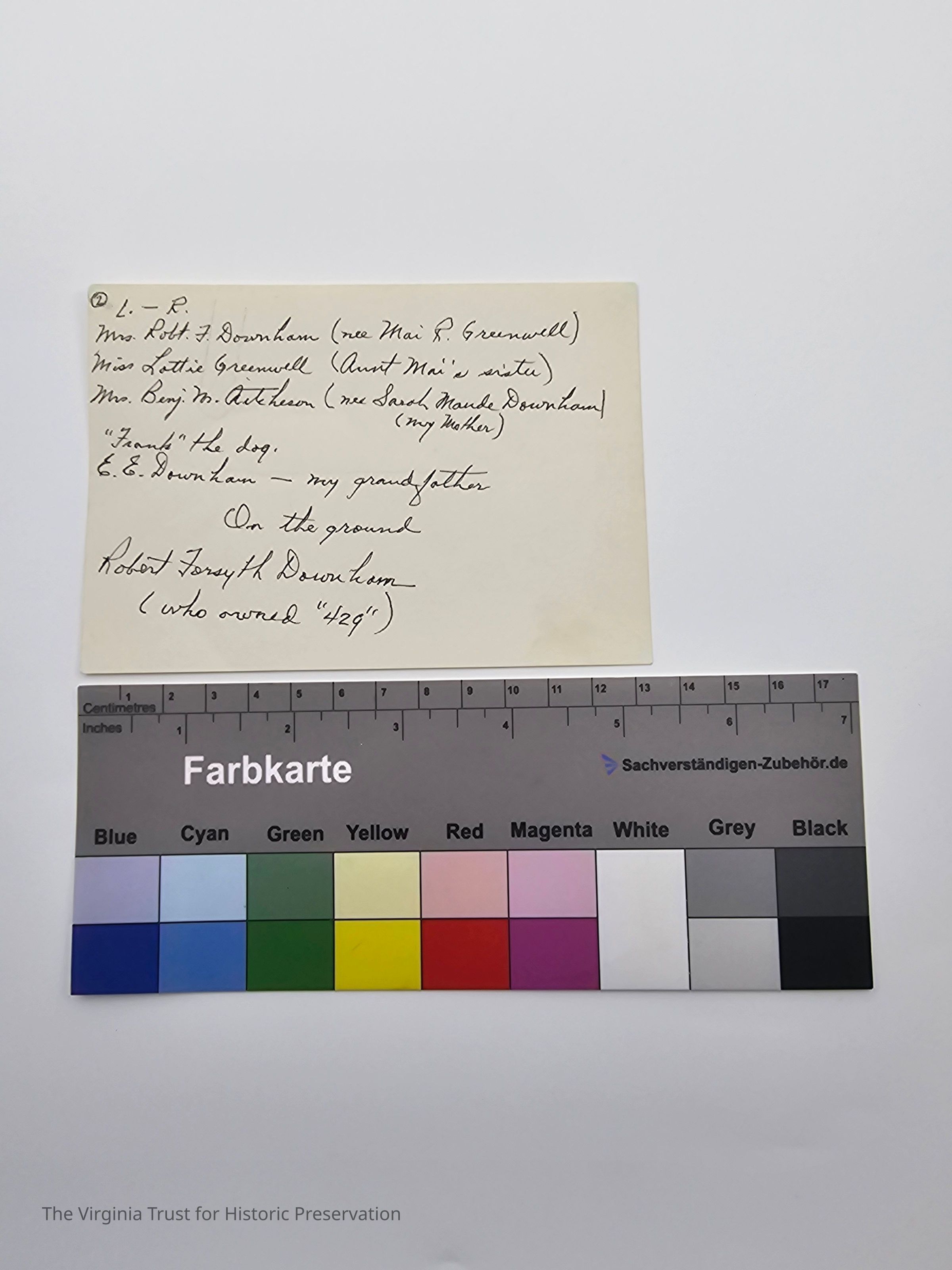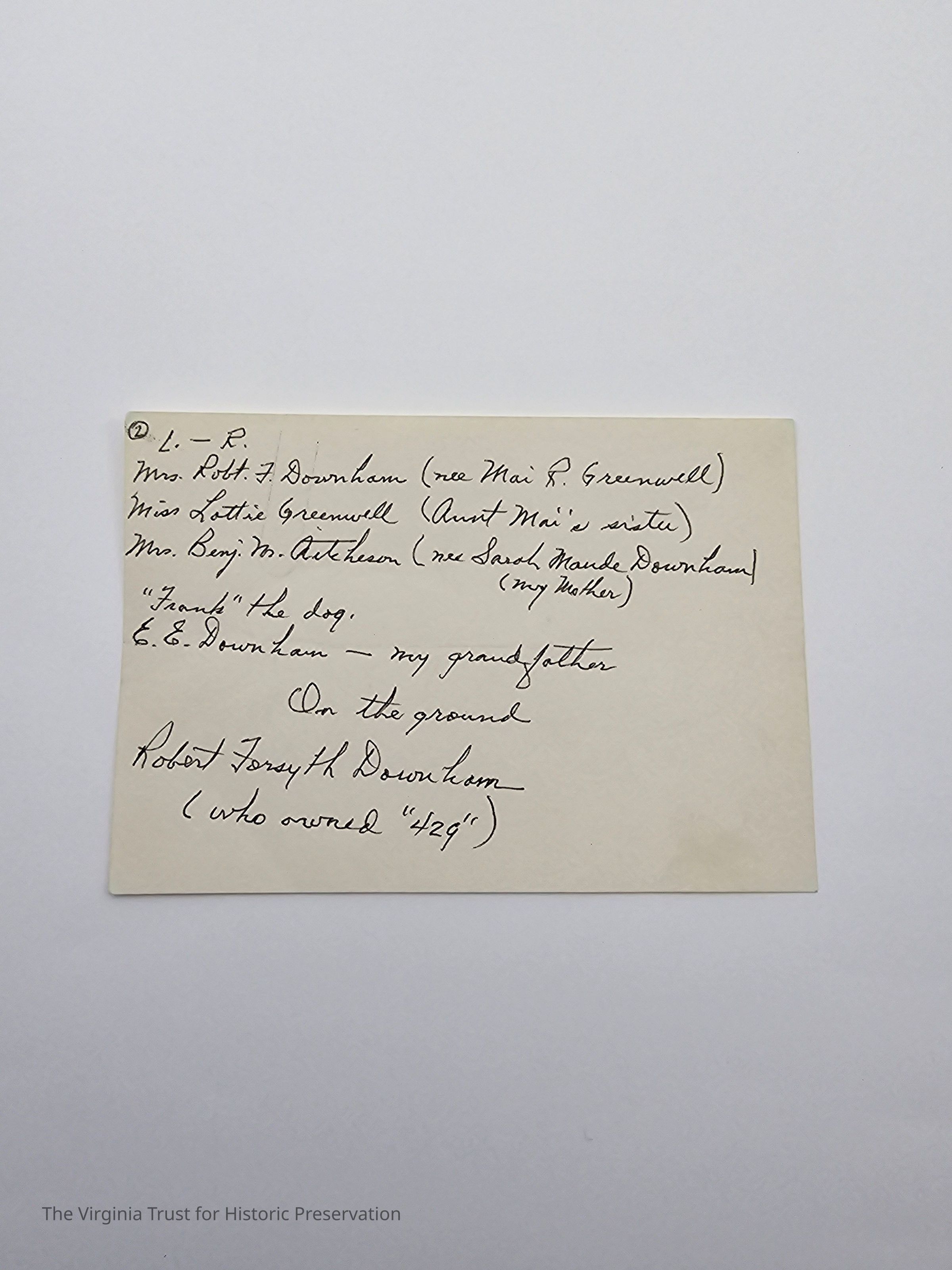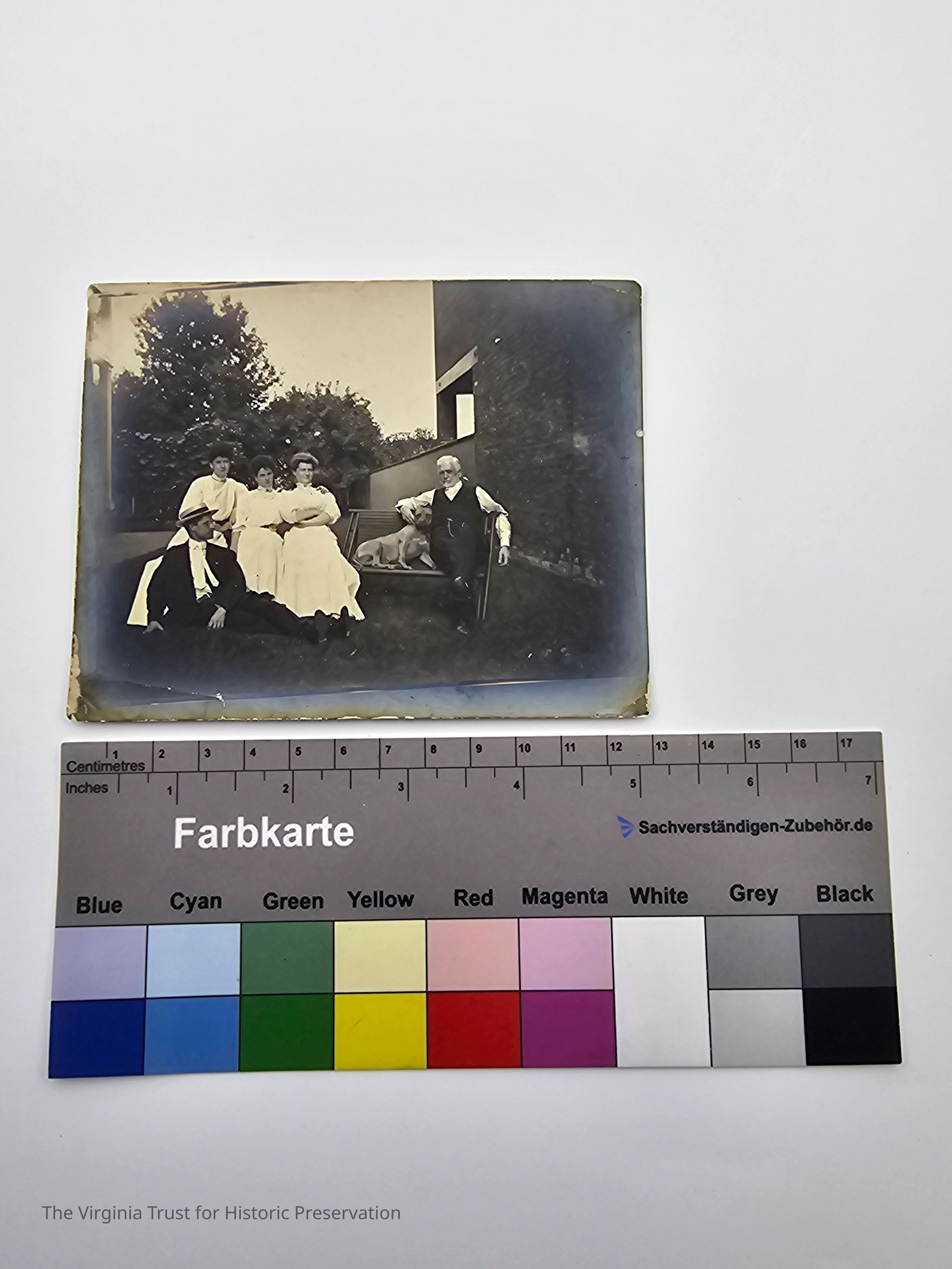 Two Women and Sarah Maude Downham Aitcheson on bench with Robert Forsyth Downham on ground, dog "Frank", and E.E. Downham at the yard of 411 N. Washington on July 4, 1907.