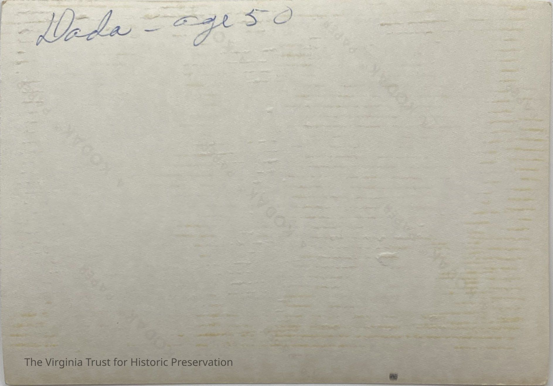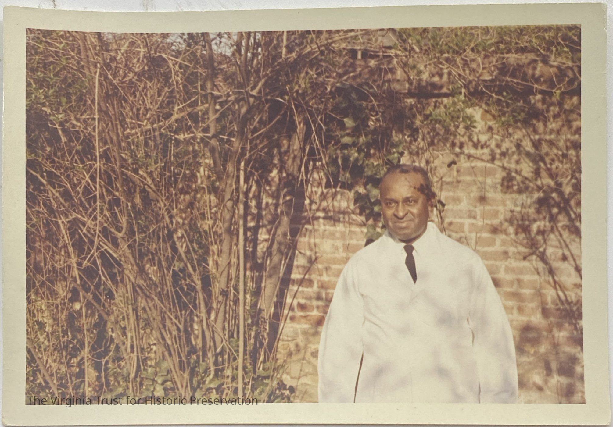 Color photograph of James Lewis, Jr., age 50, wearing white coat and tie. Possibly in Lee-Fendall garden - stands in front of tall brick wall and foliage.