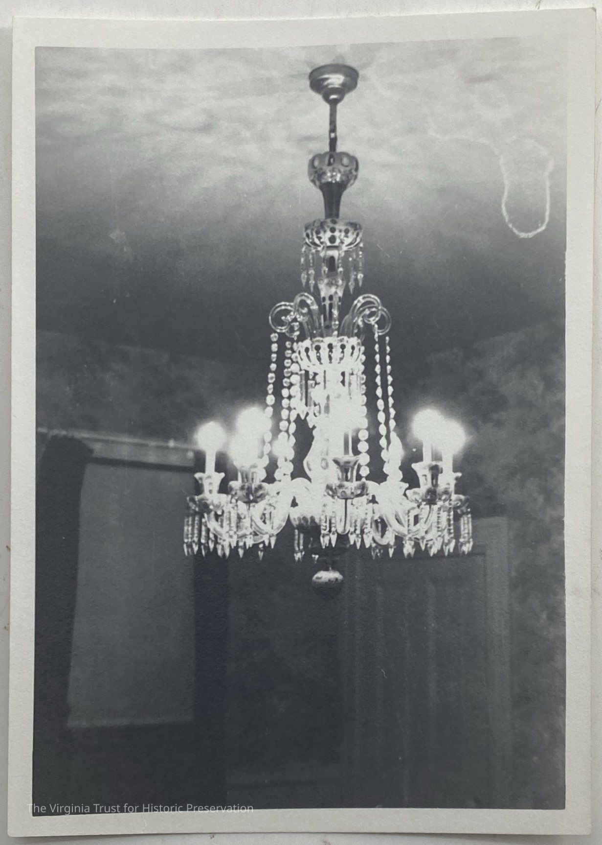 Black and white photograph of a lit chandelier. Most likely in the dining room of the Lee-Fendall House during Lewis residence. White border with straight edges.Dimensions