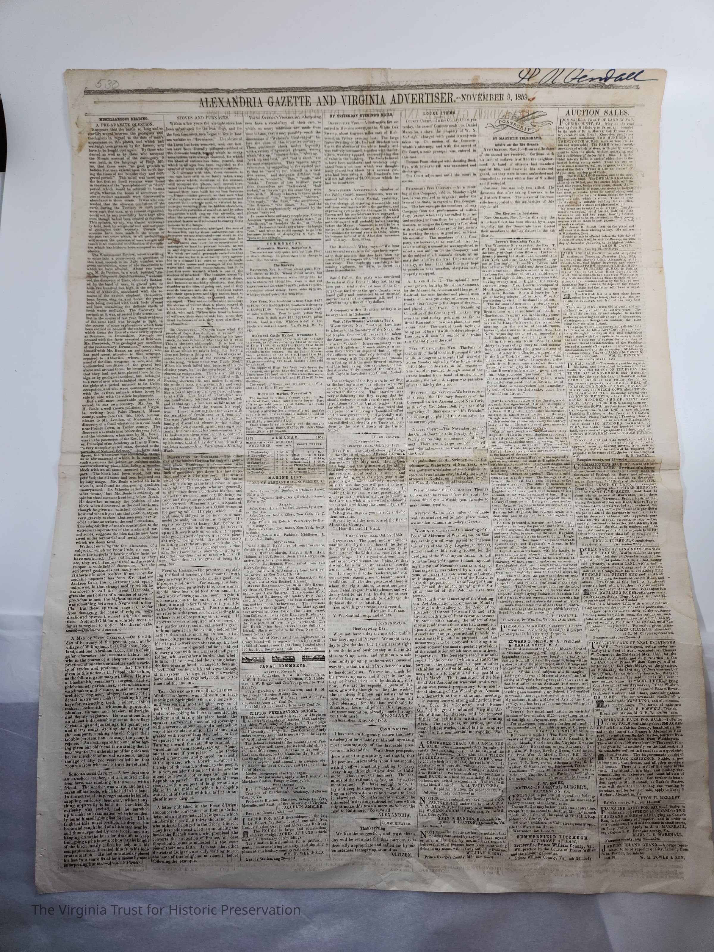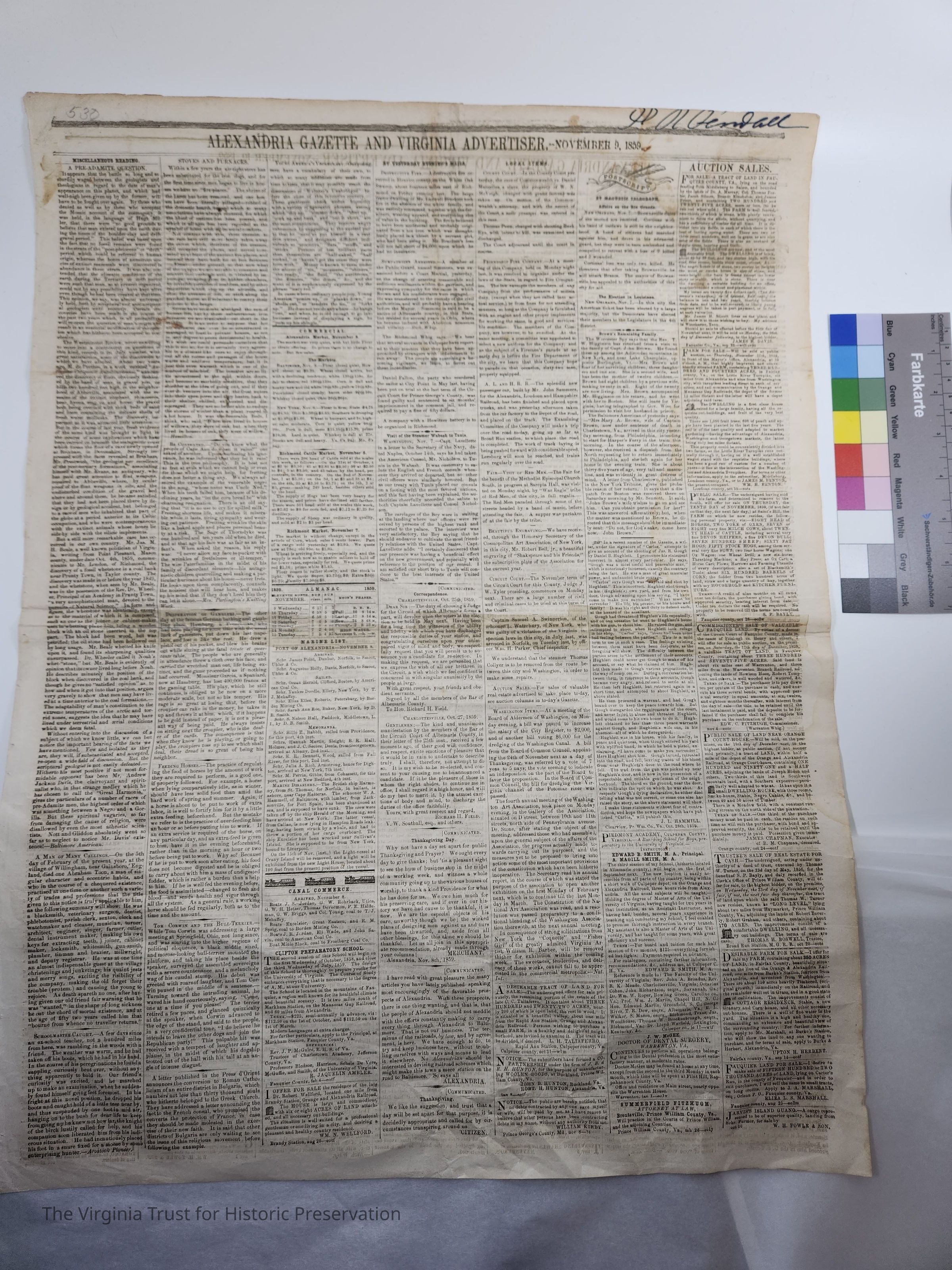 The November 9, 1859 edition of the Alexandria Gazette and Virginia Advertiser with Fendall's signature in the upper right hand corner. Articles of interest include: