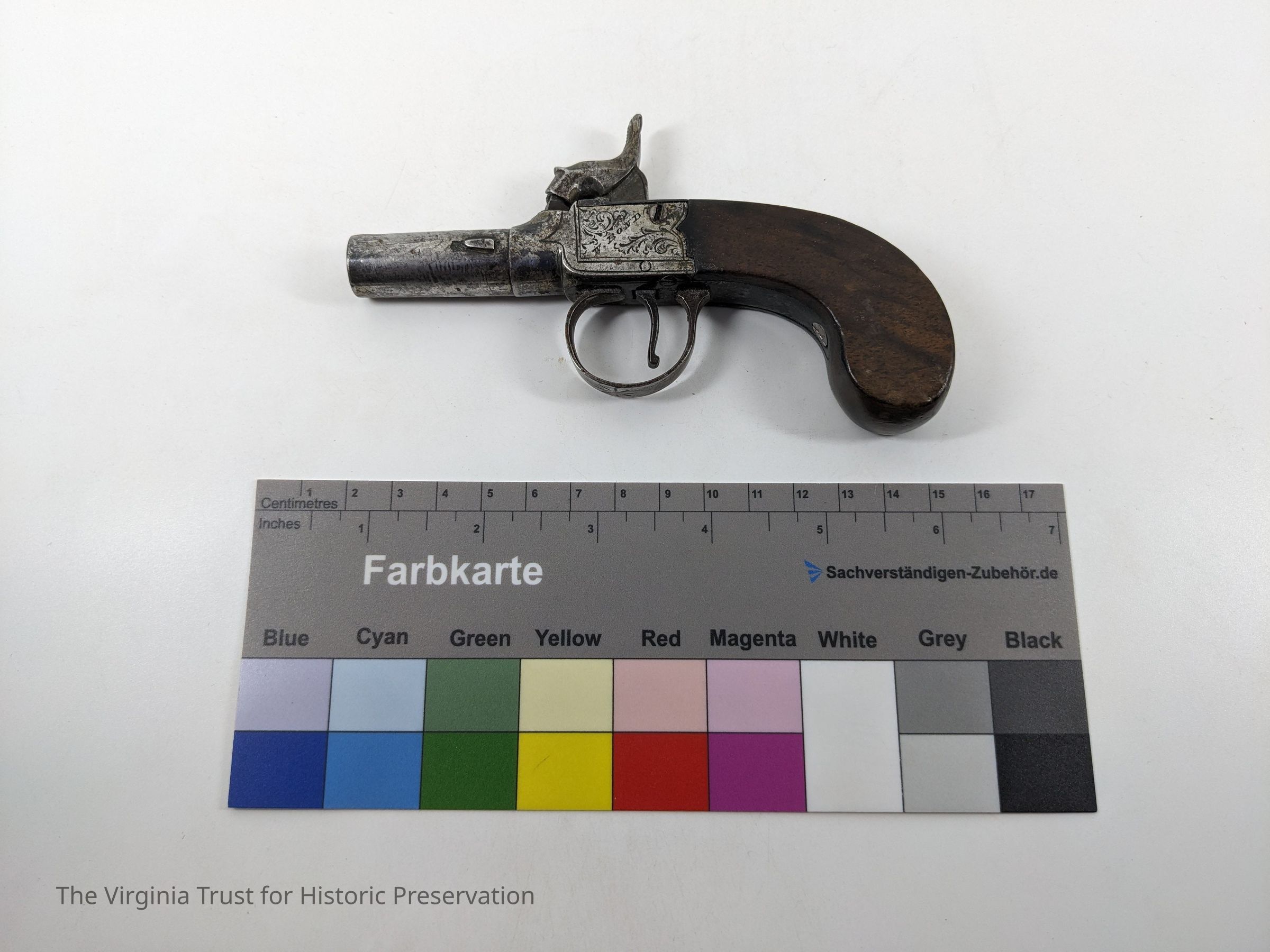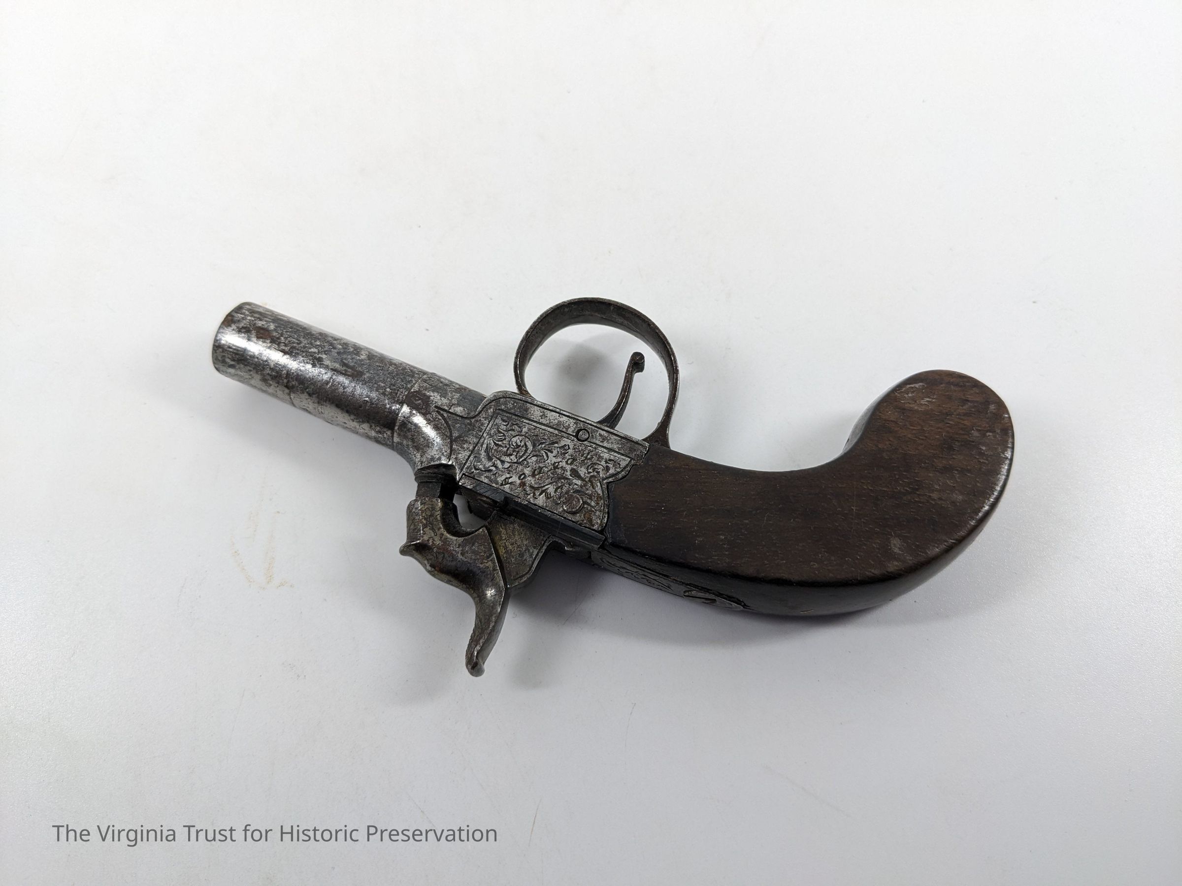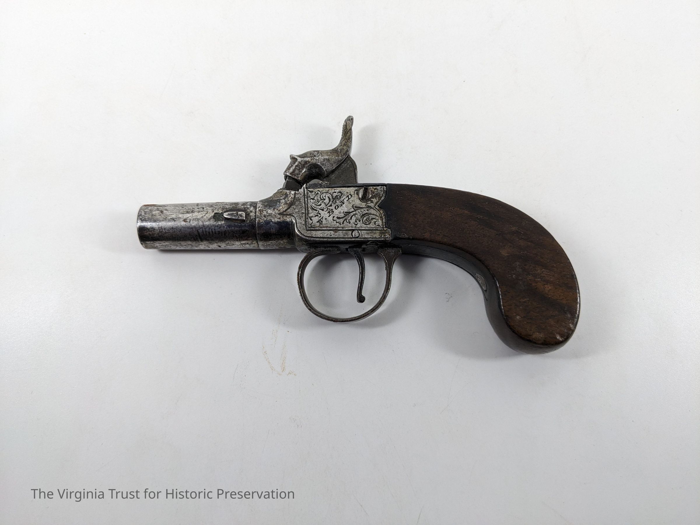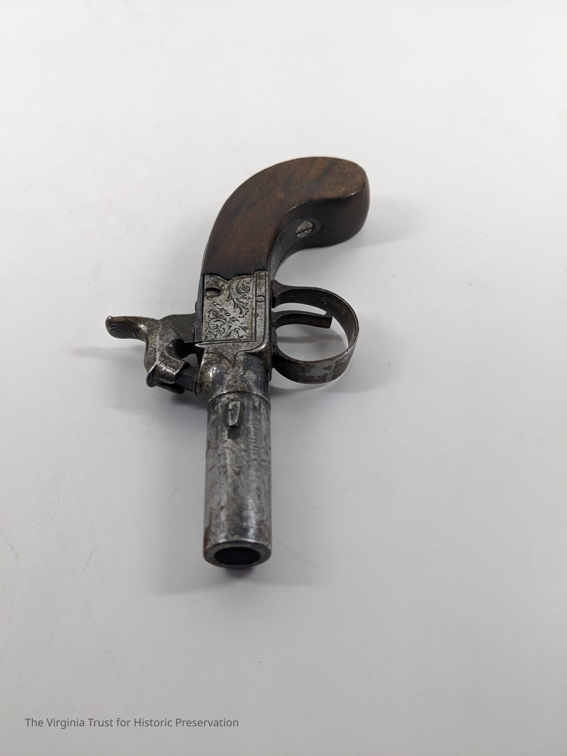Early 19th century pocket pistol. Screw off barrel in front of the percussion mechanism. The mechanism has foliate engraved sides. Trigger guard engraved with a radiating star motif. Walnut stock. Mechanism engraved "W BOND, London".