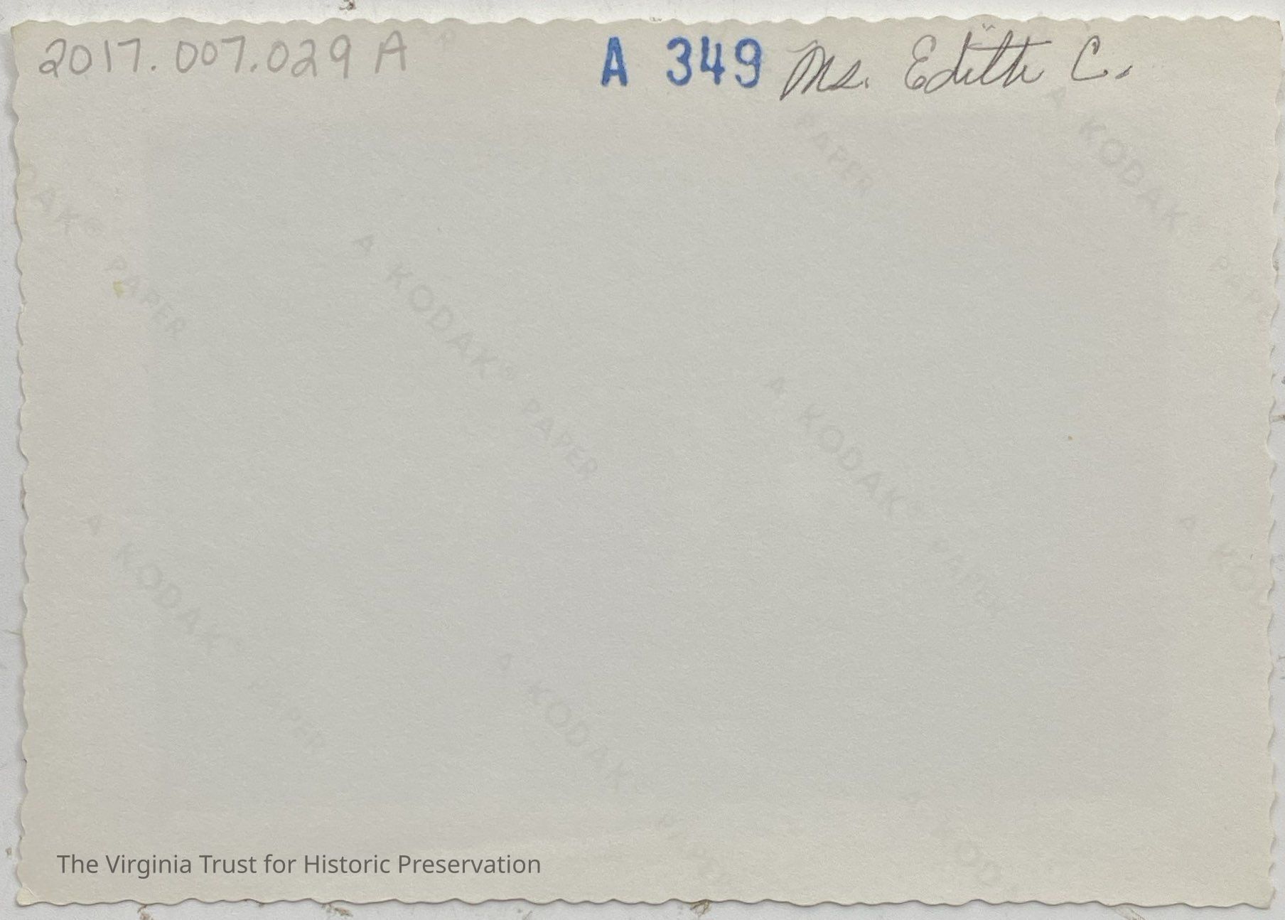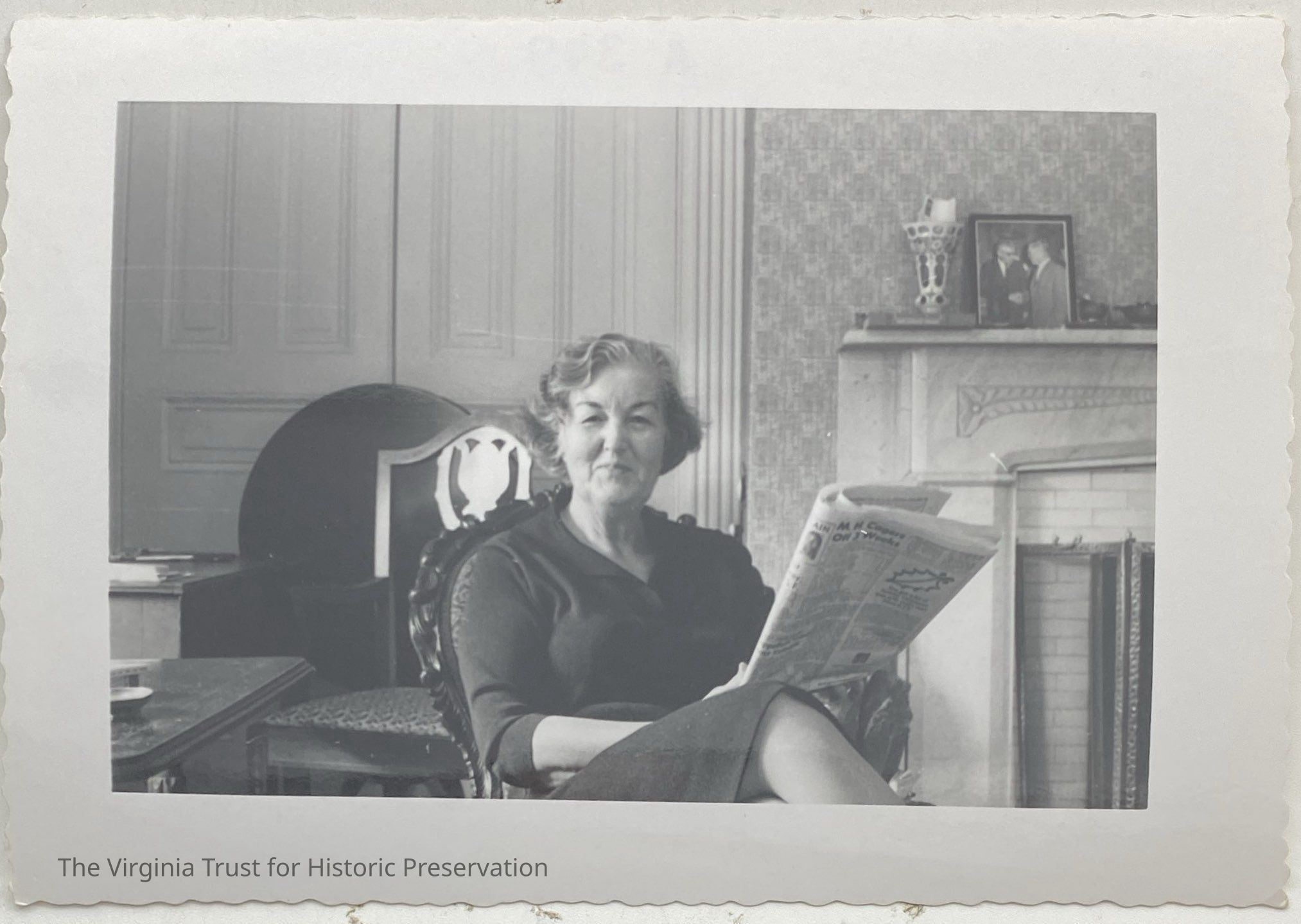 Black and white photograph of a woman (Ms. Edith C. according to back of picture) sitting in a chair and holding a newspaper in the South Parlor of the Lee-Fendall House. Chairs, a door, and a mantle in the background. White border, scalloped edges.