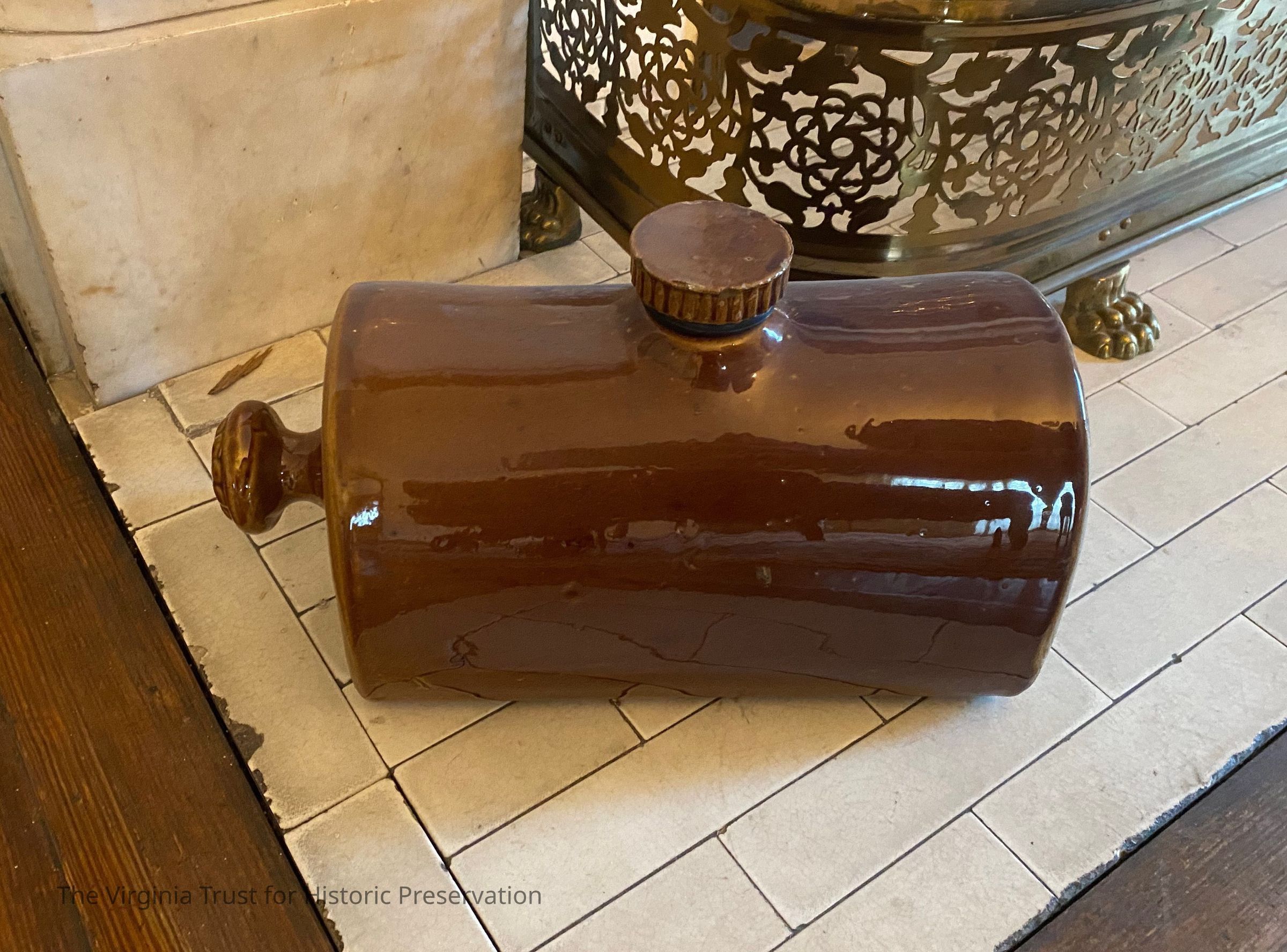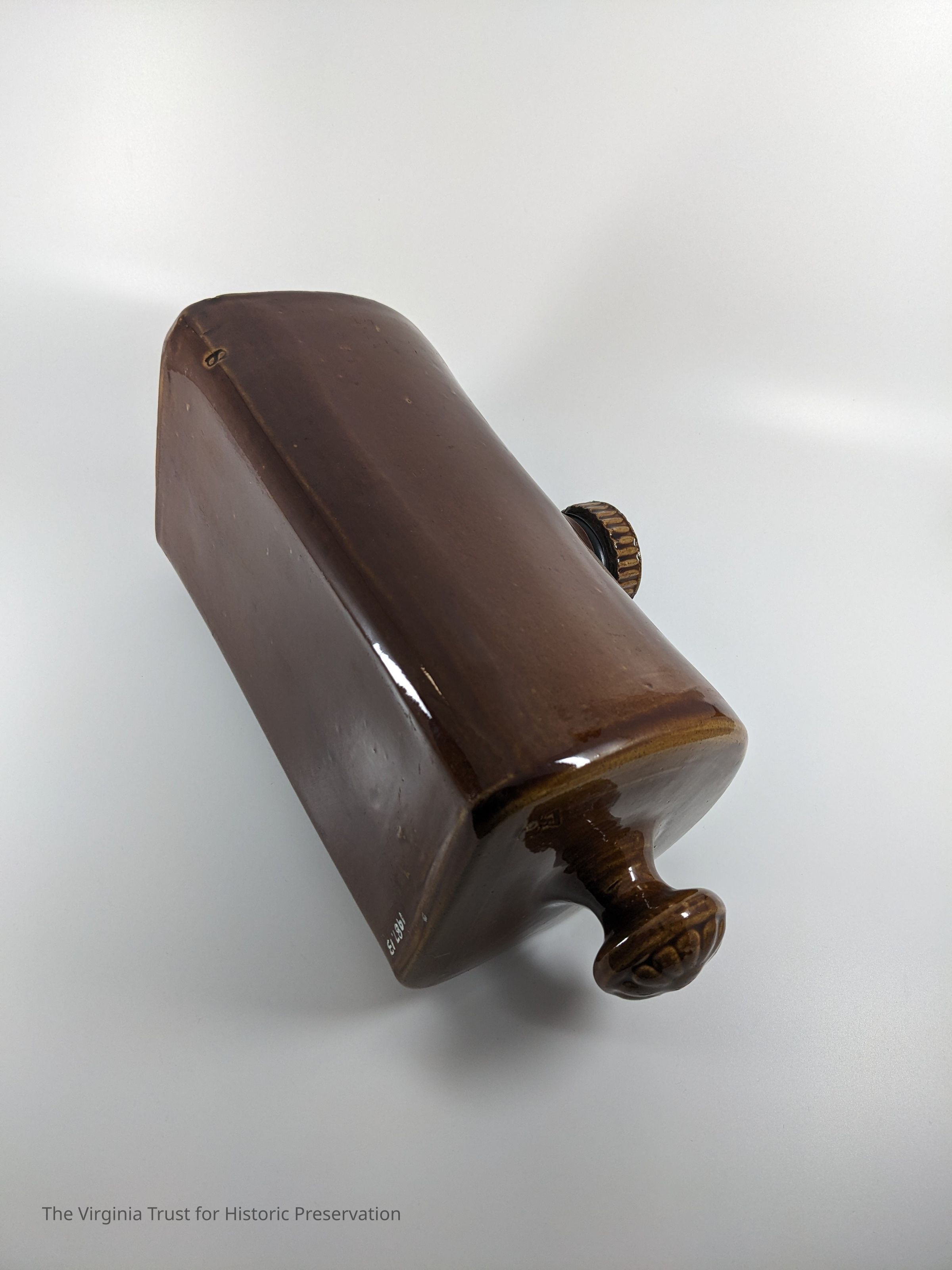 Ceramic foot warmer. Rockingham glaze pottery, mid-to-late 1800s, possibly made in Bennington, VT. Heavy dark rust glaze; molded handle on end and ceramic screw in cap.Dimensions
