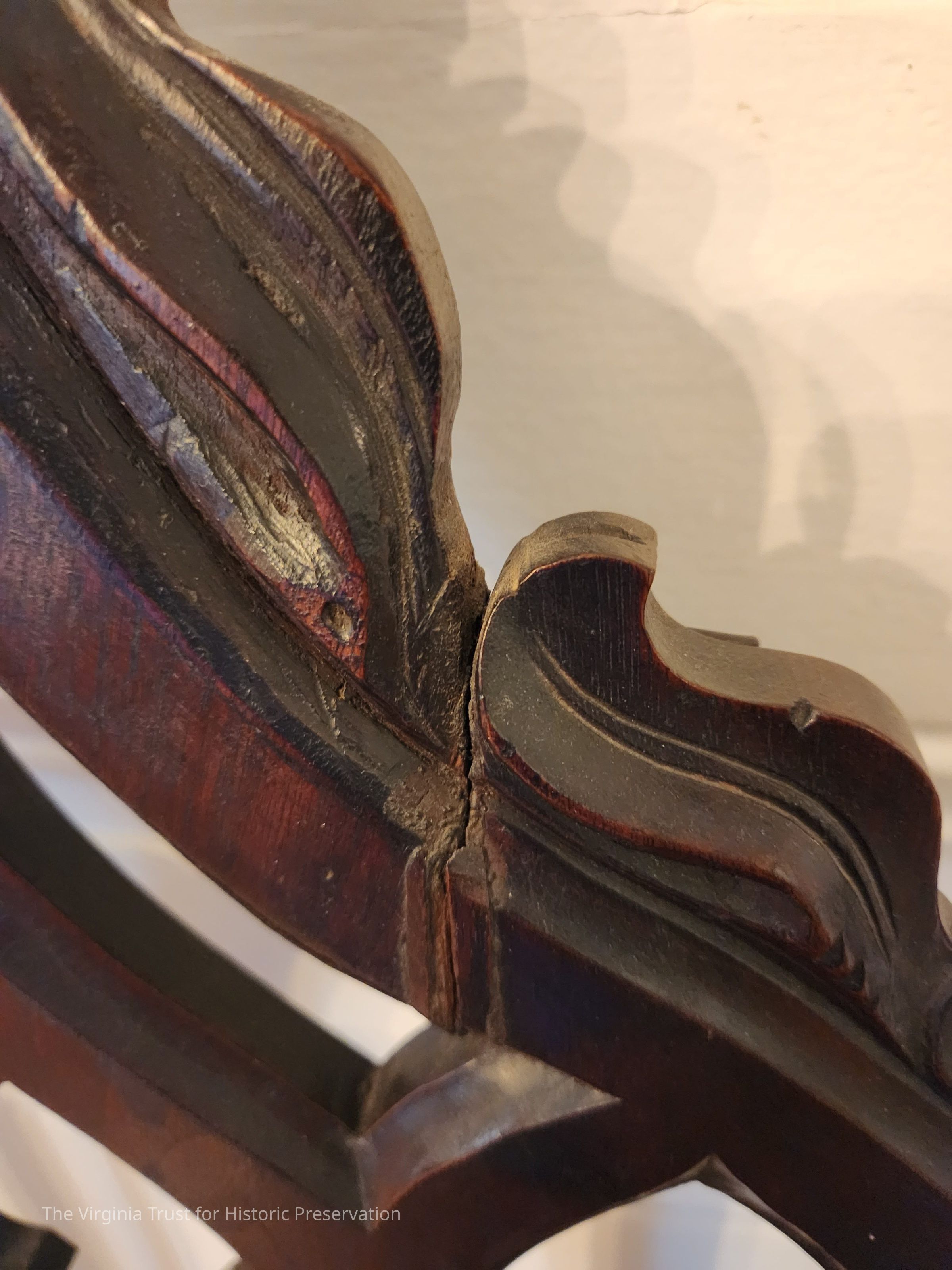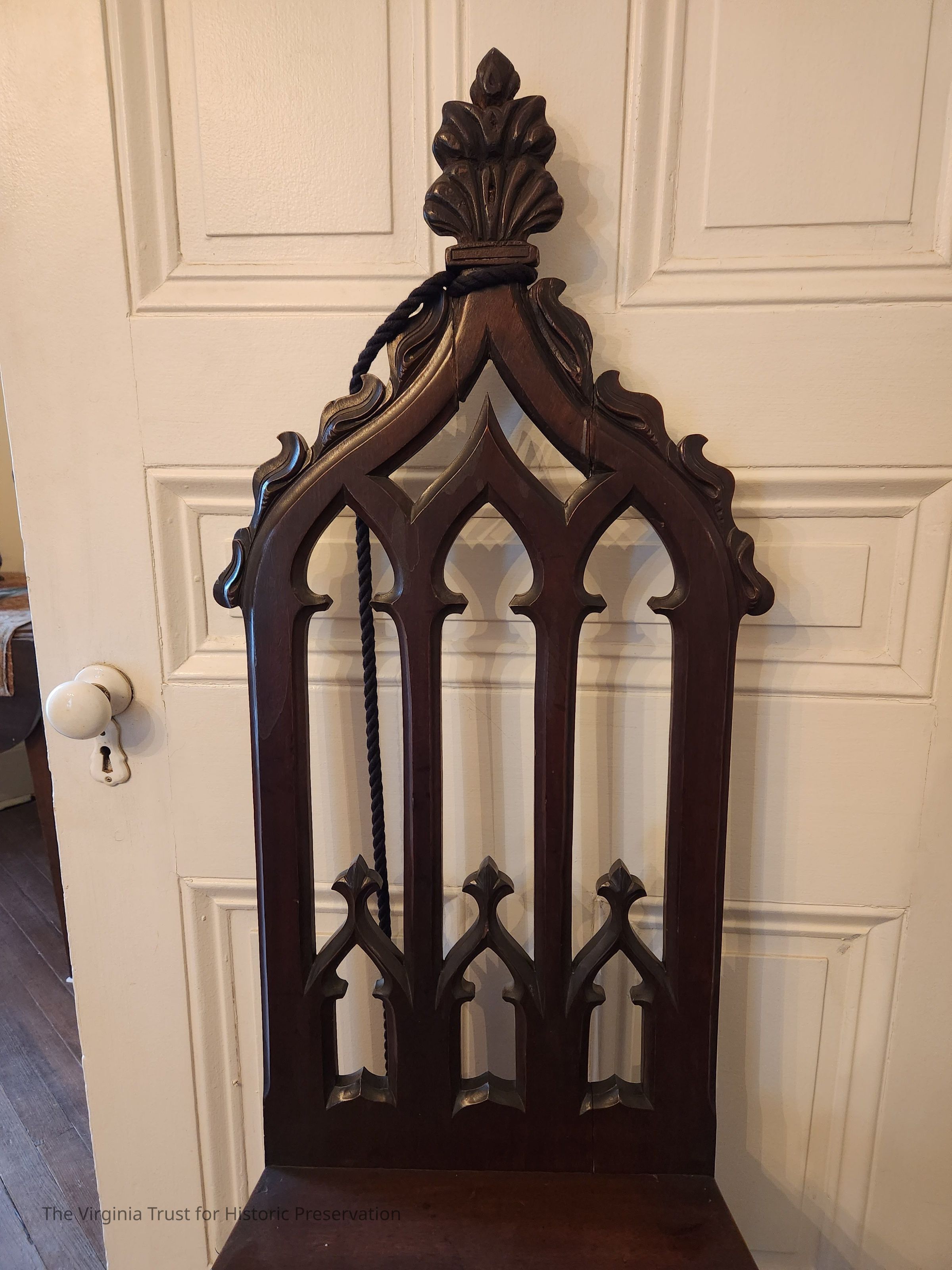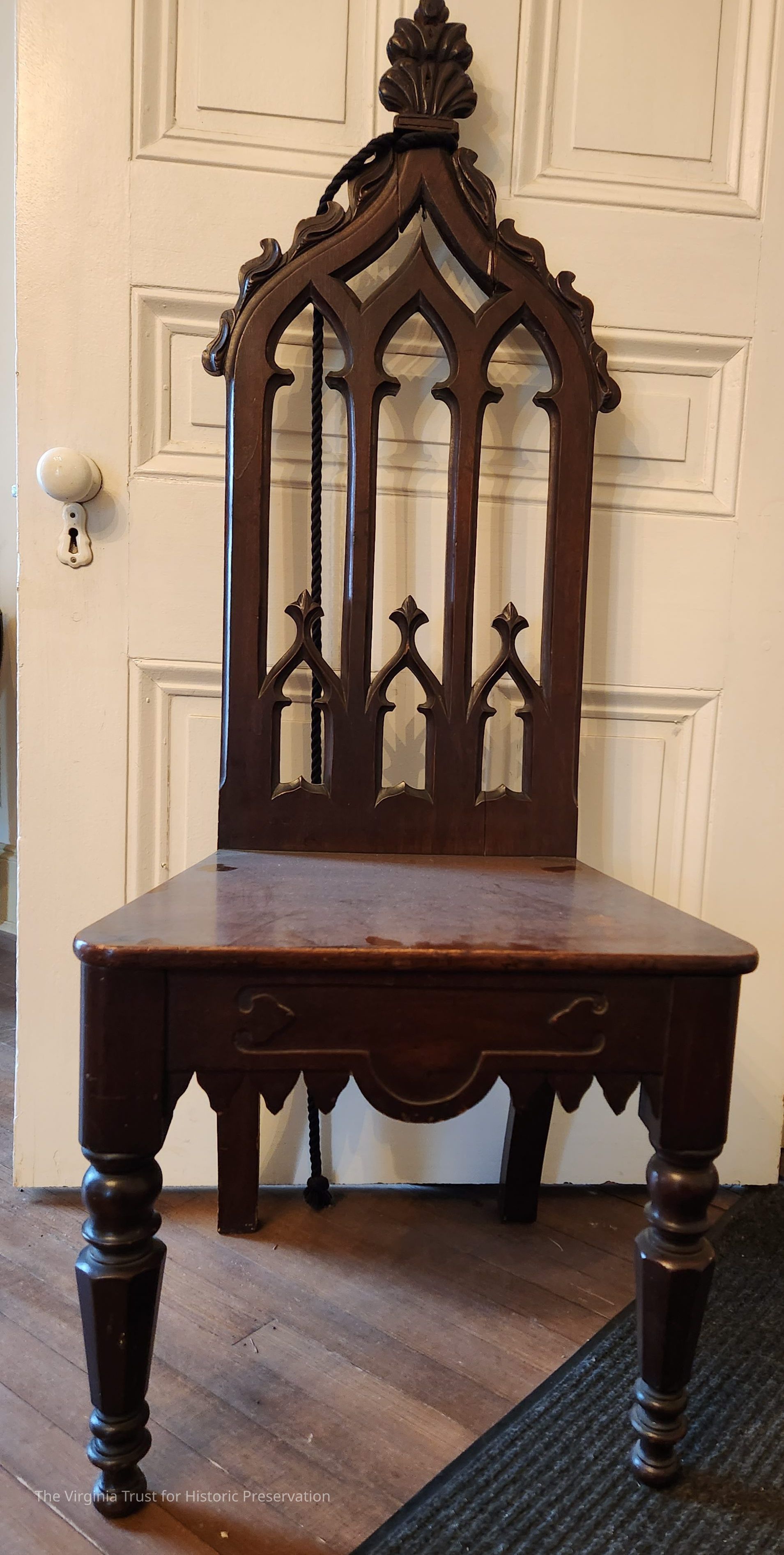 One of a pair of hall chairs. Gothic with crockets on the crest, Gothic arches on the back and crenelations on the skirt. Half round drop on the skirt with angular designs. Manufactured by the Green Steam Furniture Factory, Alexandria, VA. Pencilled "G" on the bottom of the seat.Dimensions
