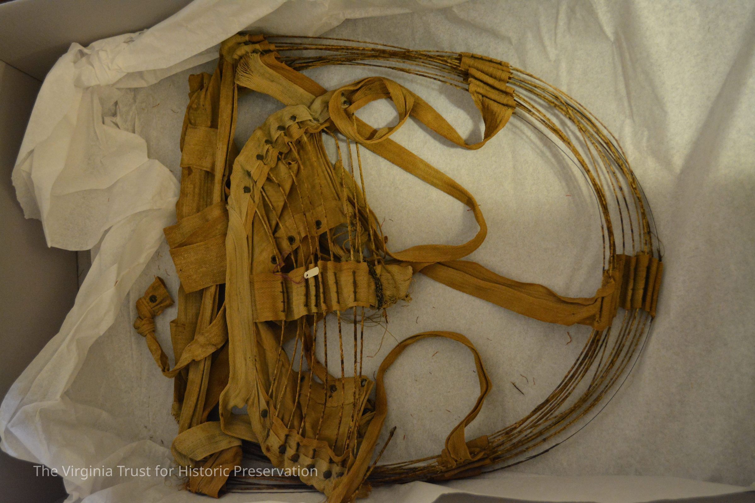 Wire bustle with cloth ribbons. Metal wires have woven fabric covering.