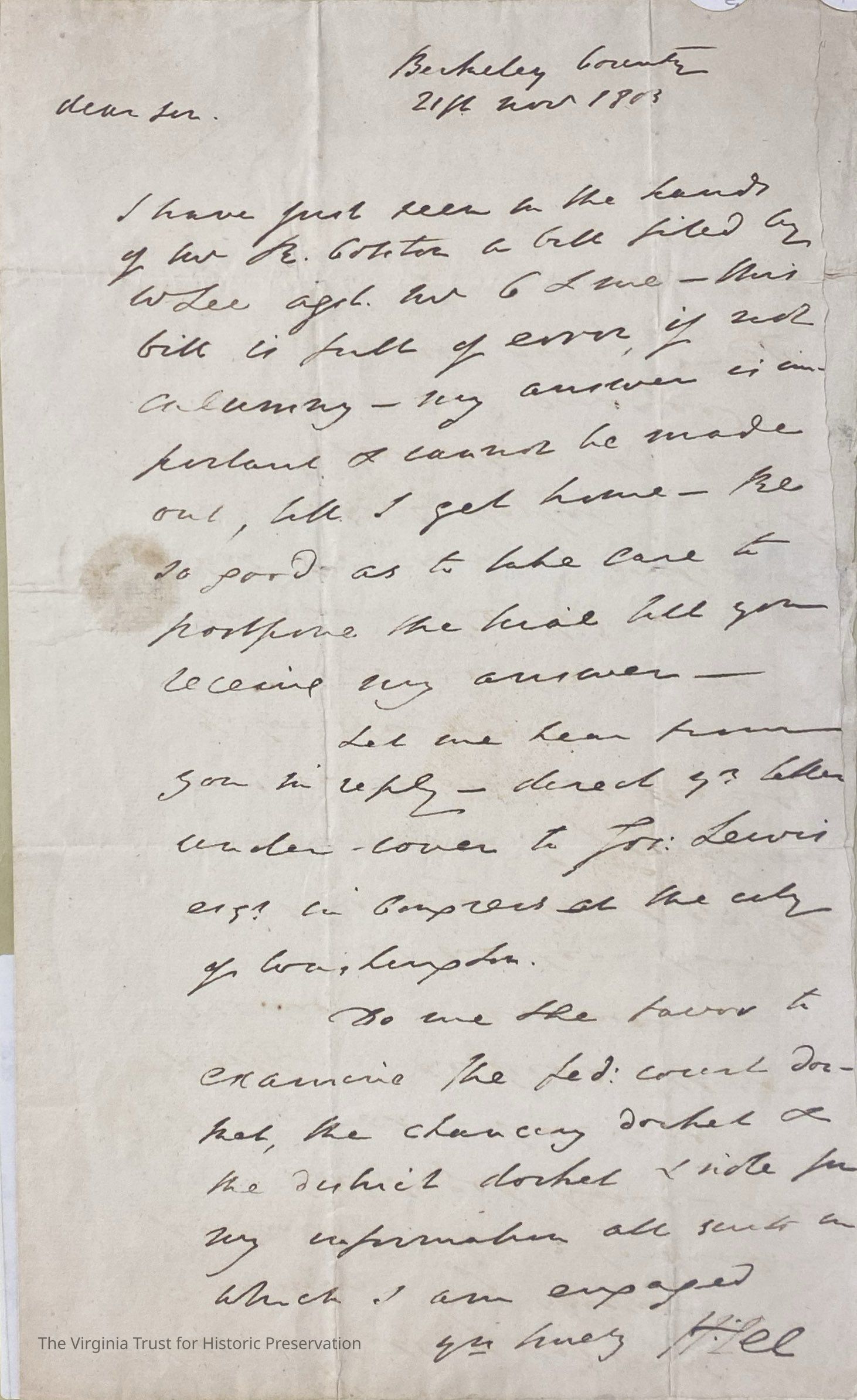 Letter from Henry Lee to an attorney in Richmond concerning debt