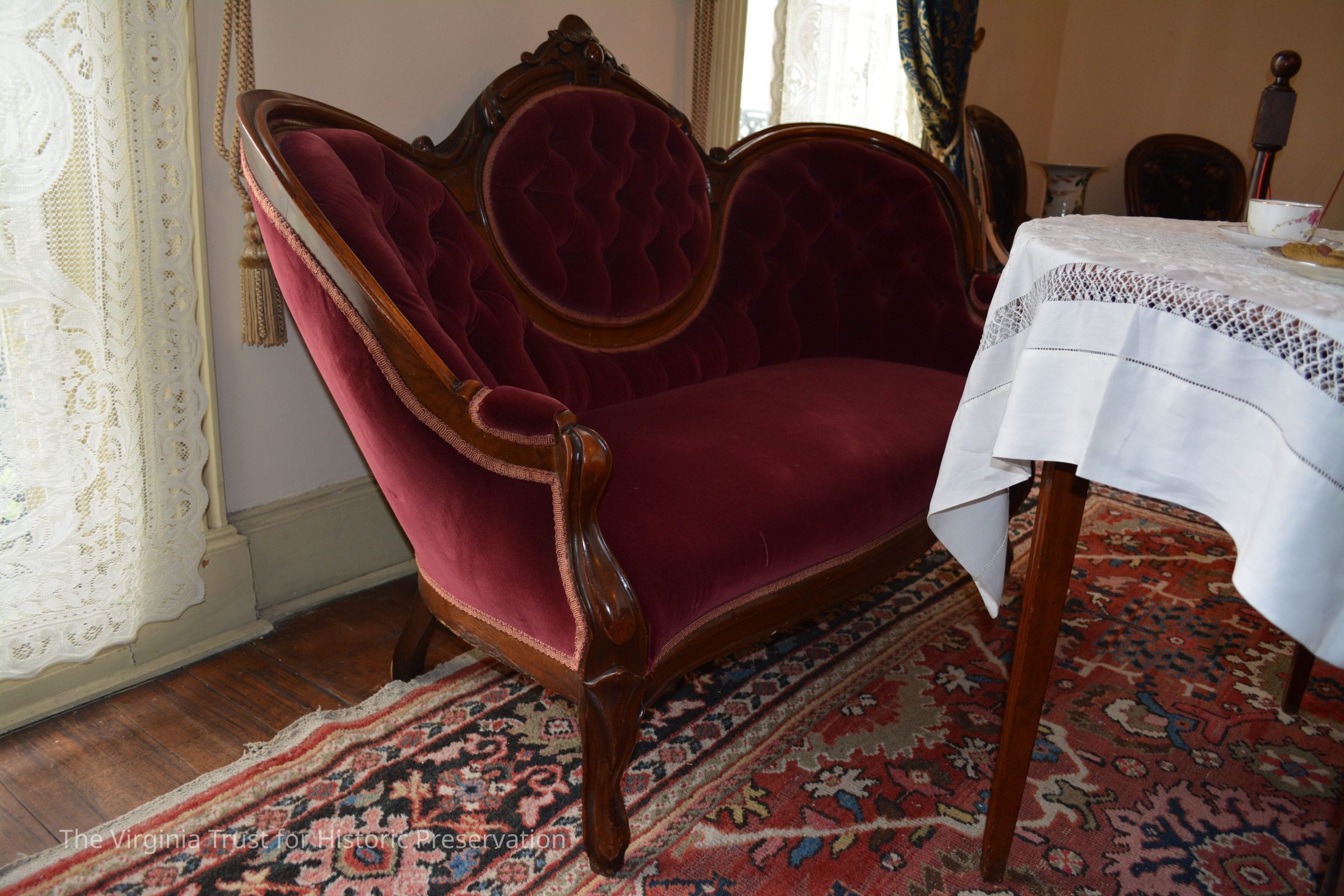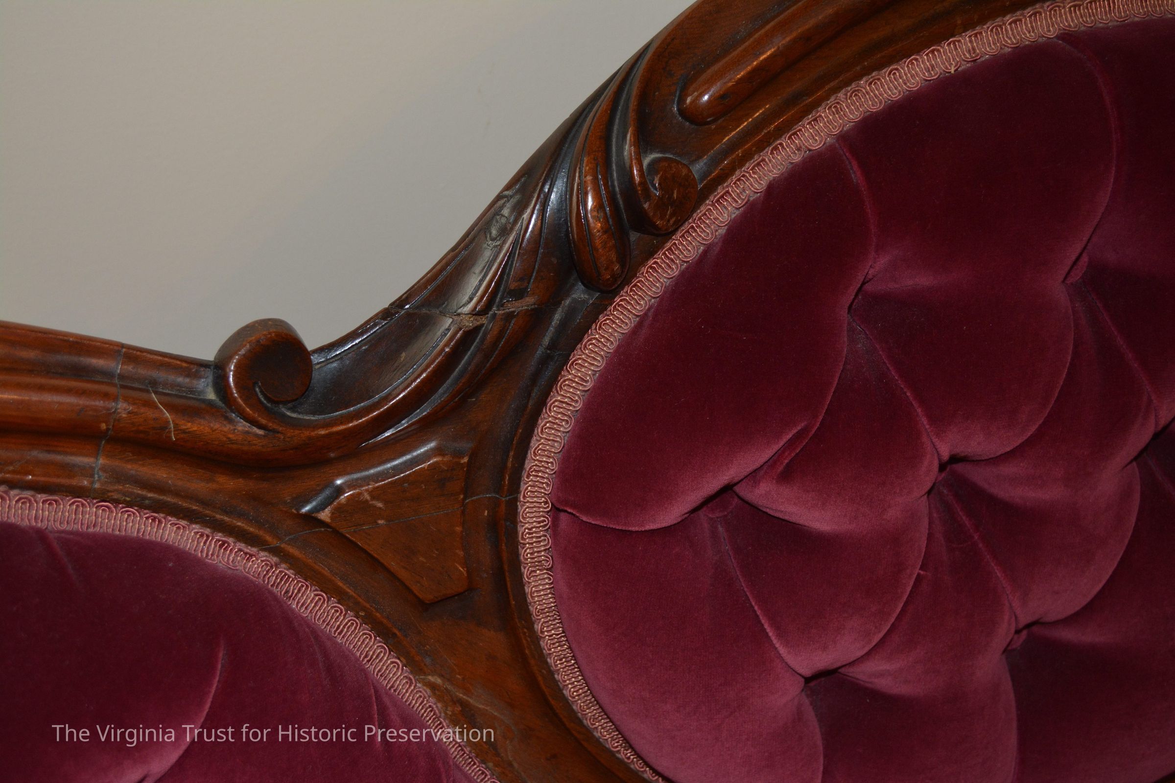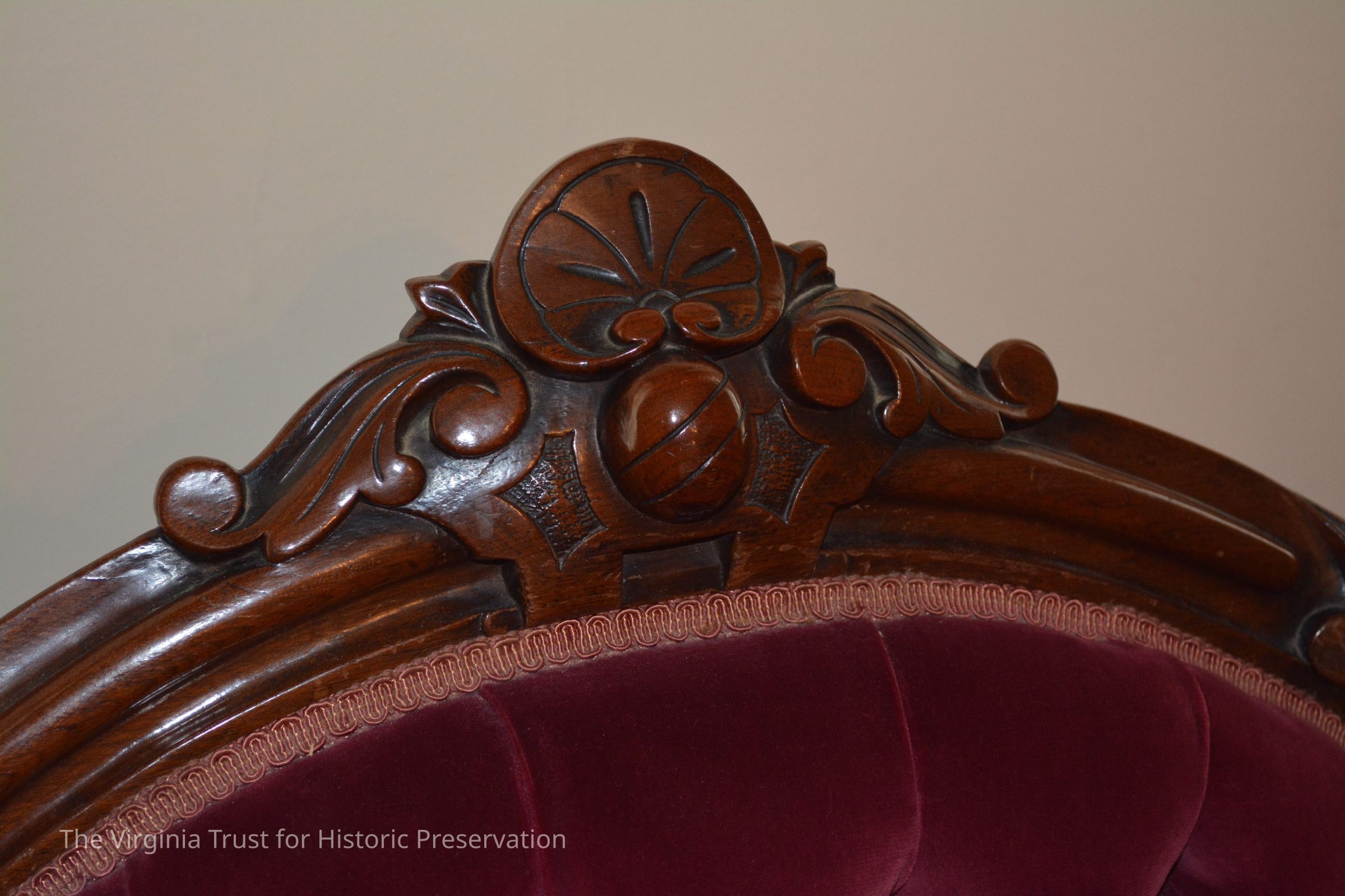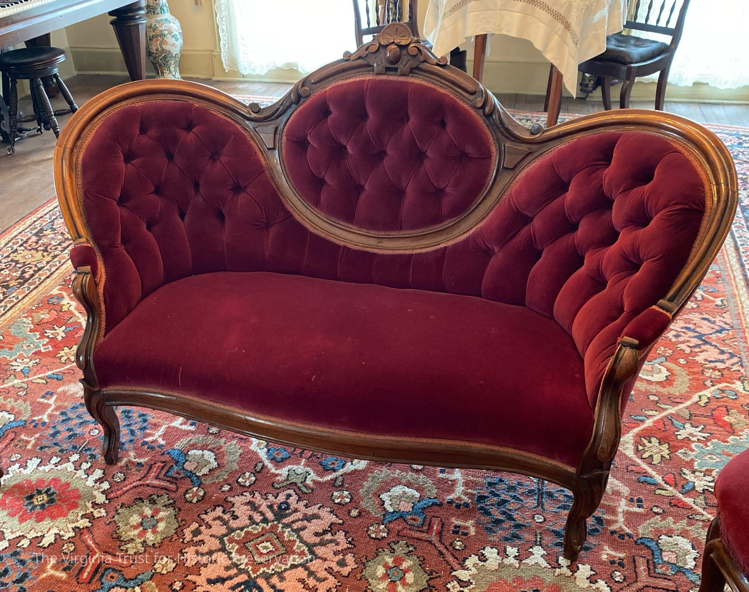 One piece of a Victorian parlor set that includes his and her chairs and a loveseat. Original upholstery was black horse hair. Each piece of the parlor set was reupholsterd in the 1970s to the cranberry velvet still present.Dimensions