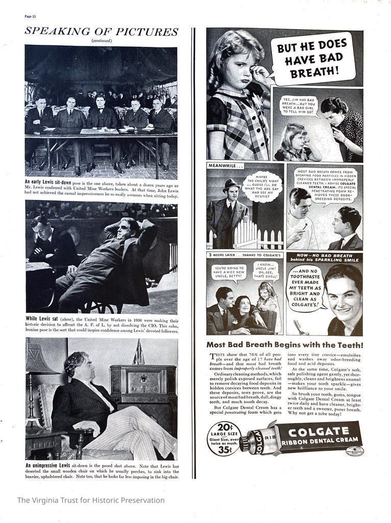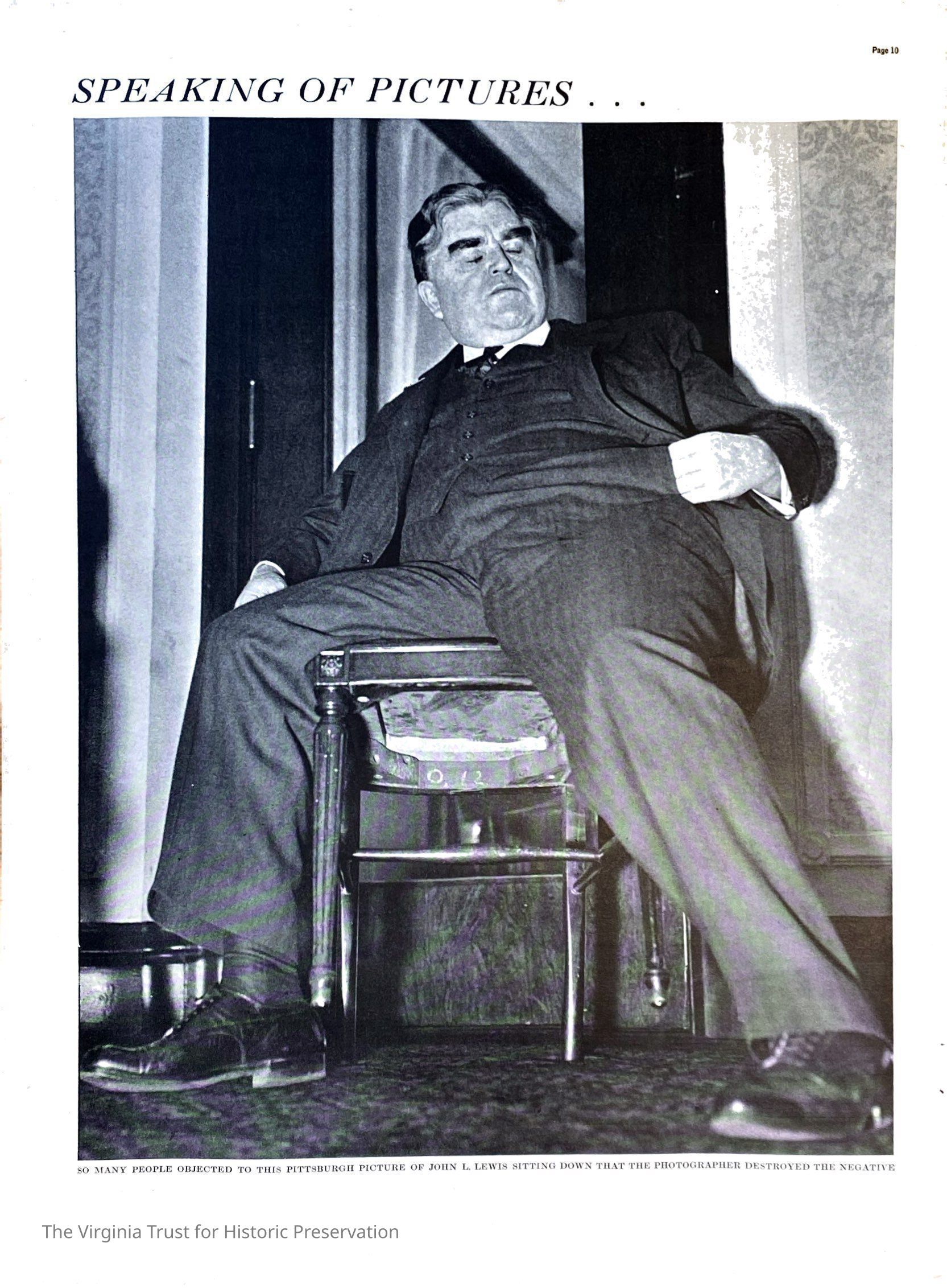 1937 issue of Fortune Magazine. Article on John L. Lewis titled "...John Lewis Sits Down". Short article with four photos regarding John L. Lewis sitting, which is his "signature pose". Relates to the sit-down strikes he calls for in the labor movement. Pages 9-14 of magazine - Lewis article found on Pages 10, 11, and 13.
