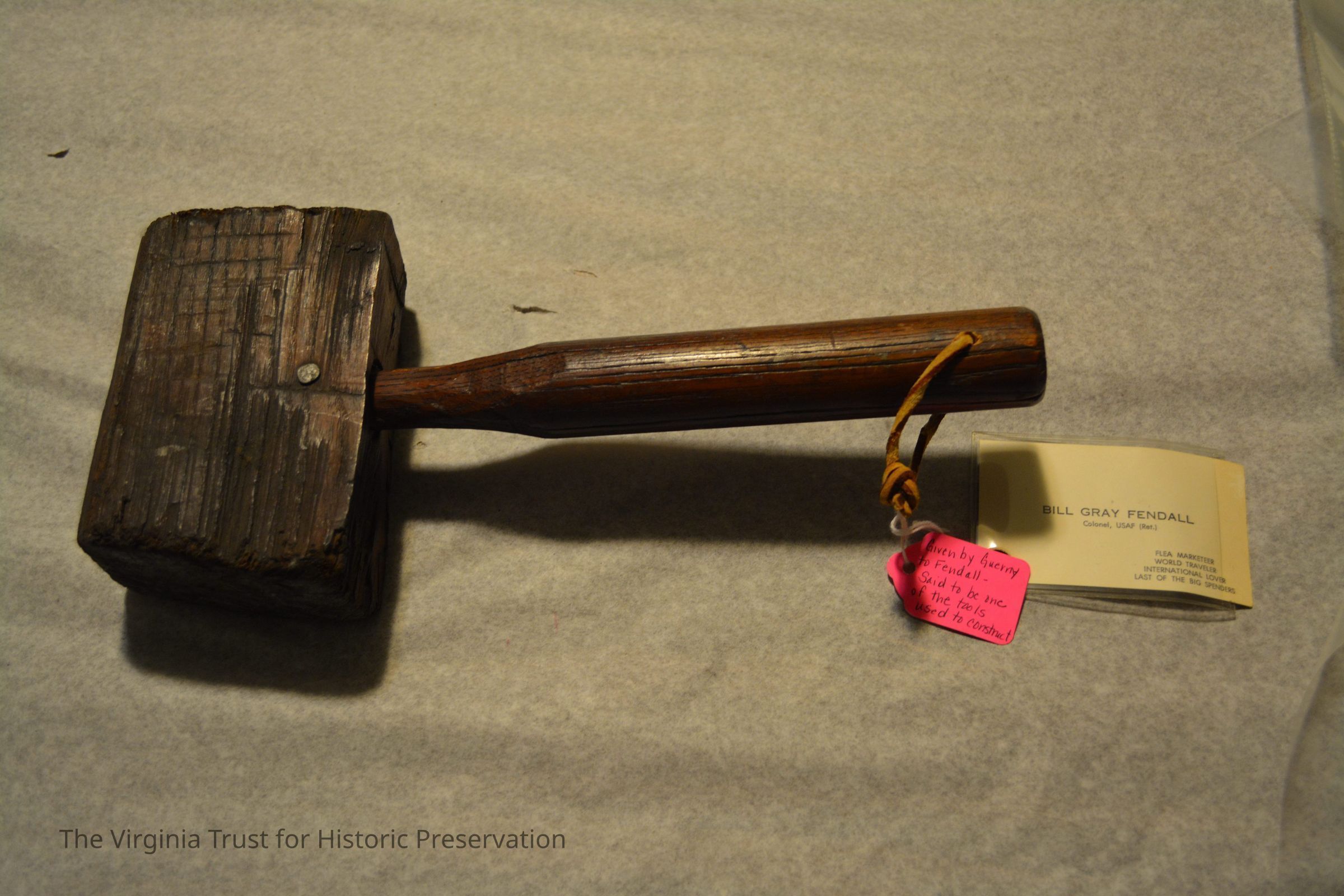 Wooden mallet, possibly used in the construction of the Lee-Fendall House in 1780s. Solid rectangular block of wood attached to a rounded handle. Gifted by Gene Guerney to Bill Fendall.Dimensions