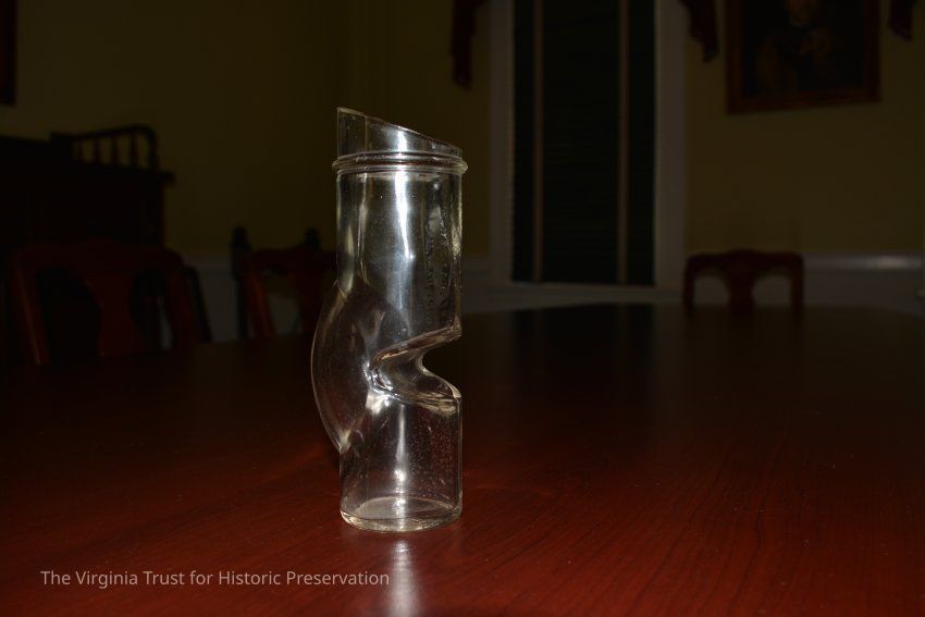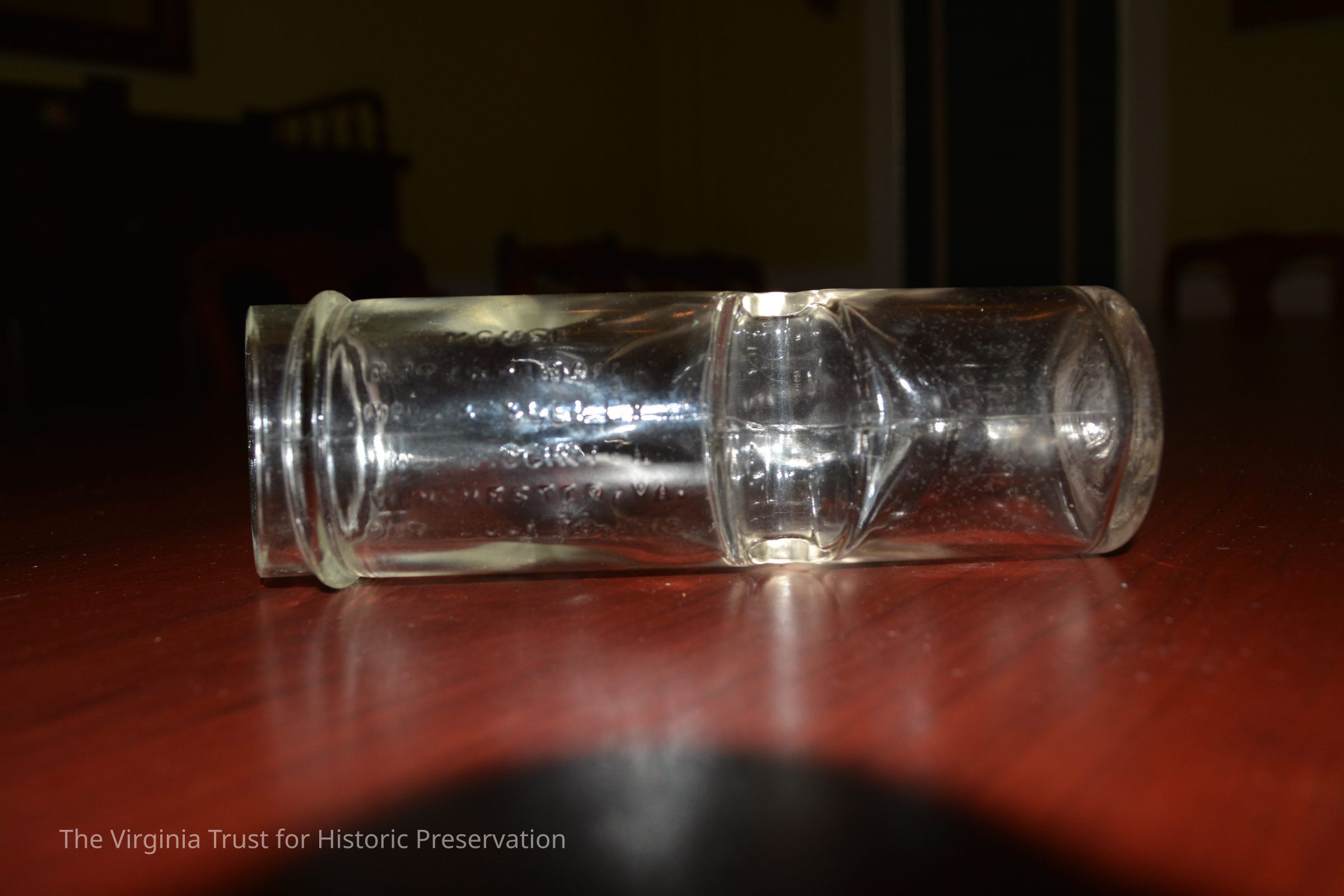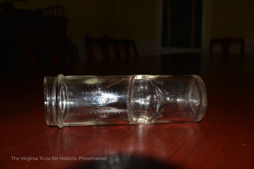 Glass mousetrap with single entrance. Reads "Mouse exterminator. MFG and sold by N. J. Wigginton. Winchester, VA. PAT. July 30, 1918." Missing a wire stand that would have held it in place horizontally on the ground. The dip made it so a mouse would be unable to turn around and escape once it had climbed over. Unclear how a person would clean the trap/remove mouse once captured.