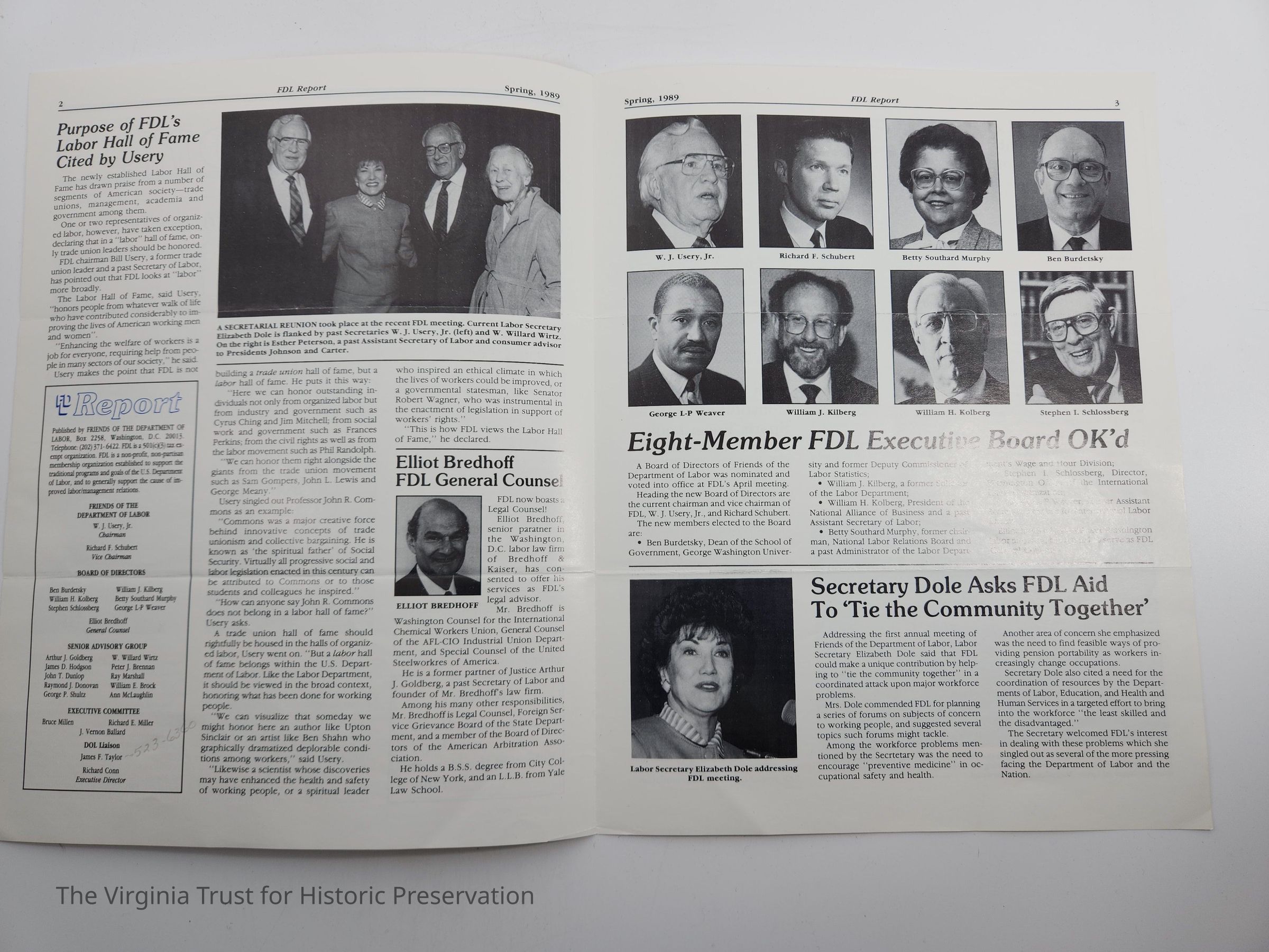 The newsletter is titled "Report." It is the Spring 1989 issue, No. 4. Front page article is titled "New Labor Hall of Fame Honorees Named" and is accompanied with the pictures of John L. Lewis, George Meany, James P. Mitchell, and A. Philip Randolph.