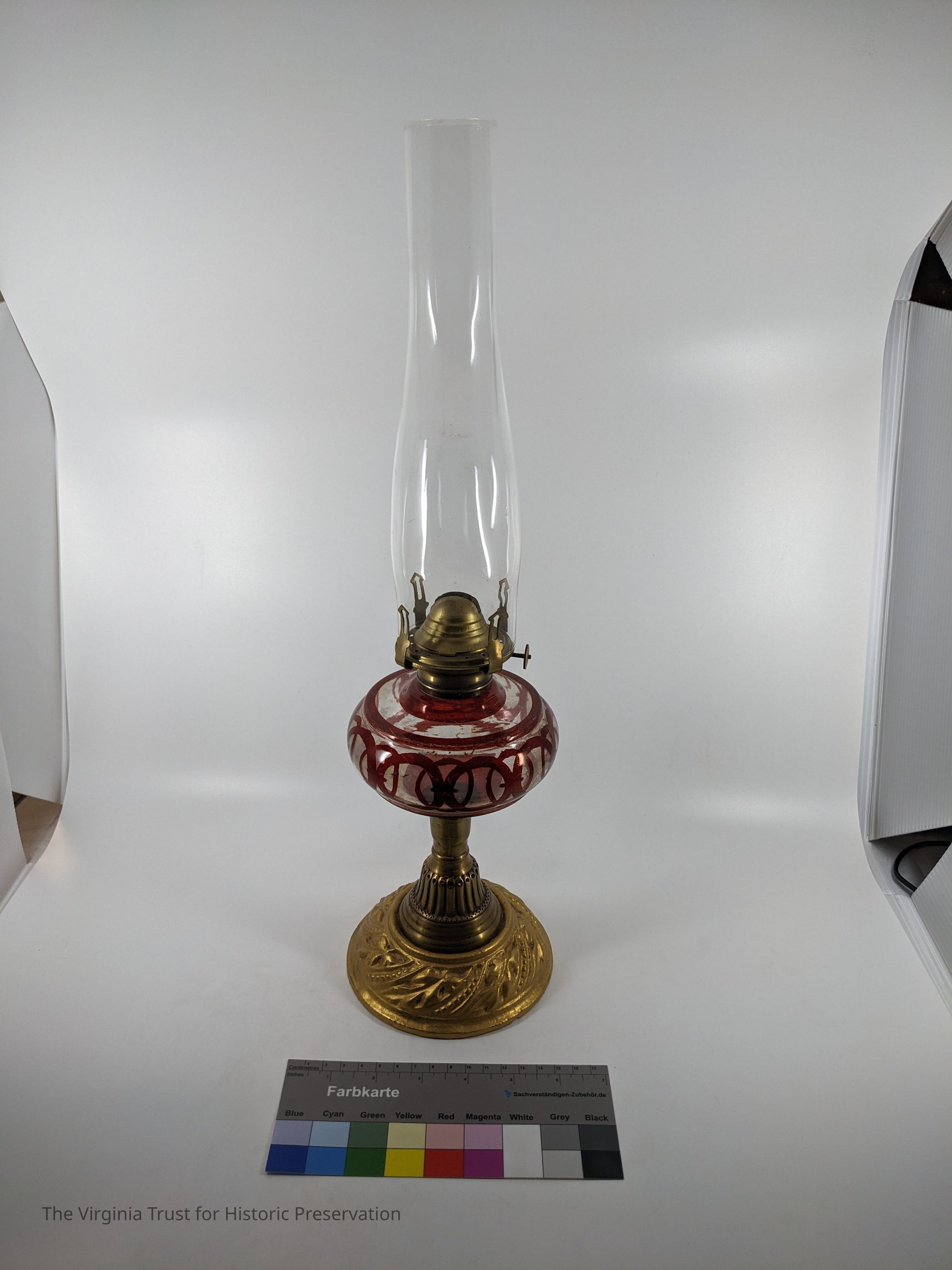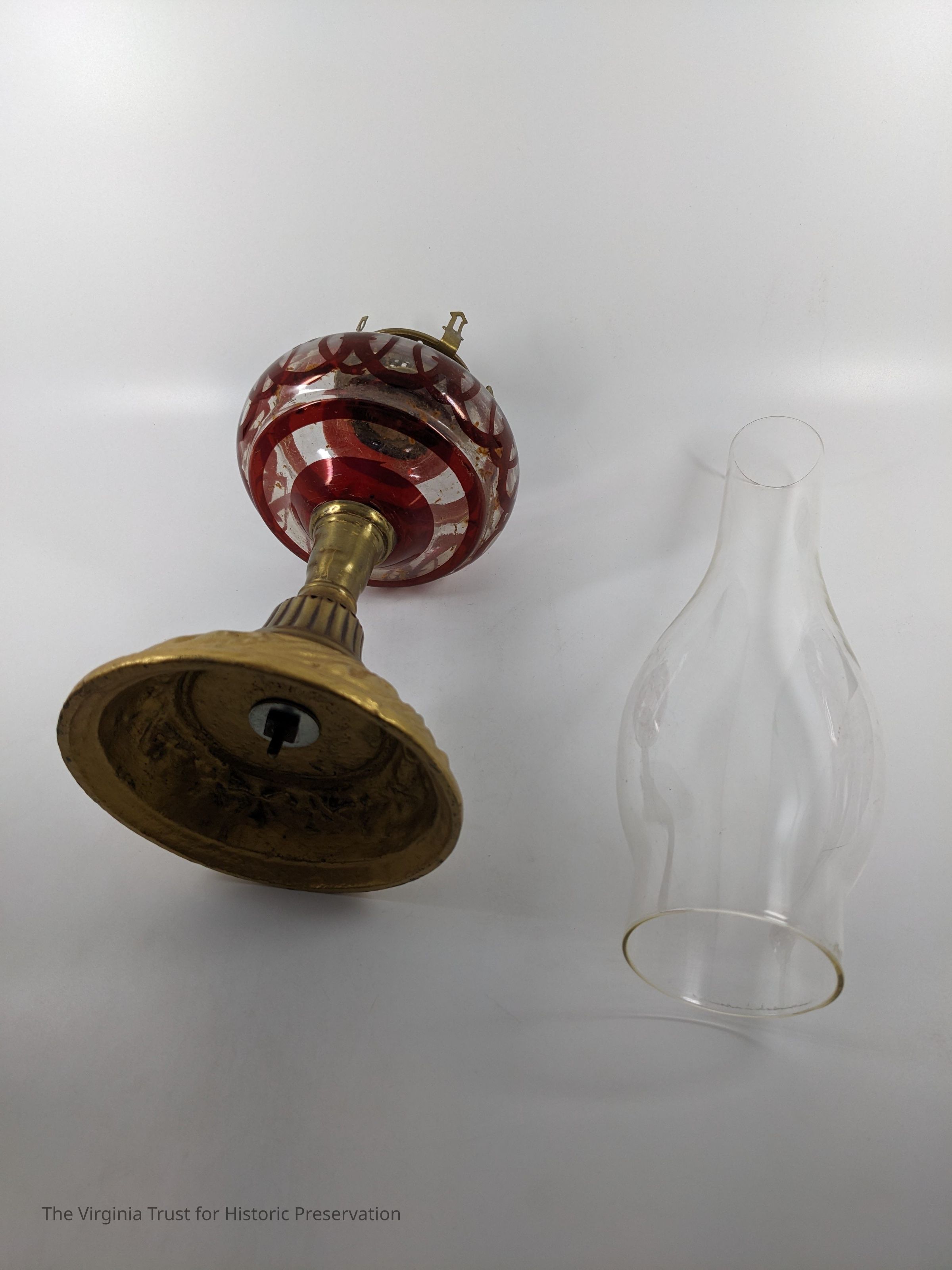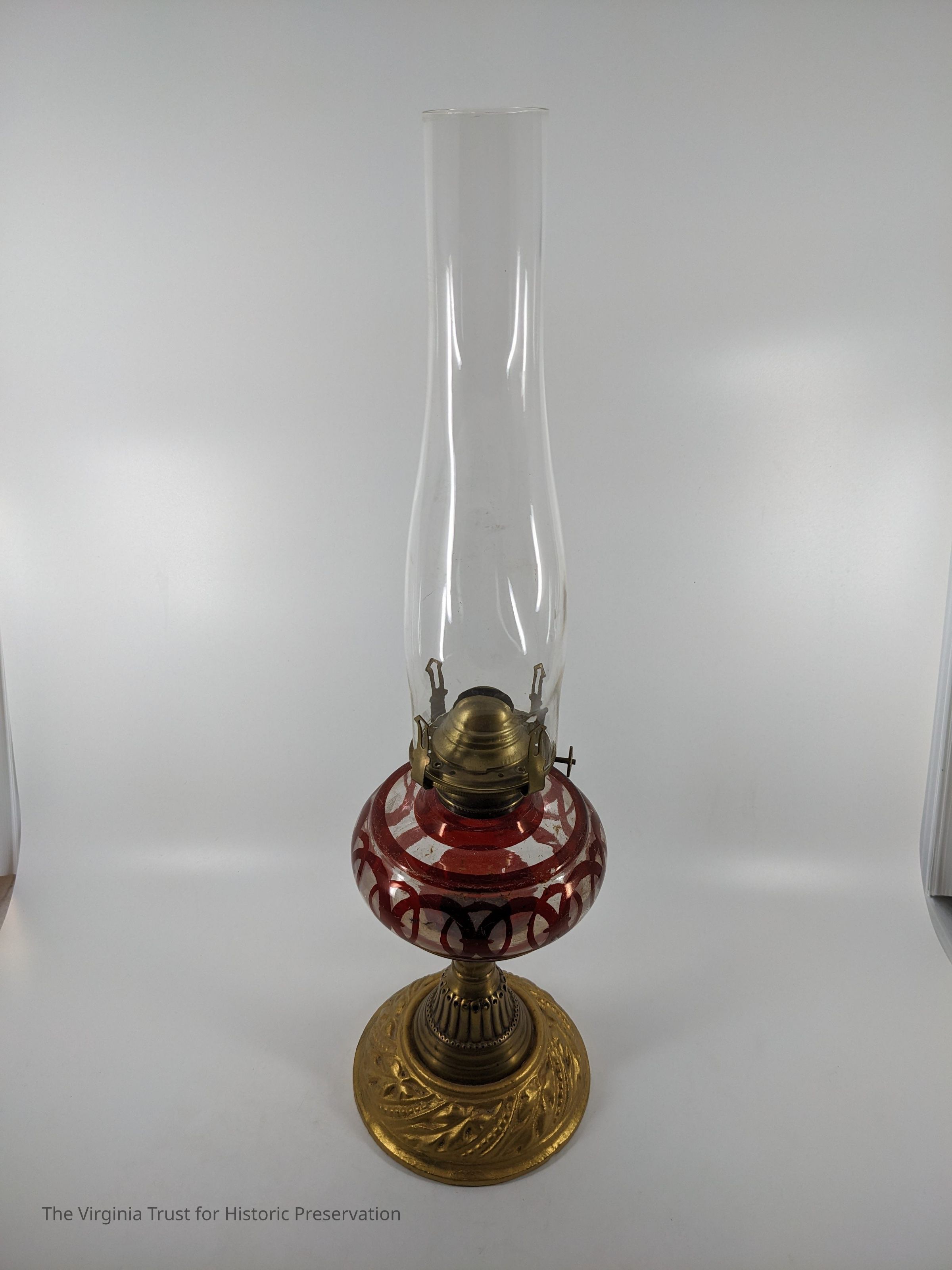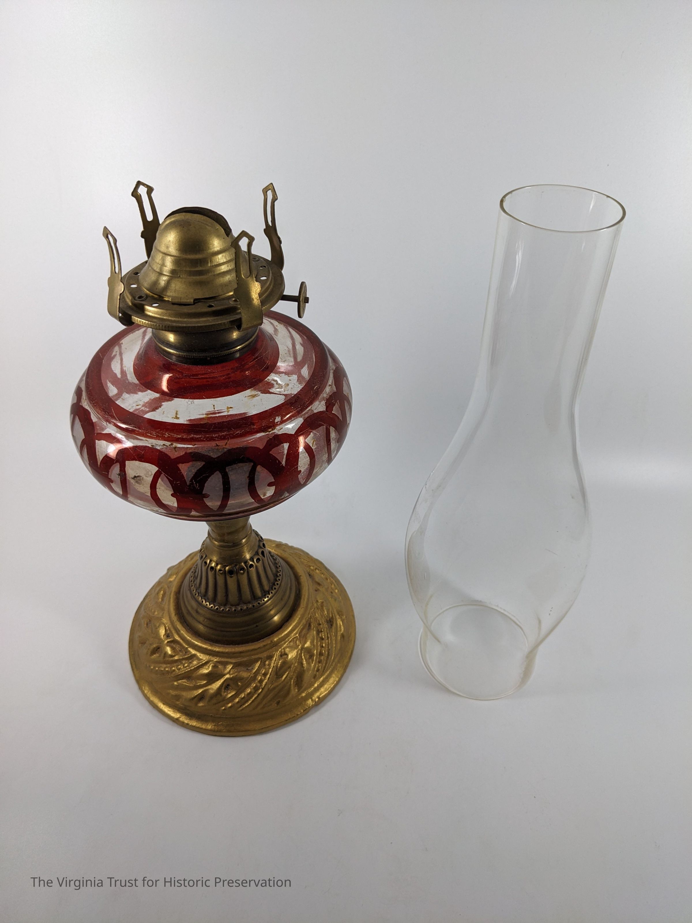 1880 glass oil lamp. Glass body has a brown-red circular design. Glass chimney with brass burner and base. Wick is missing.