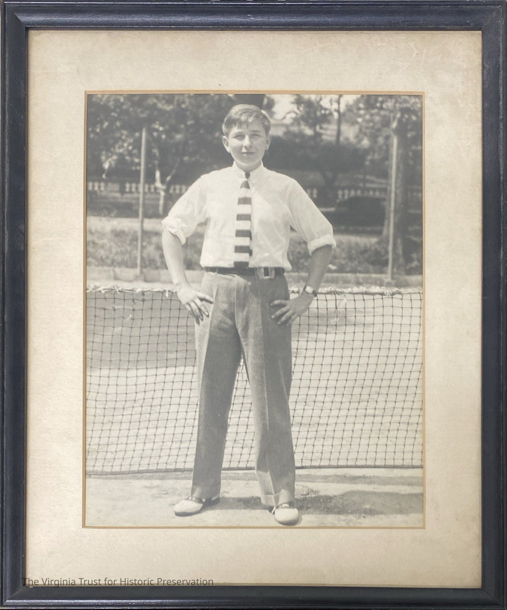 Framed photograph of John L. Lewis, Jr. at school. Lewis, Jr. stands in front of a tennis net, park behind him. Stands with hands on hips. Wears white shirt, striped tie, and gray pants.Dimensions