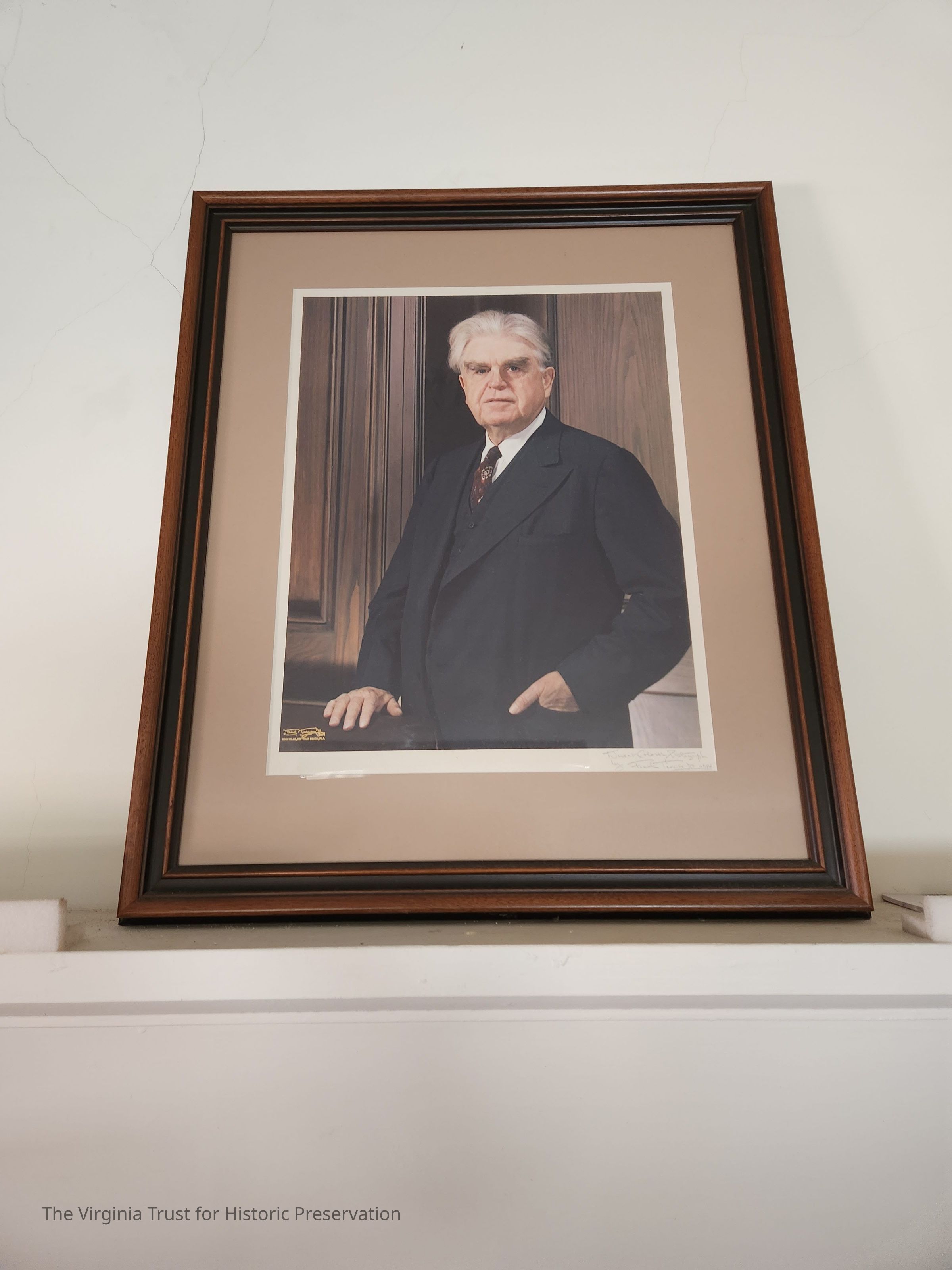 Colored photograph portrait of John L. Lewis. Lewis is standing with his left hand in his pocket and right hand on a table. Wears a black suit with red tie. Older Lewis (grey hair). Matted and framed.Dimensions