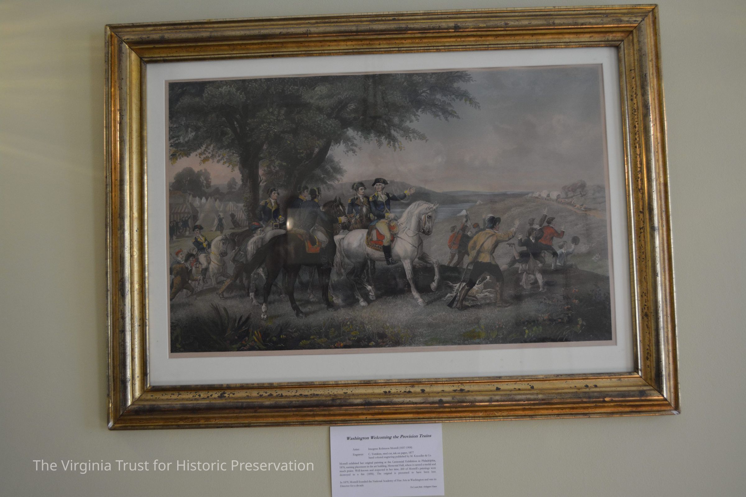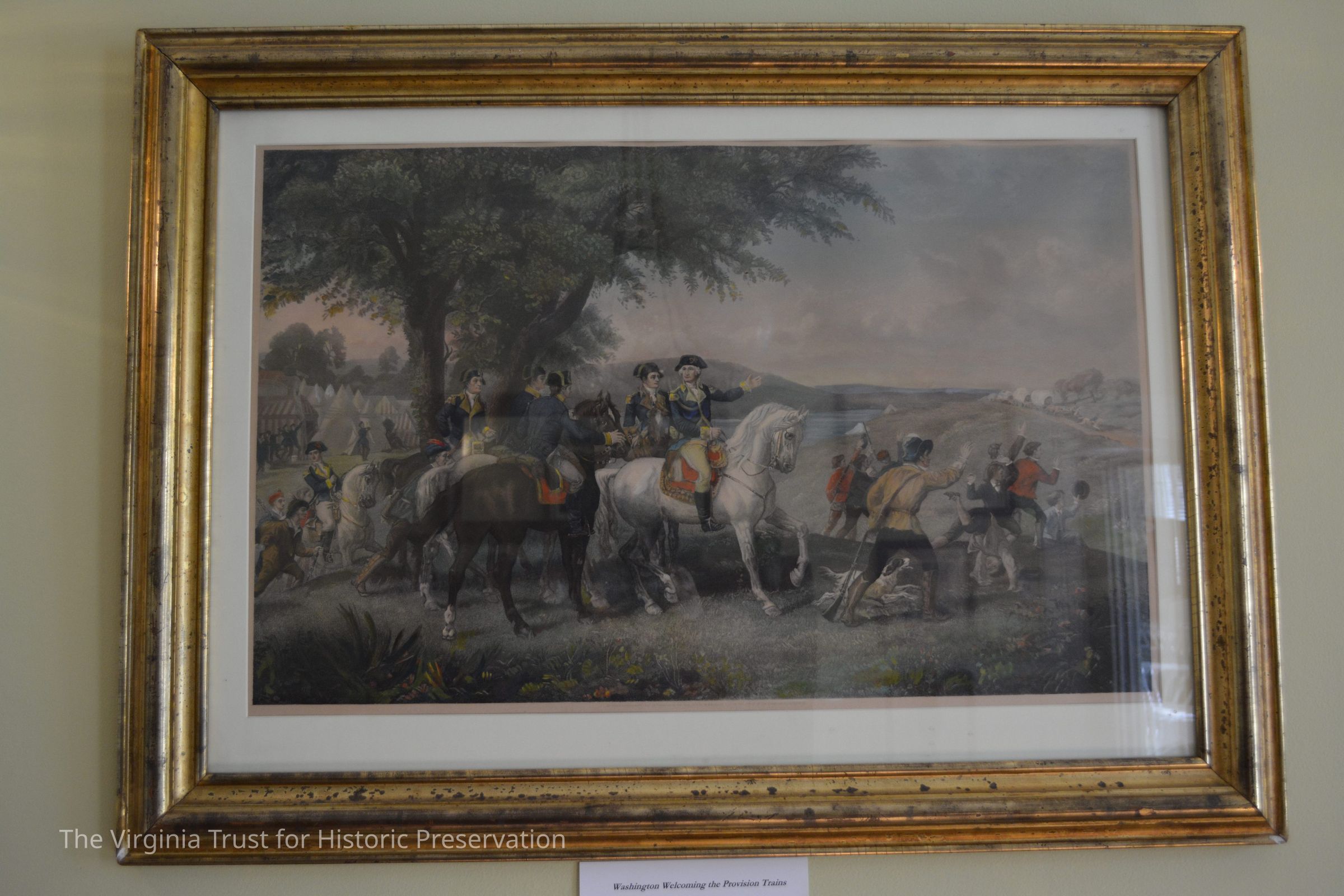 Matted print with antique gold frame. Two titles have been noted: "Washington Welcoming the Provision Trains" and "Arrival of the Supply Tain at Valley Forge". Possibly in Newburgh, New York. Text towards the bottom of print reads: "Entered According to Act of Congress in the year 1877. By M. Knoedler & Co. in the office of the Librarian of Washington."Dimensions