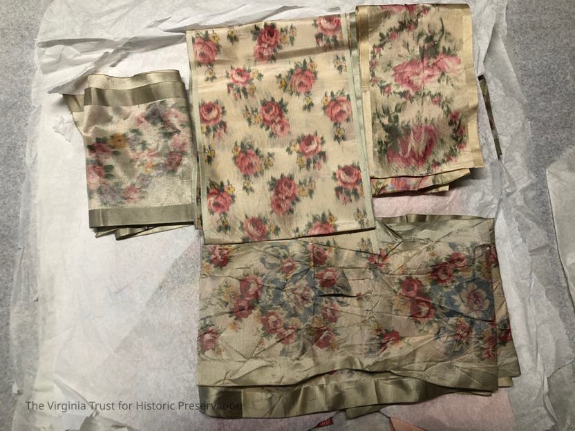 Vaious floral pieces of fabric. About 20 pieces in total, all different sizes. All silk, some pieces are shattered. Most likely leftover from a dress or sewing project.