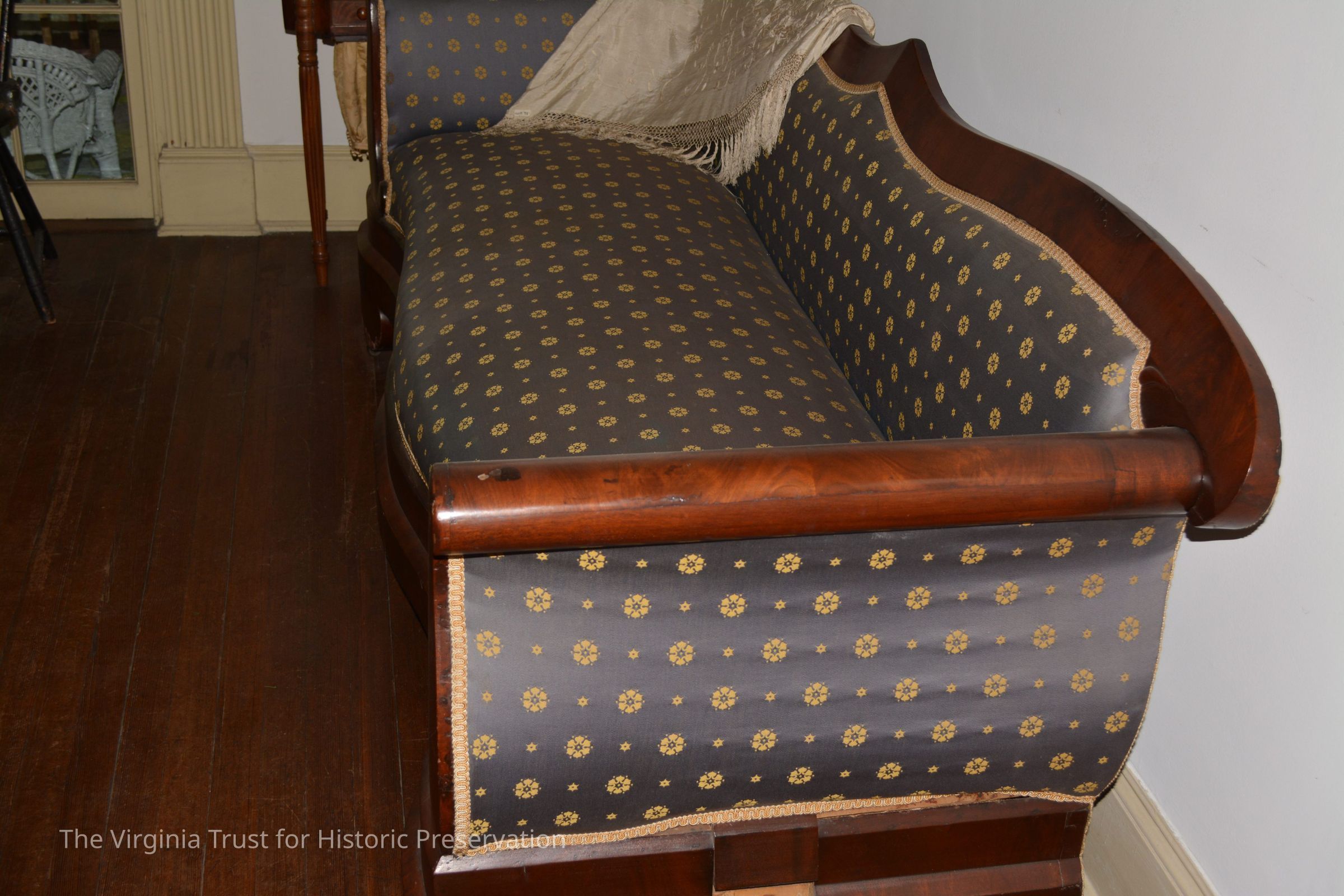 Empire style polished mahogany settee. Blue upholstery (new 4/1976) with gold medallions.