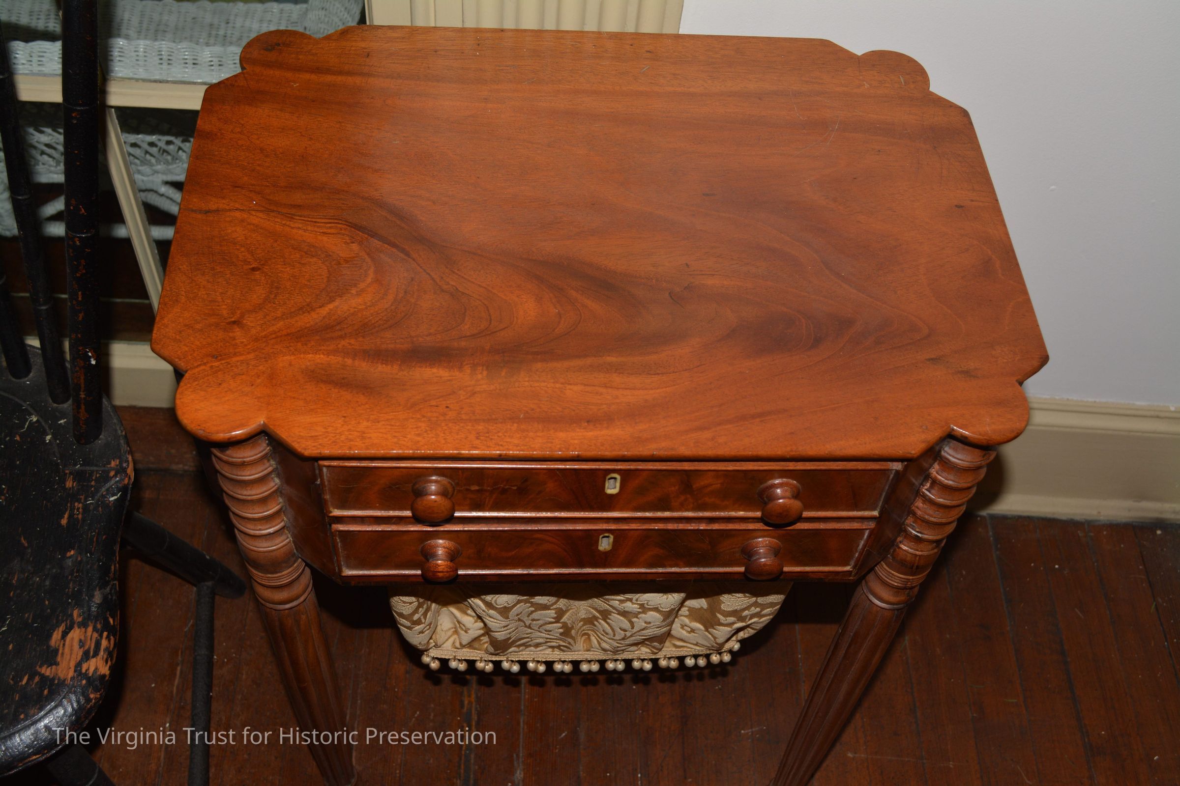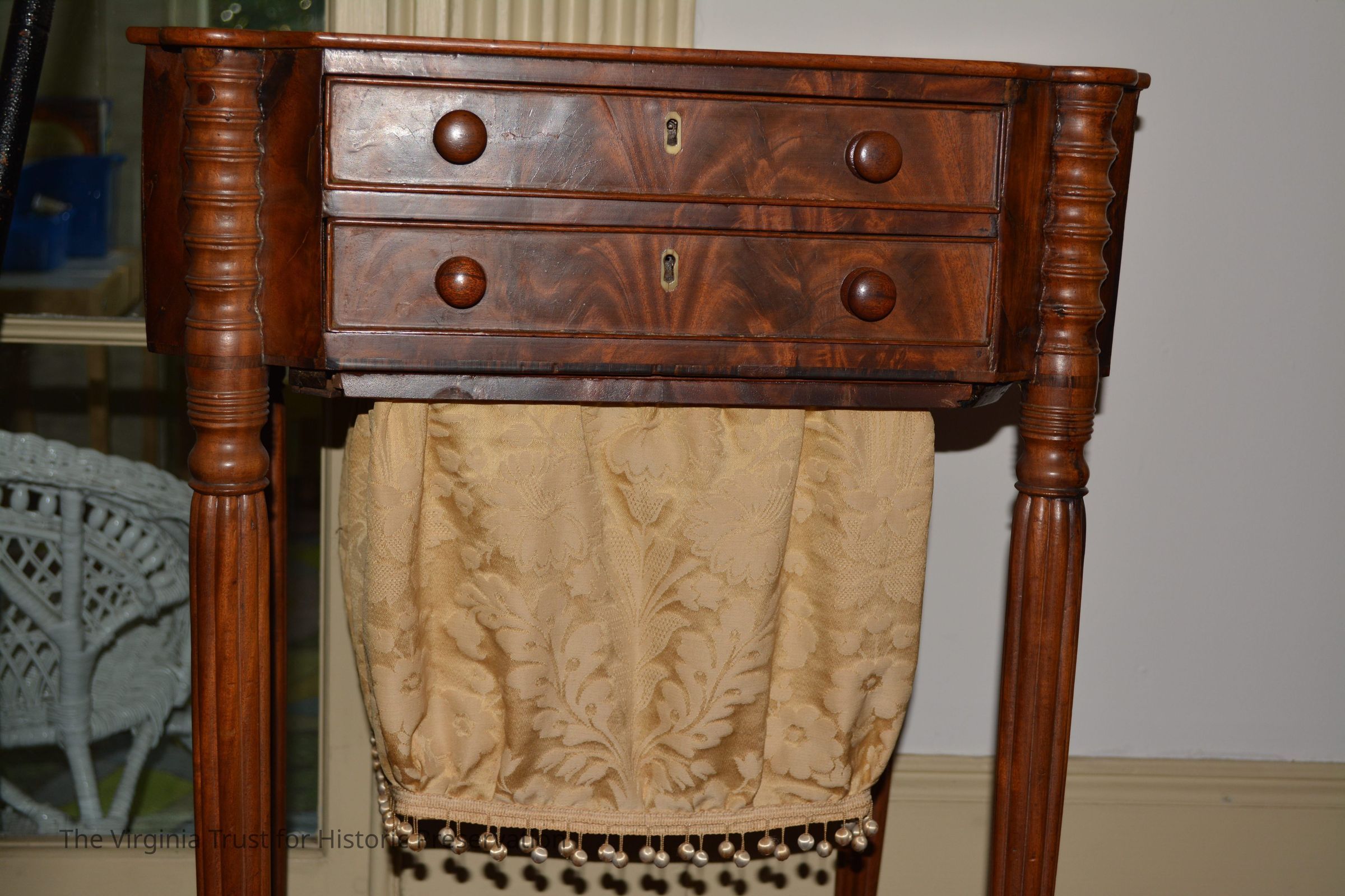 Federal period sewing table with two drawers and a hanging fabric sewing pouch with white flowers on a gold background. Label located in top drawer in the middle section.