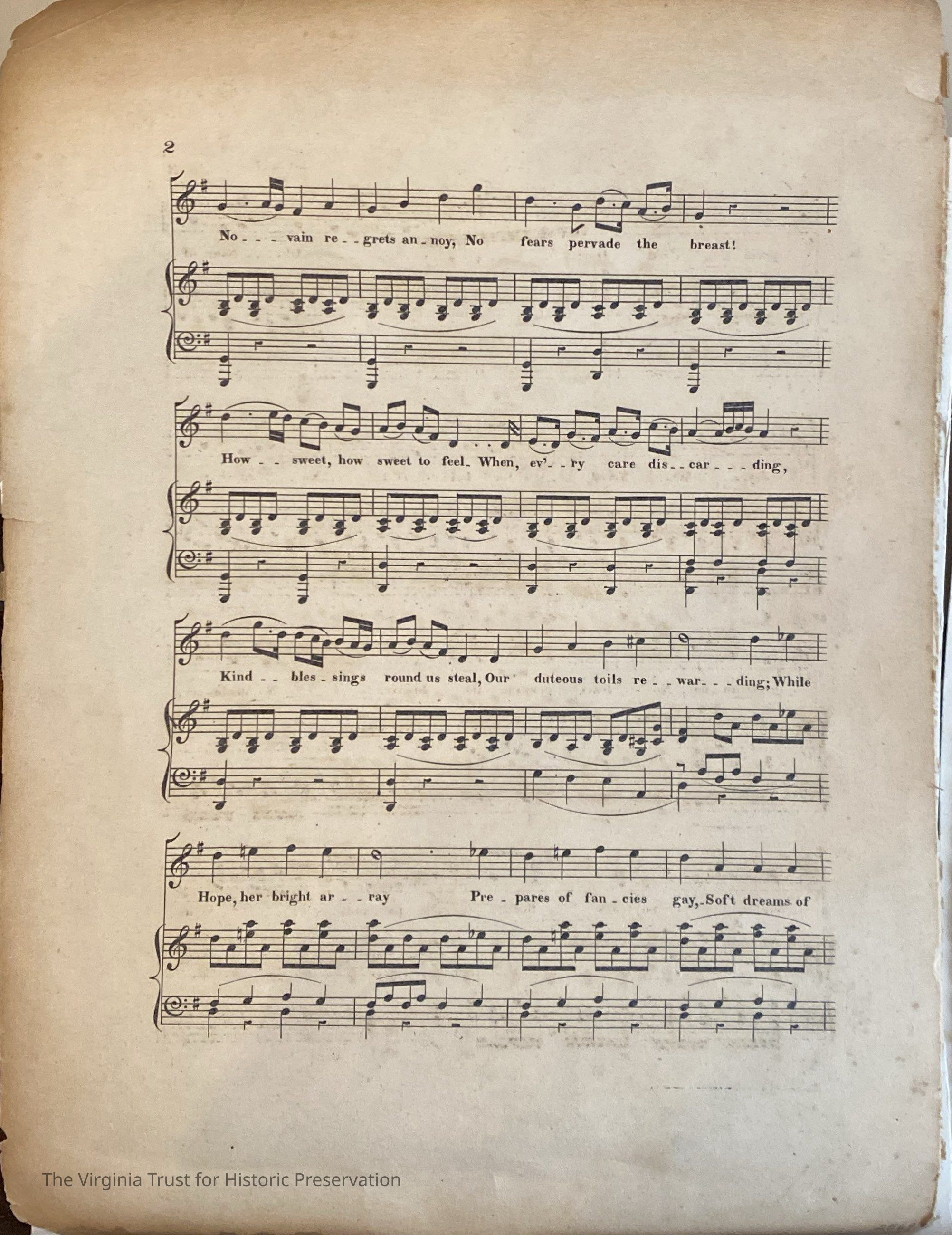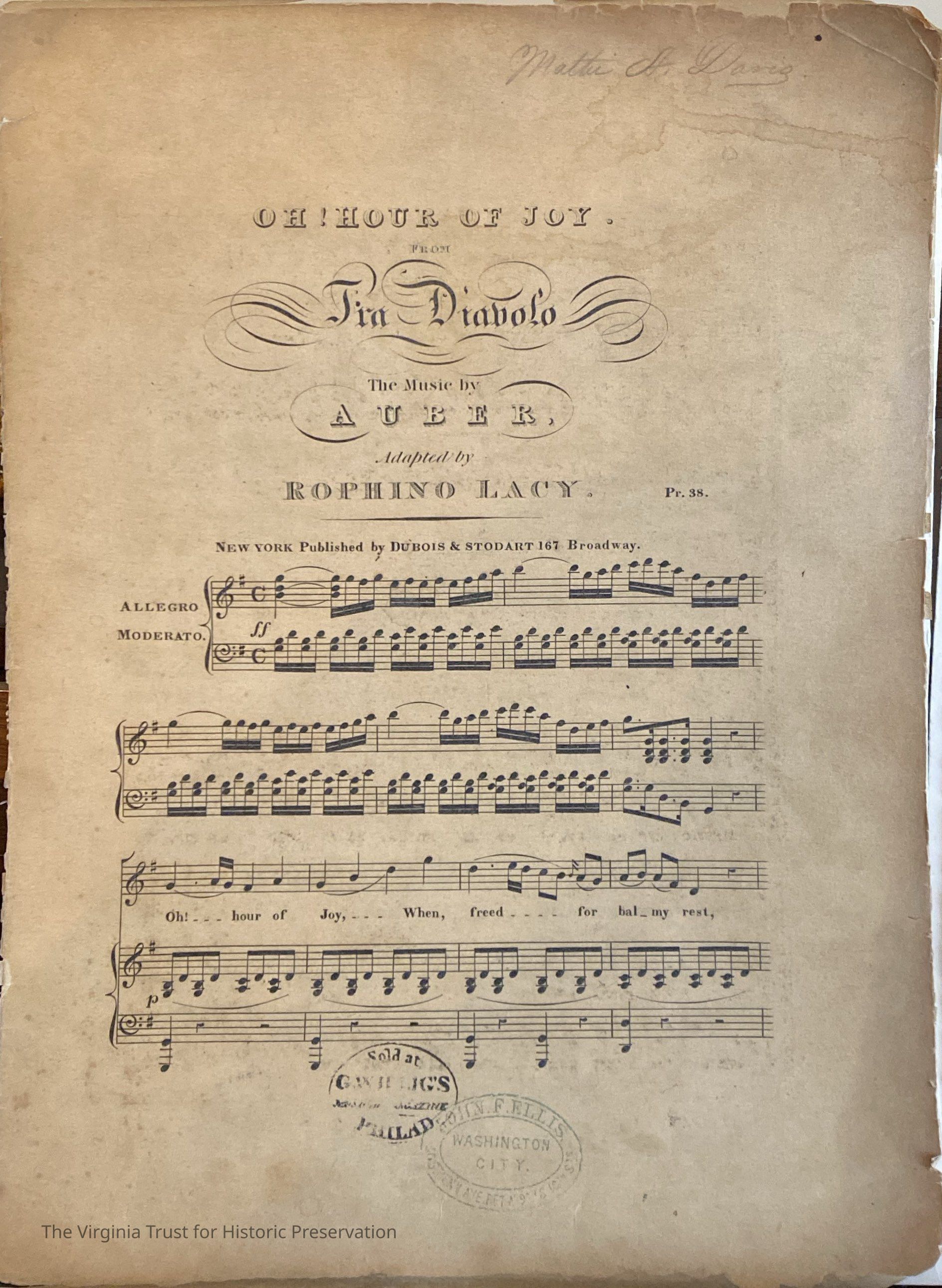 Sheet music: "Oh, Hour of Joy" by Auber. Published by DuBois & Stoddart NY. Handwritten at top "Mattie A. Davis." 2 pieces of paper, music on front and back (4 pages in total).Dimensions