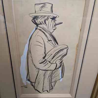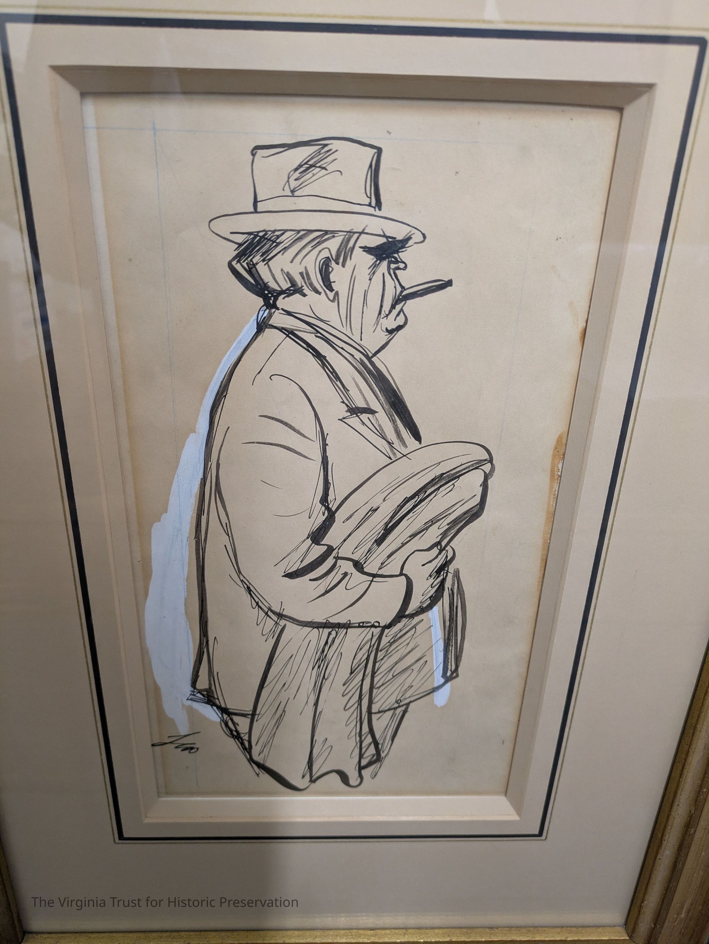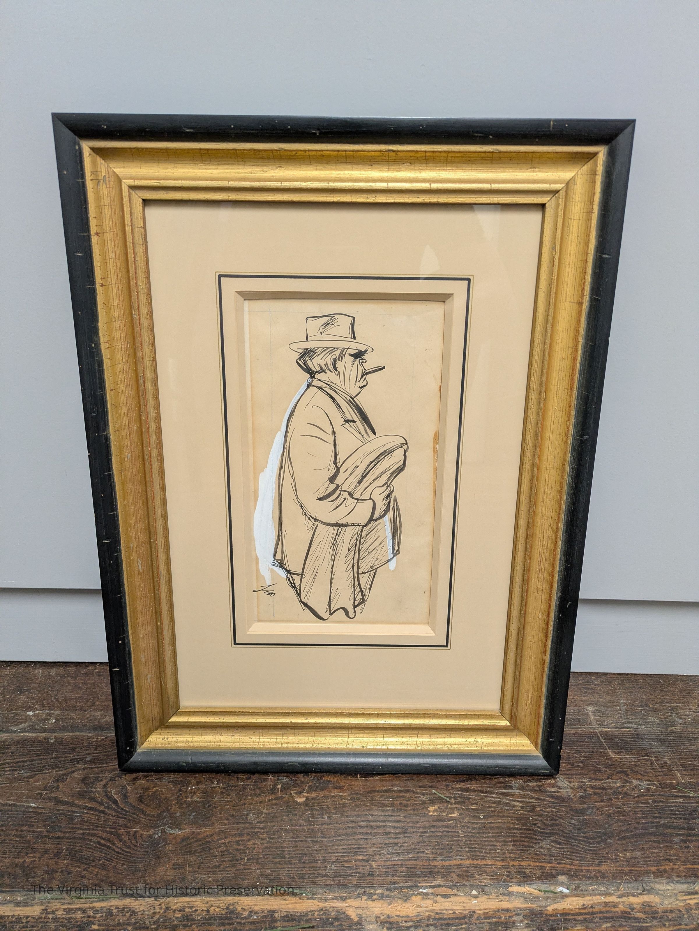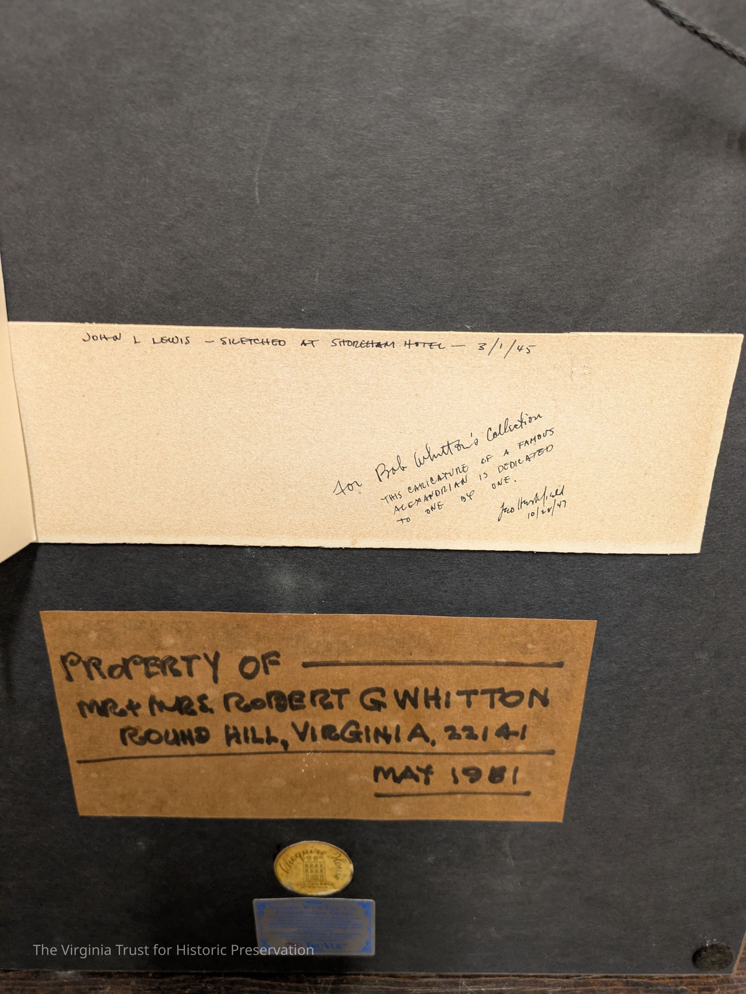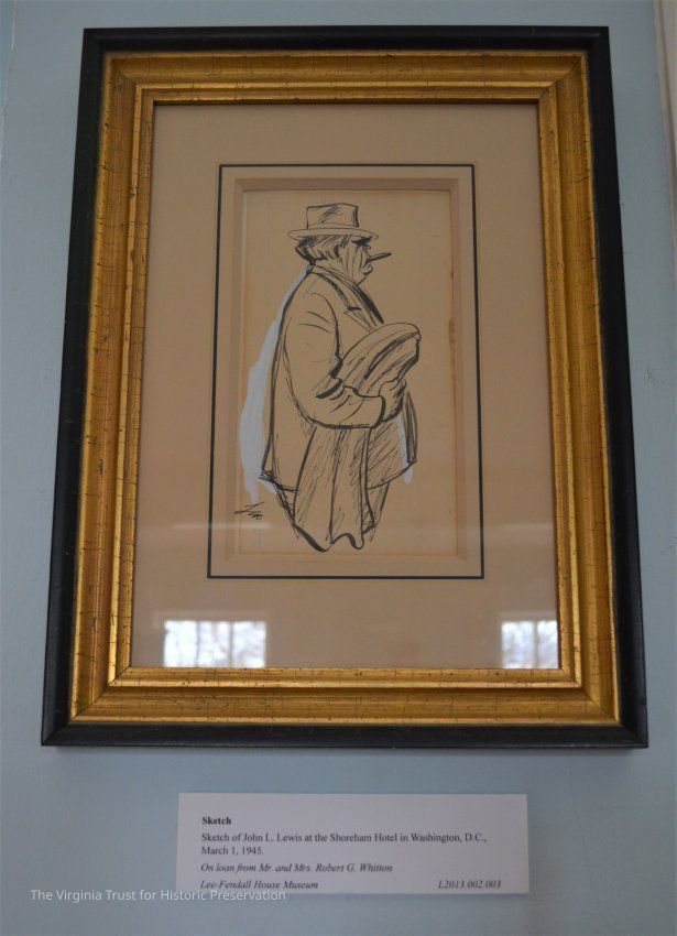 Framed sketch of John L. Lewis at the Shoreham Hotel on 3/1/1945. Sketch is matted in a gold and black wooden frame; glass is "Tru Vue" conservation glass. Label from the Chequer House is on the back.