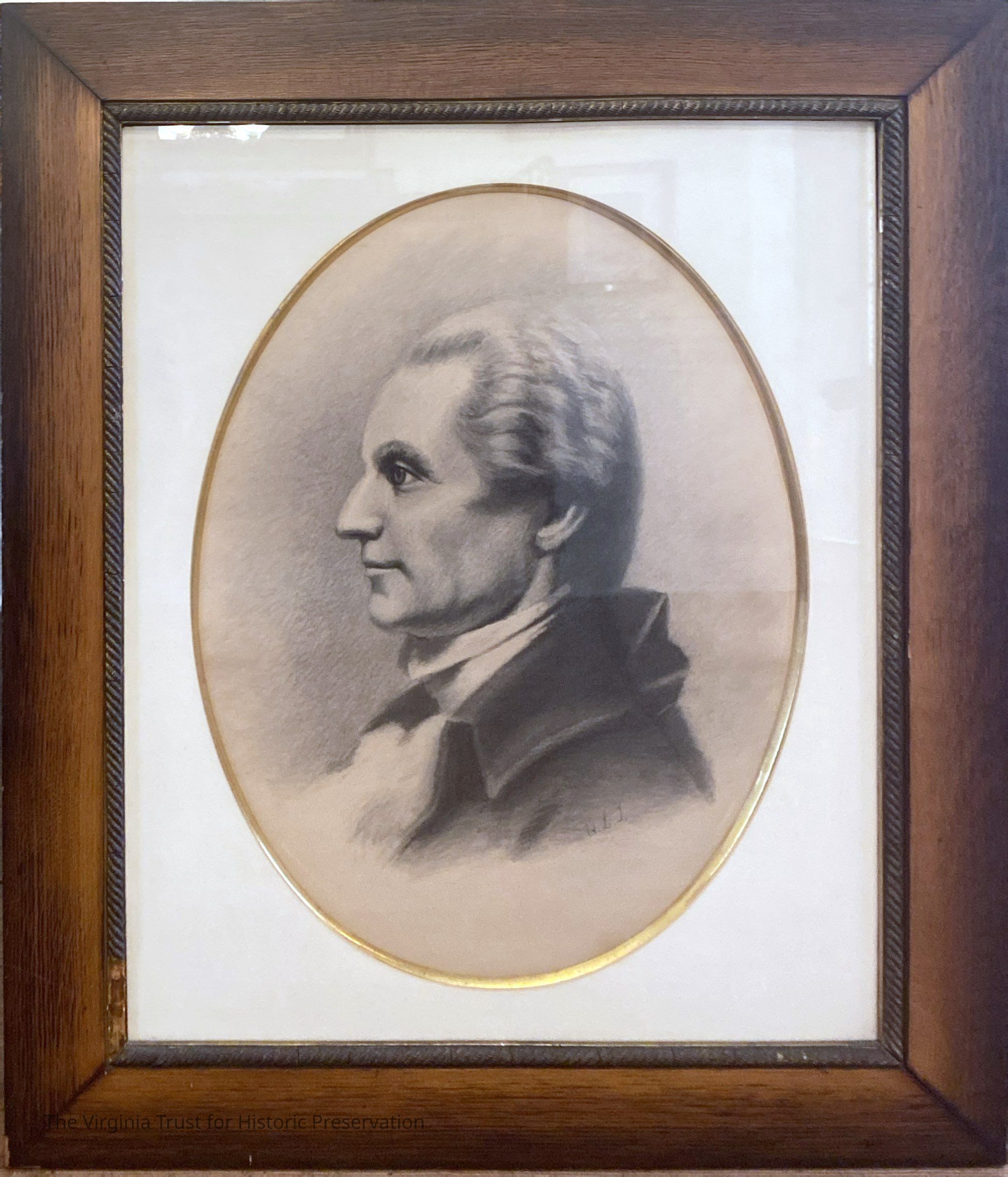 Framed oval-shaped sketch of Richard Henry Lee. Side profile of head and shoulders. Brown frame with white mat, glass cover. "H.L.J(?)" written in lower right corner. Brown paper glued all around back of frame.Dimensions