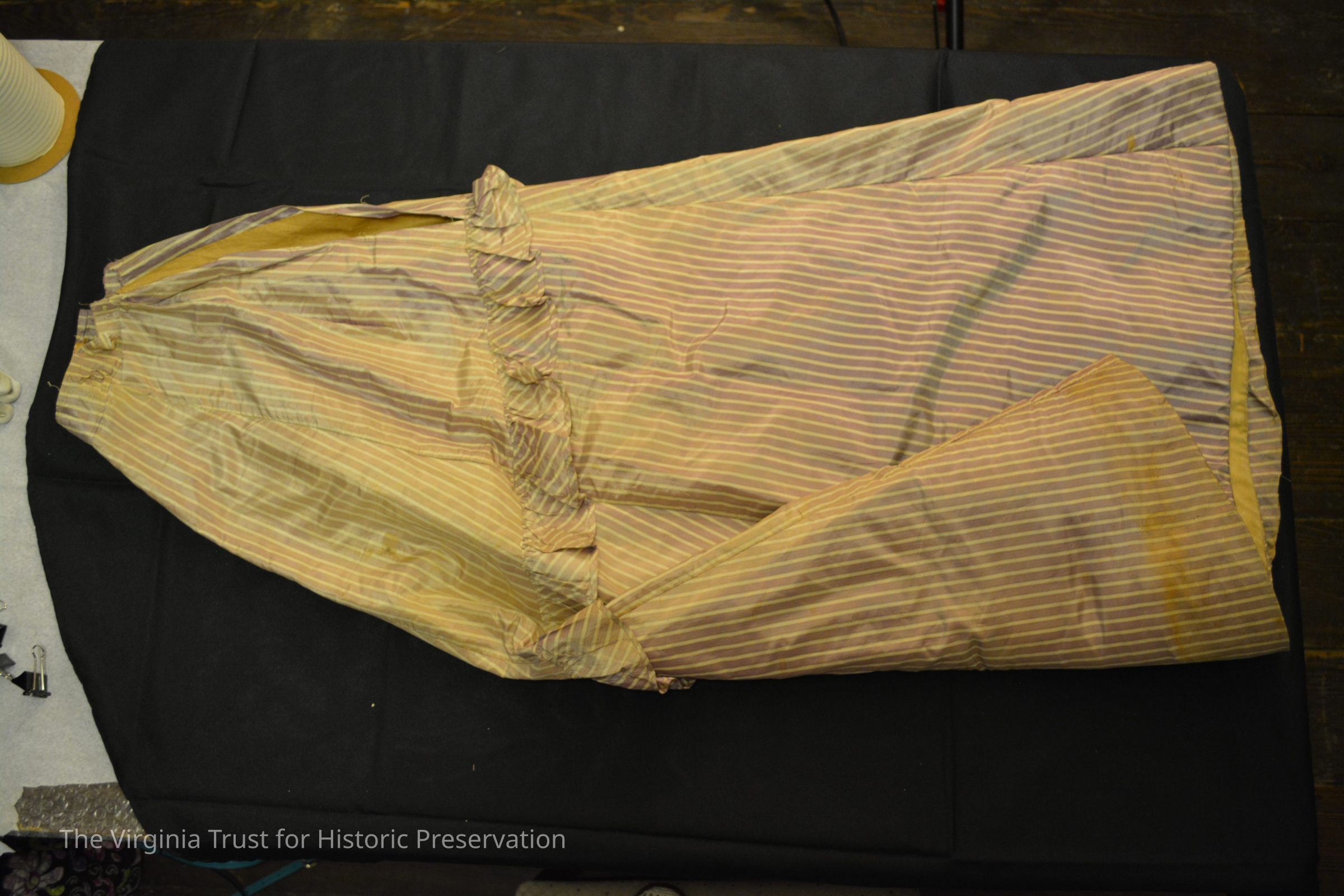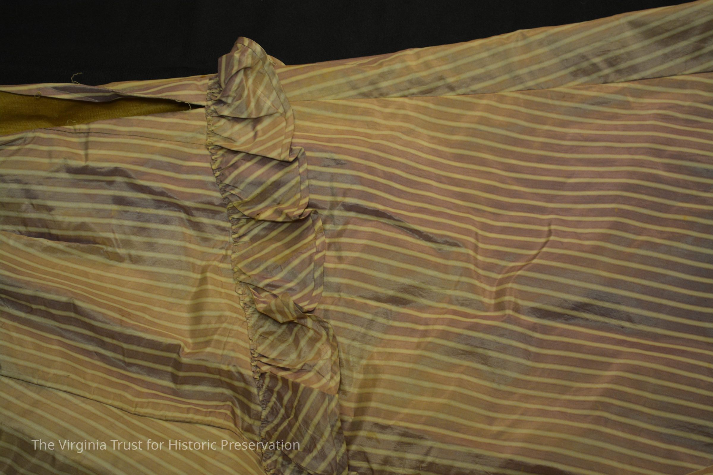 Silk skirt in lavender and white verticle stripe pattern silk. Decorative ruffle from rear to front in downward diagonal.