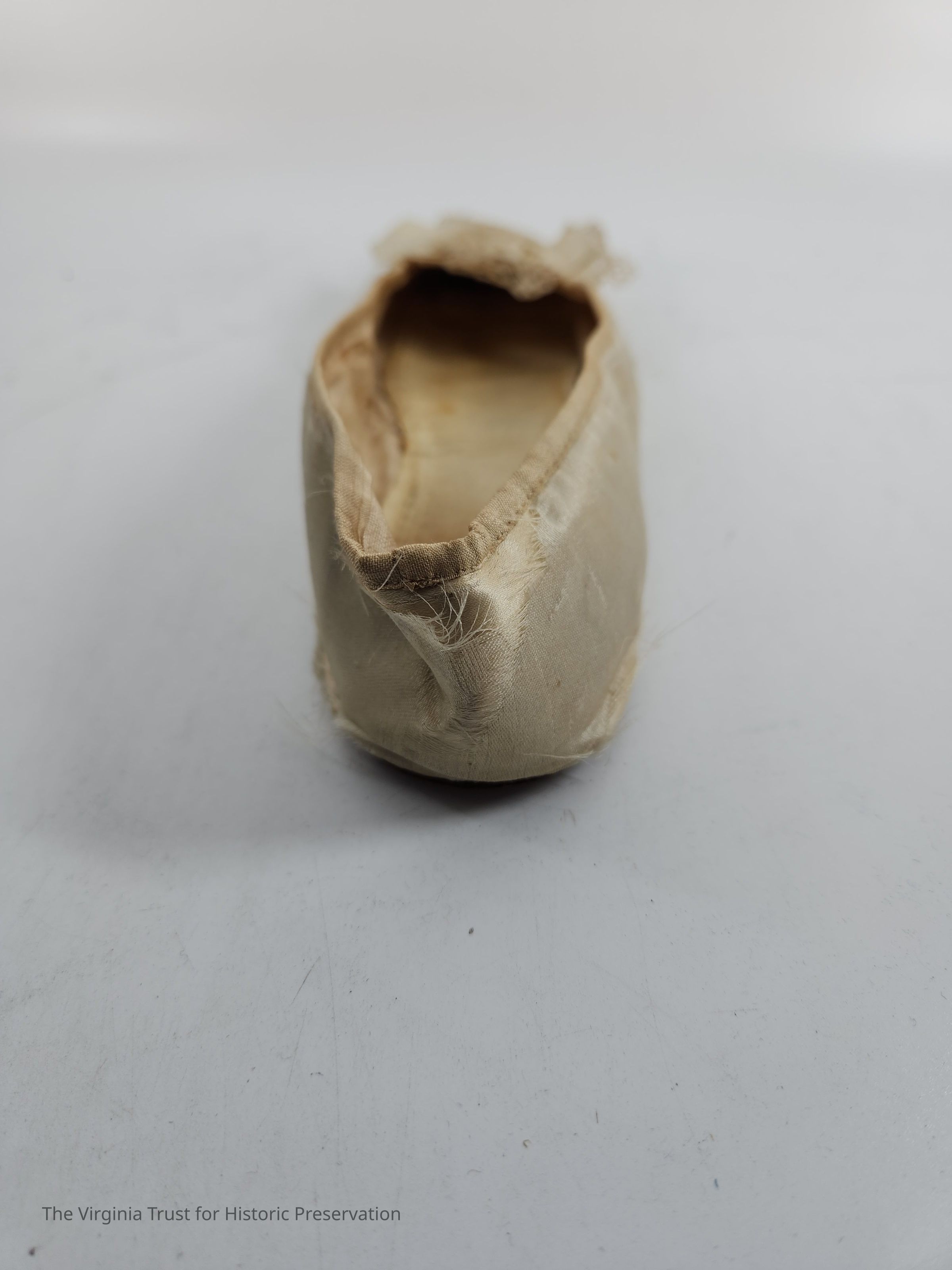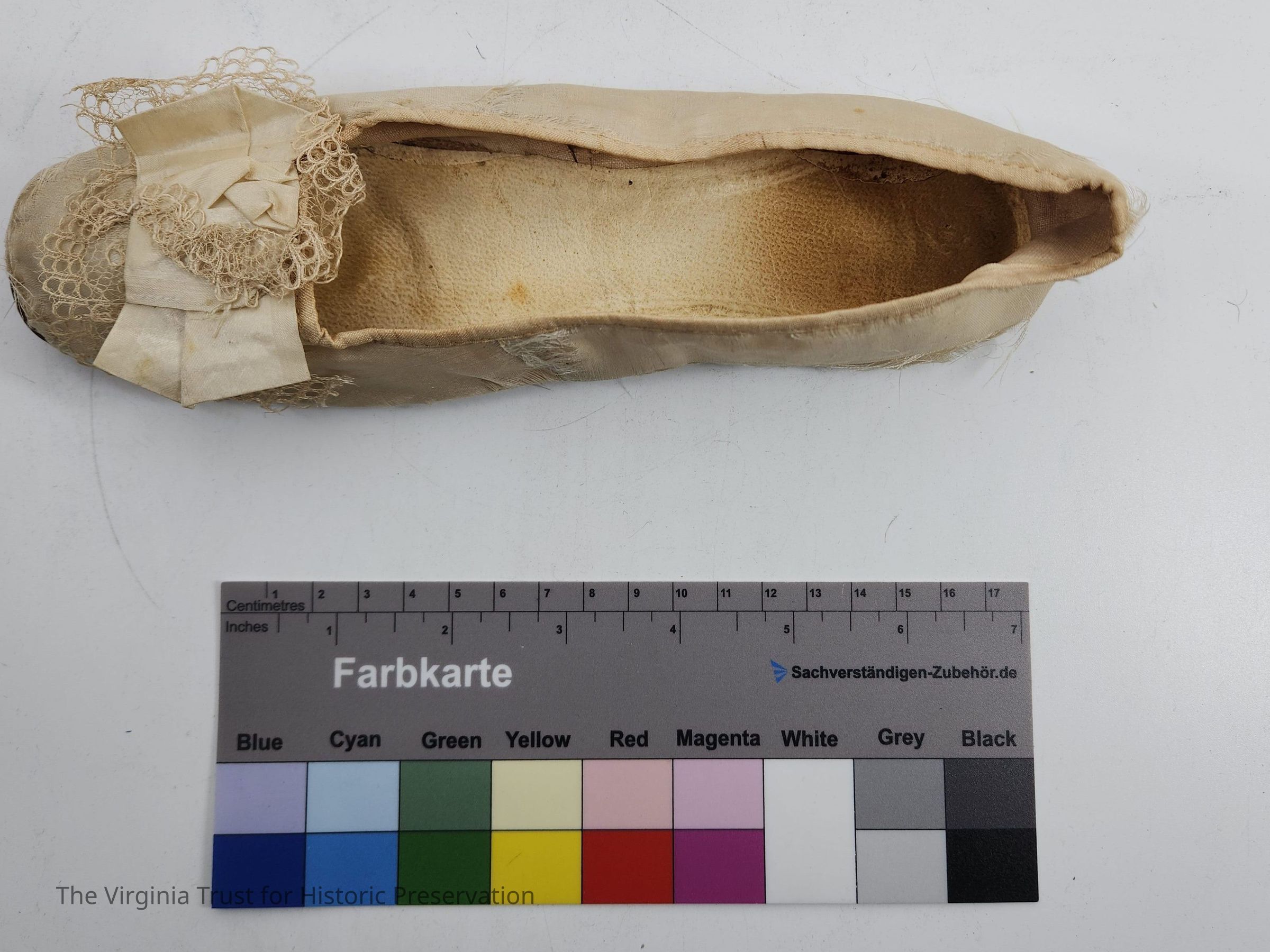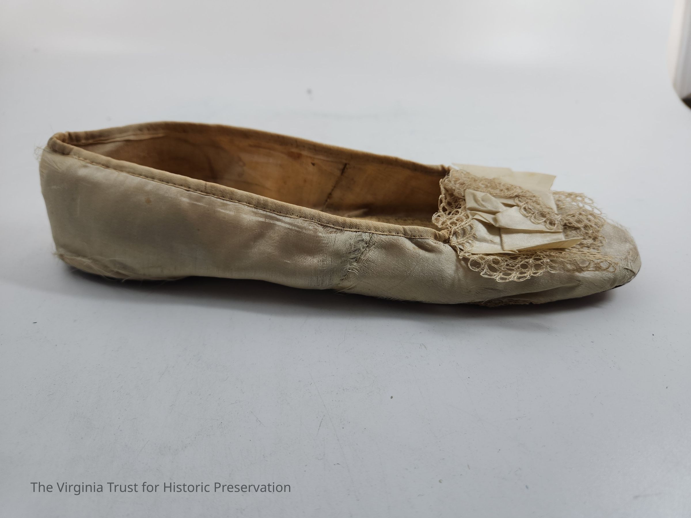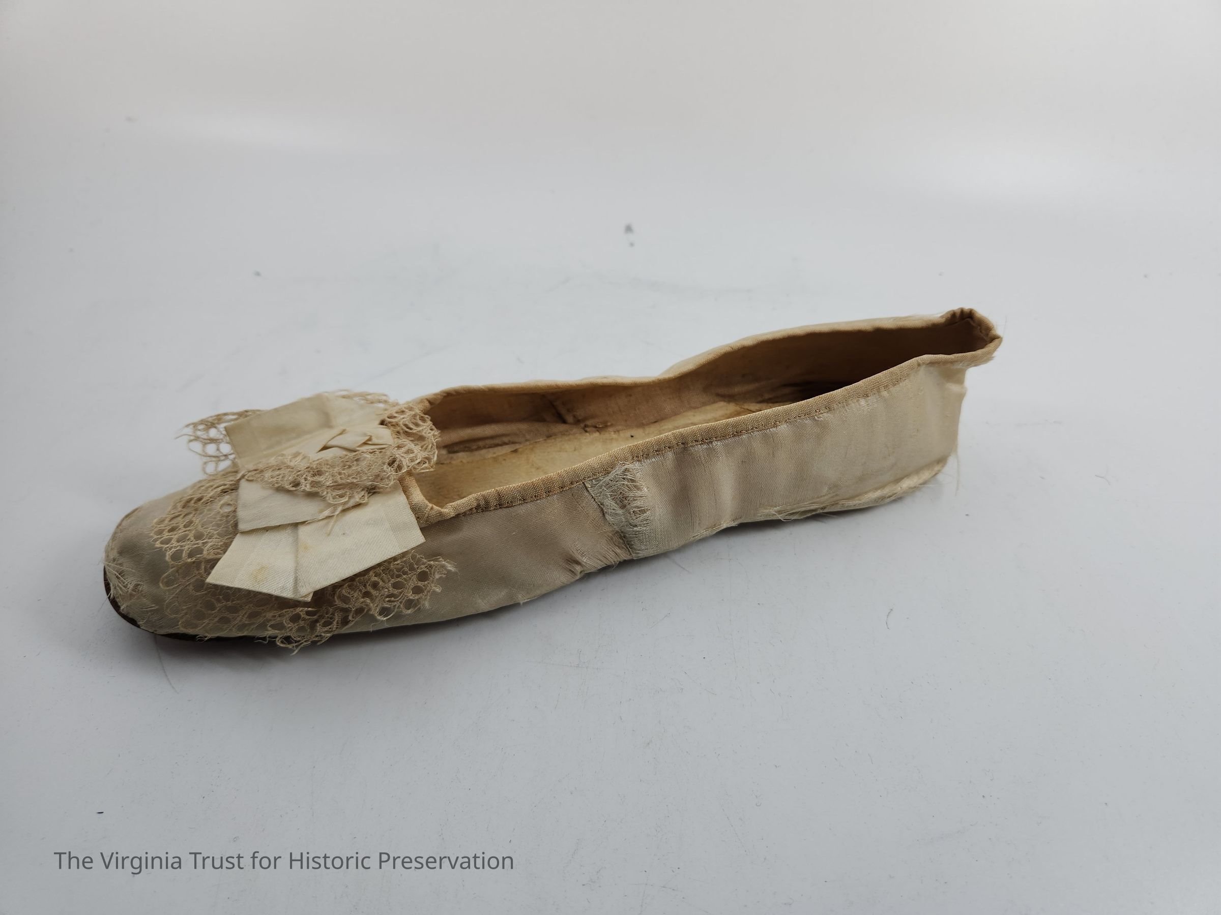 One of a pair of white satin wedding slippers, lace trim under and over a silk satin bow trimming the toe, kid lining and leather flat sole.