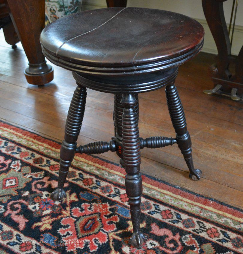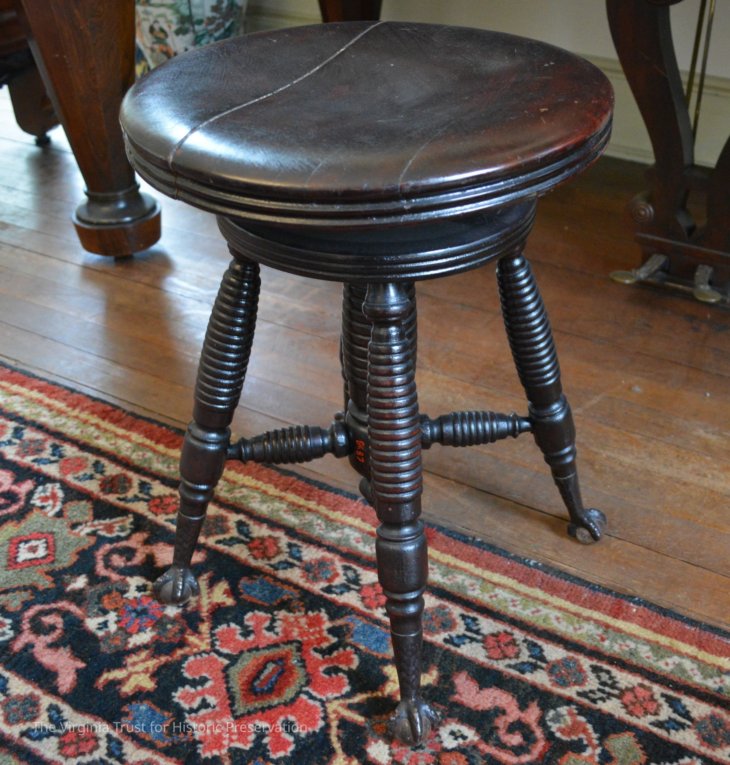 Swivel top (round) on four turned legs, claw glass ball feet. Adjustable turn seat.