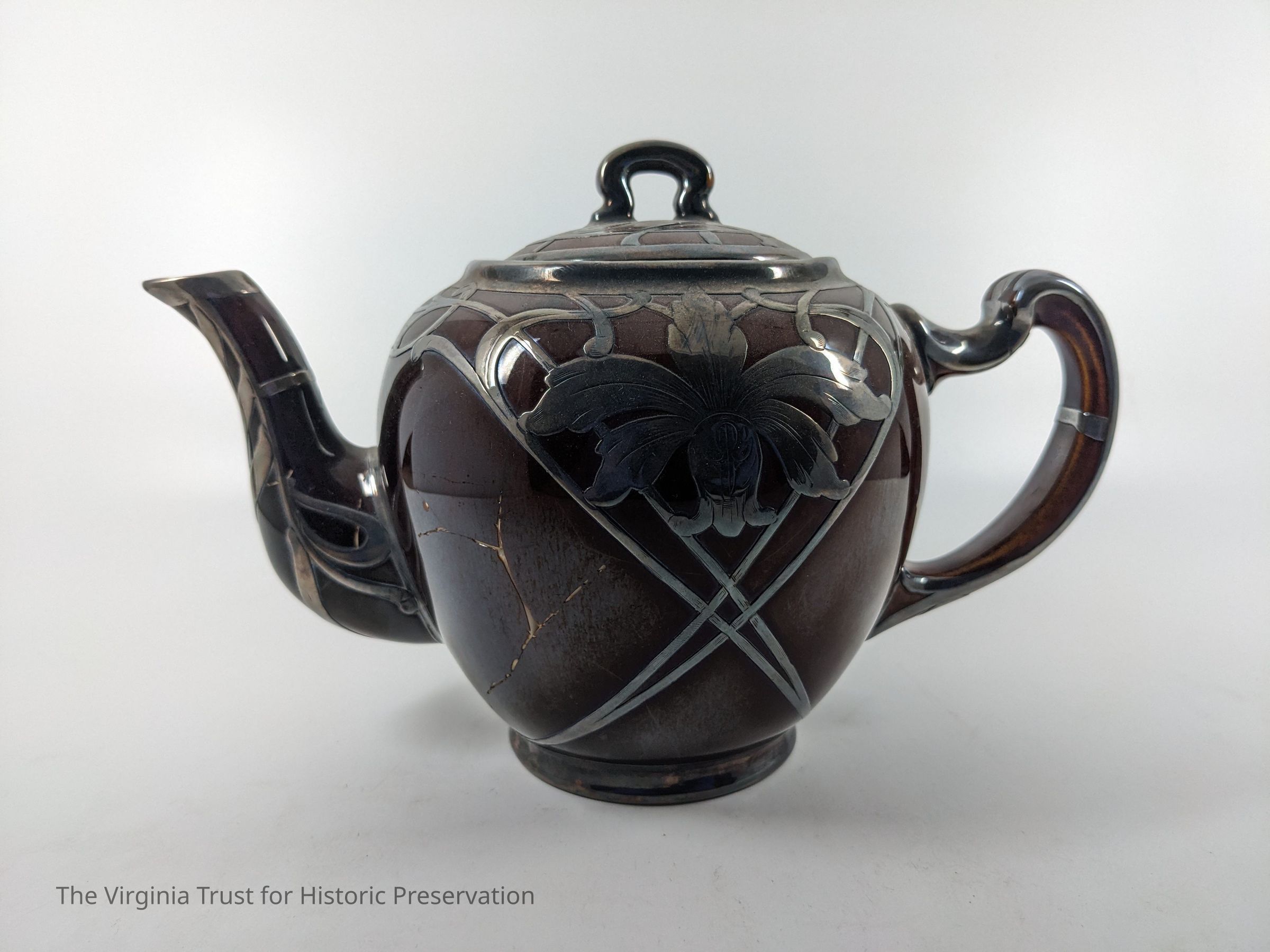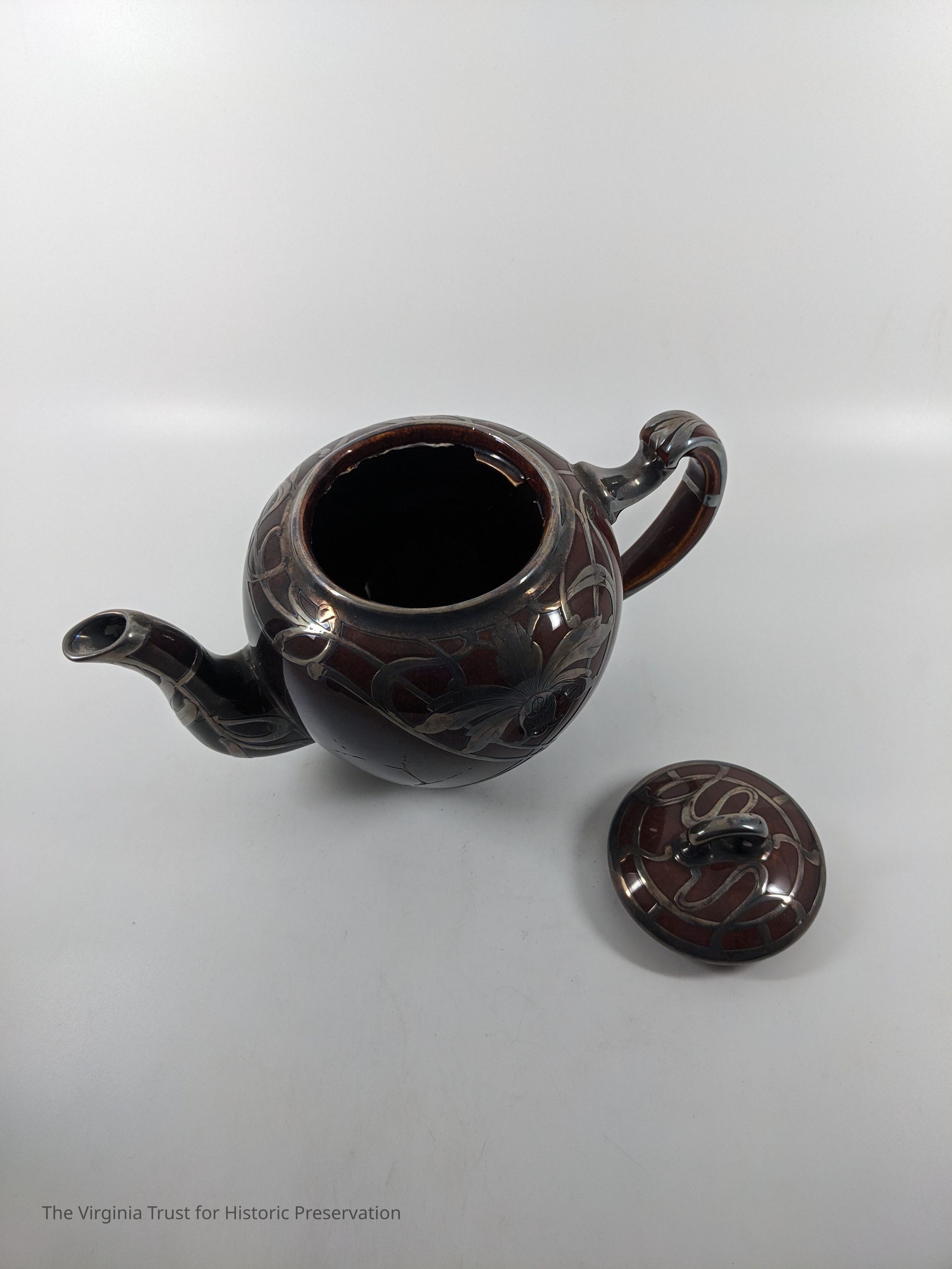 Teapot, dark brown Lenox with silver overlay. Part of a 3-piece tea set (tea pot, sugar, creamer).