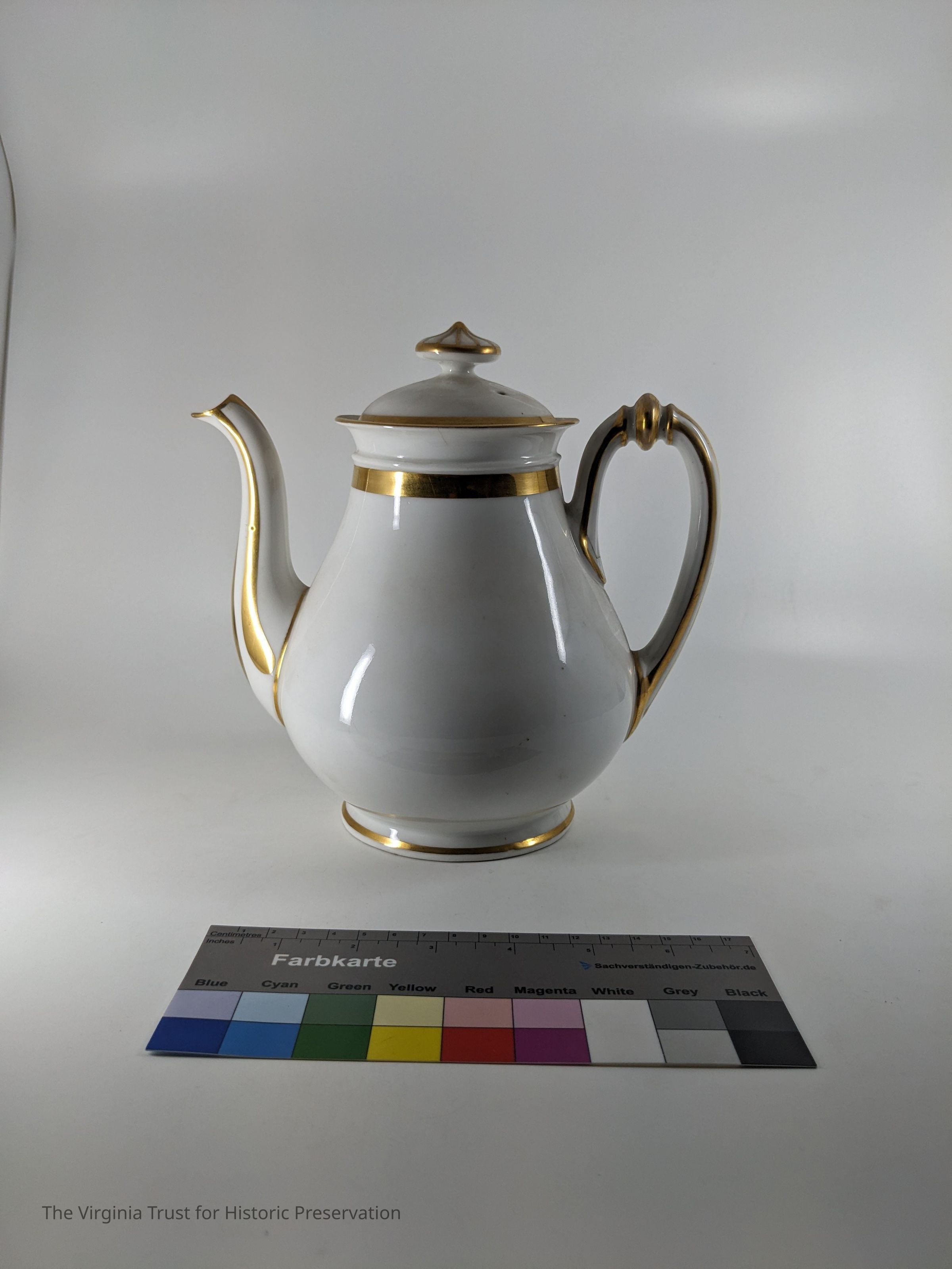 White teapot with gold trim, matching lid. Stamped on bottom: H8:Co.