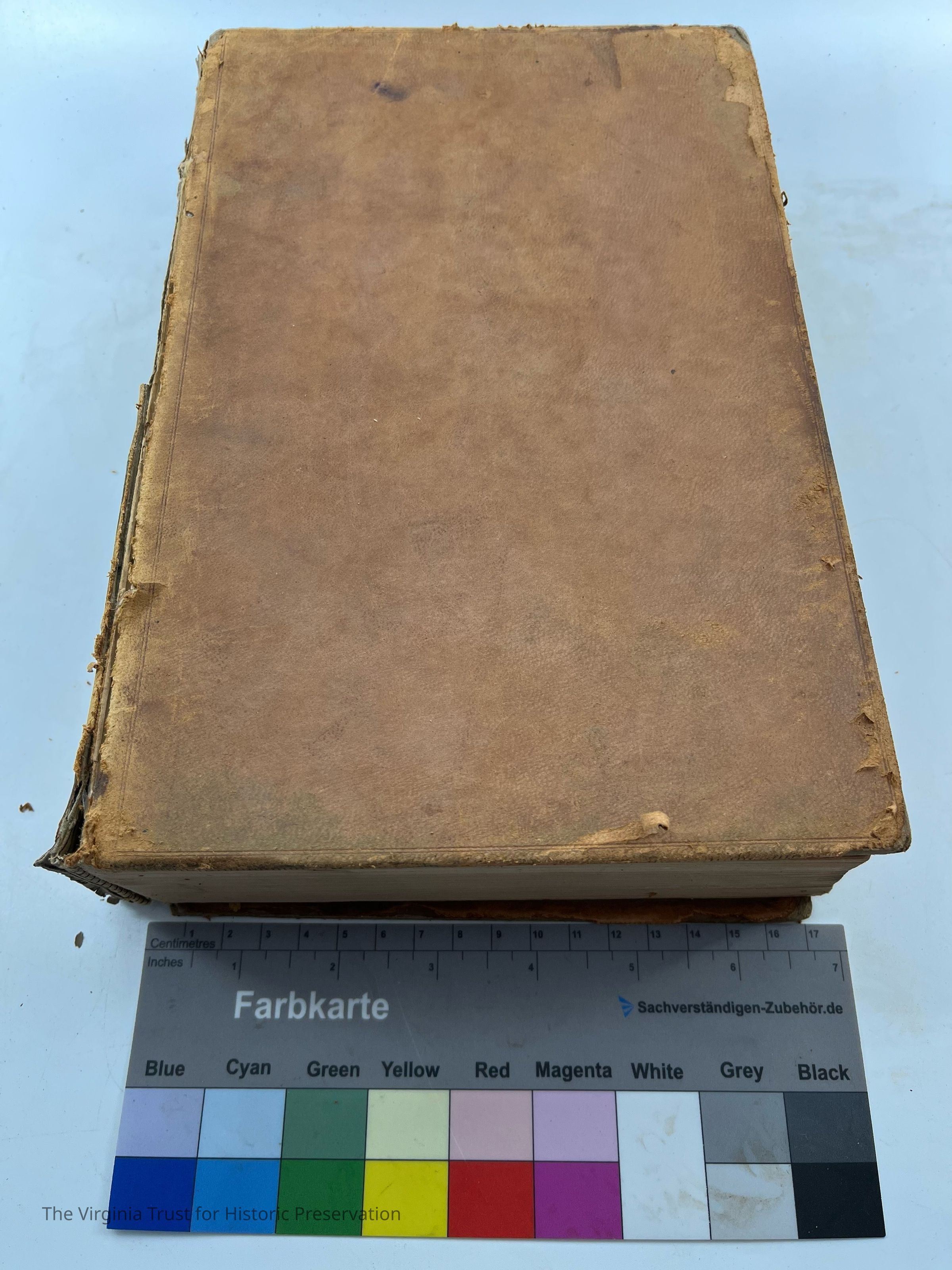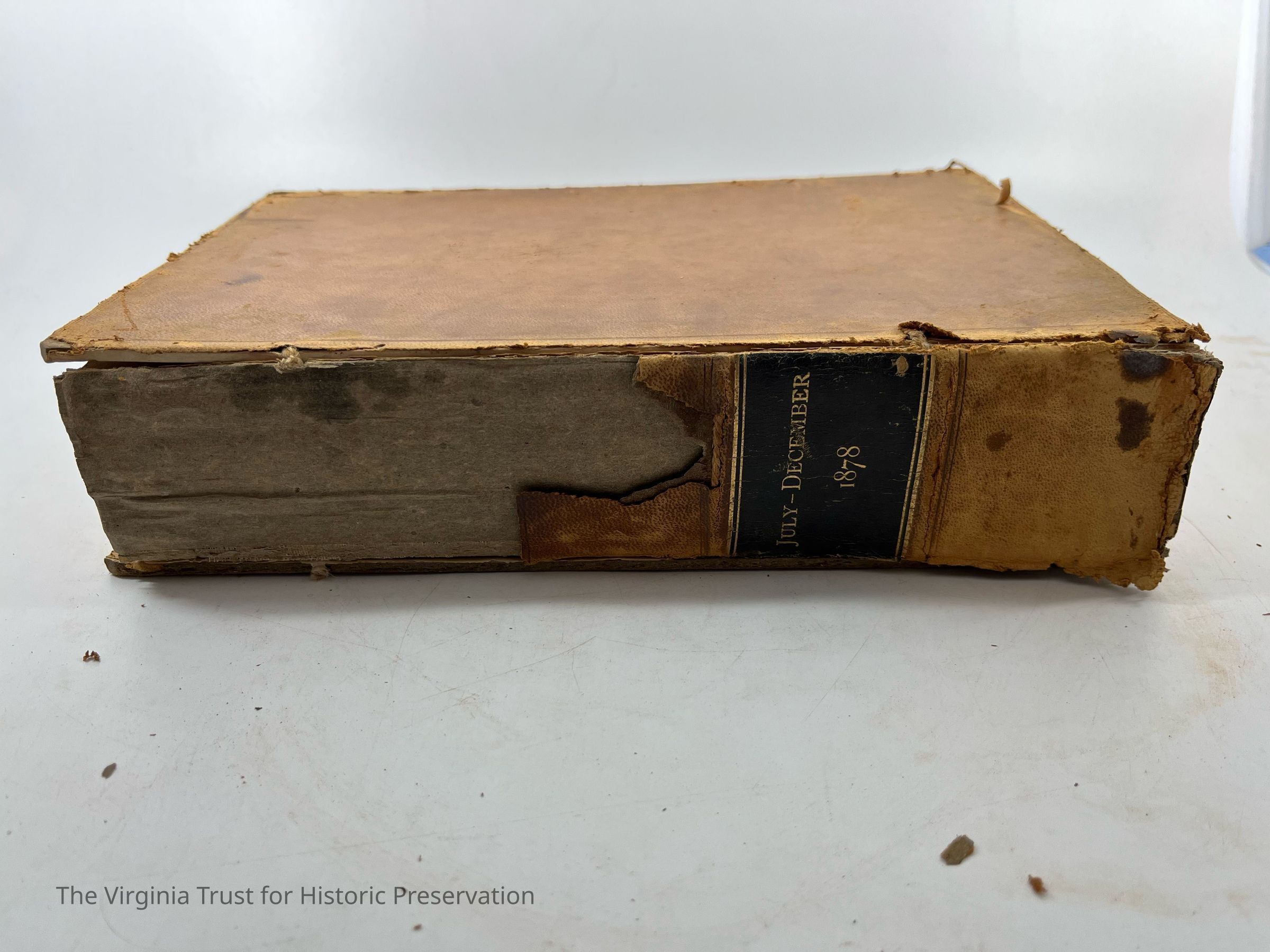 Tan/light brown front cover, detached back cover, fragile binding, torn/unreadable readable spine