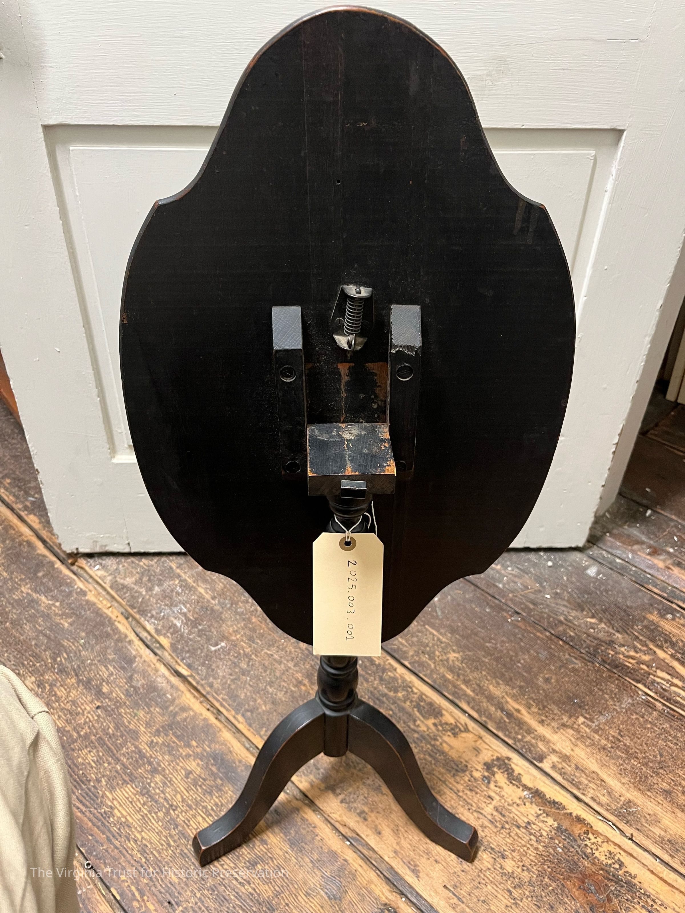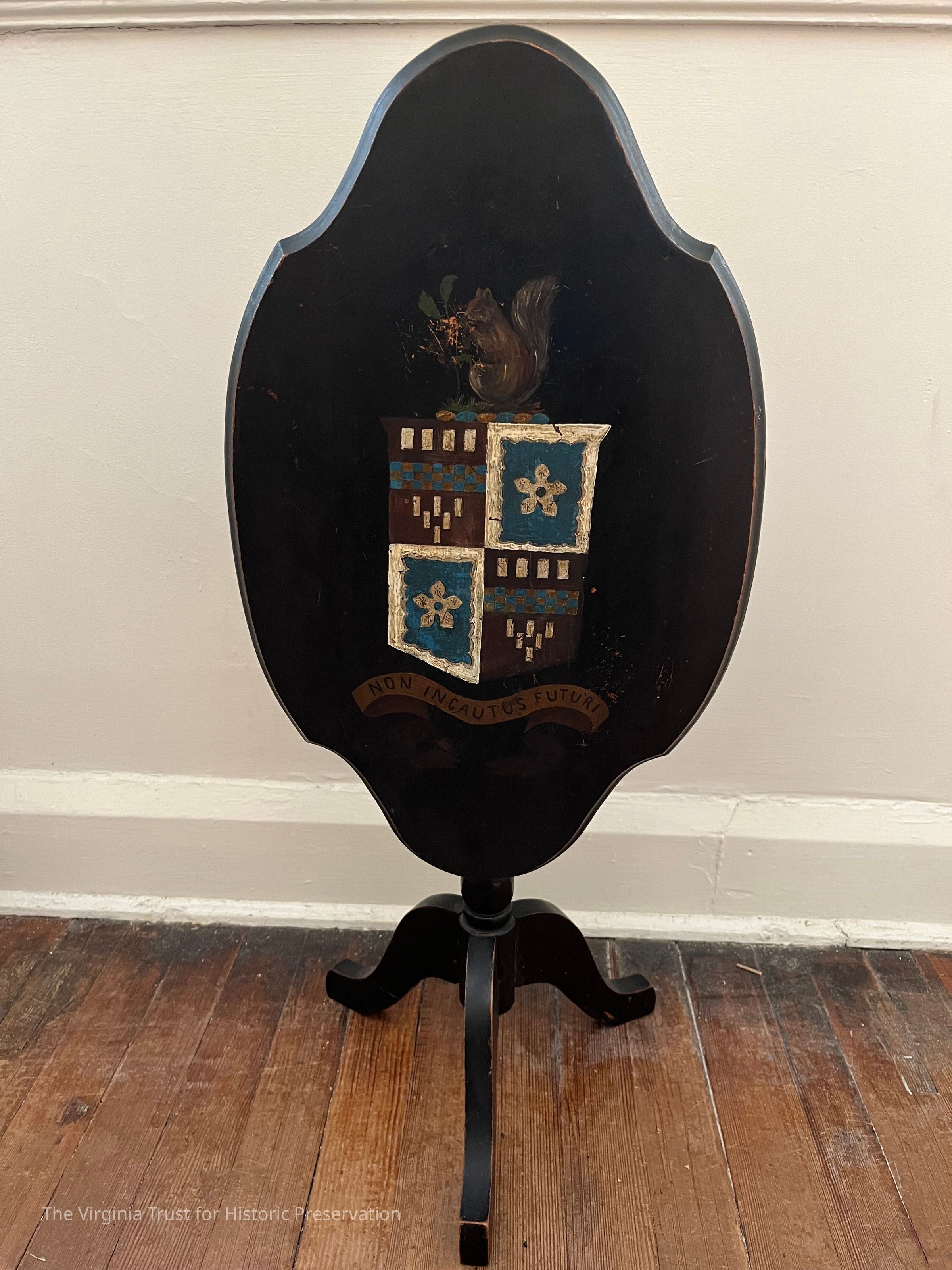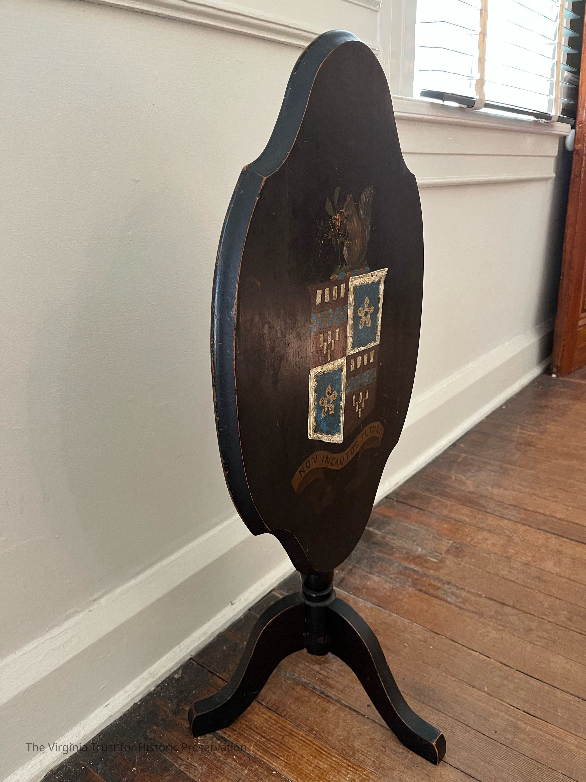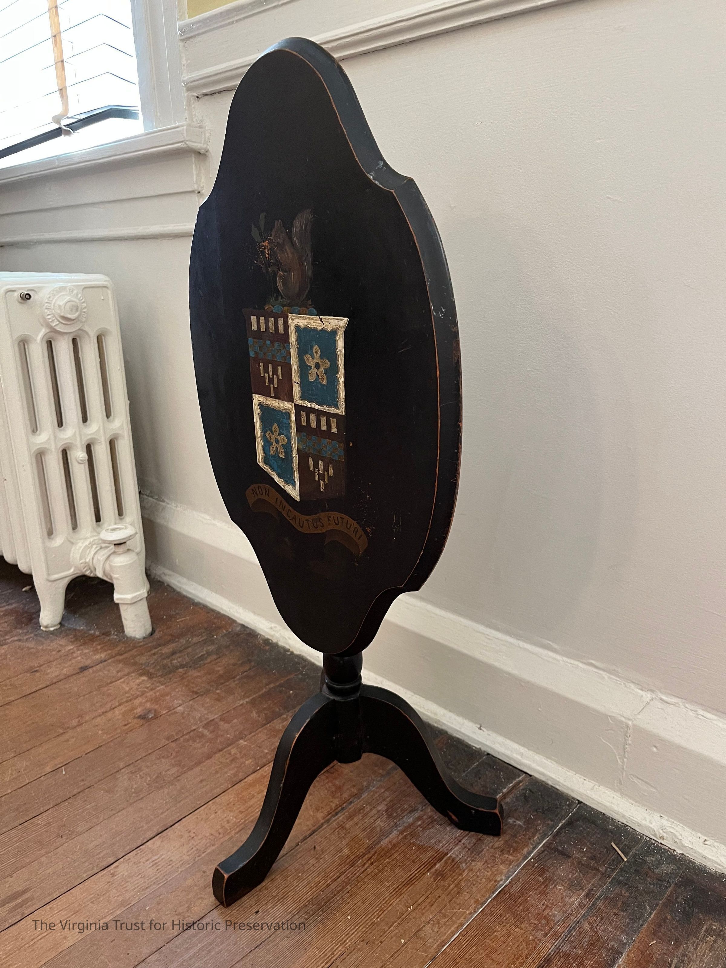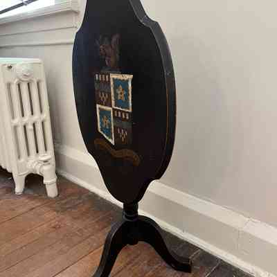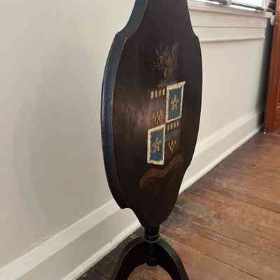 Dark colored, three legs, movable table surface, Lee family coat of arms on table surface