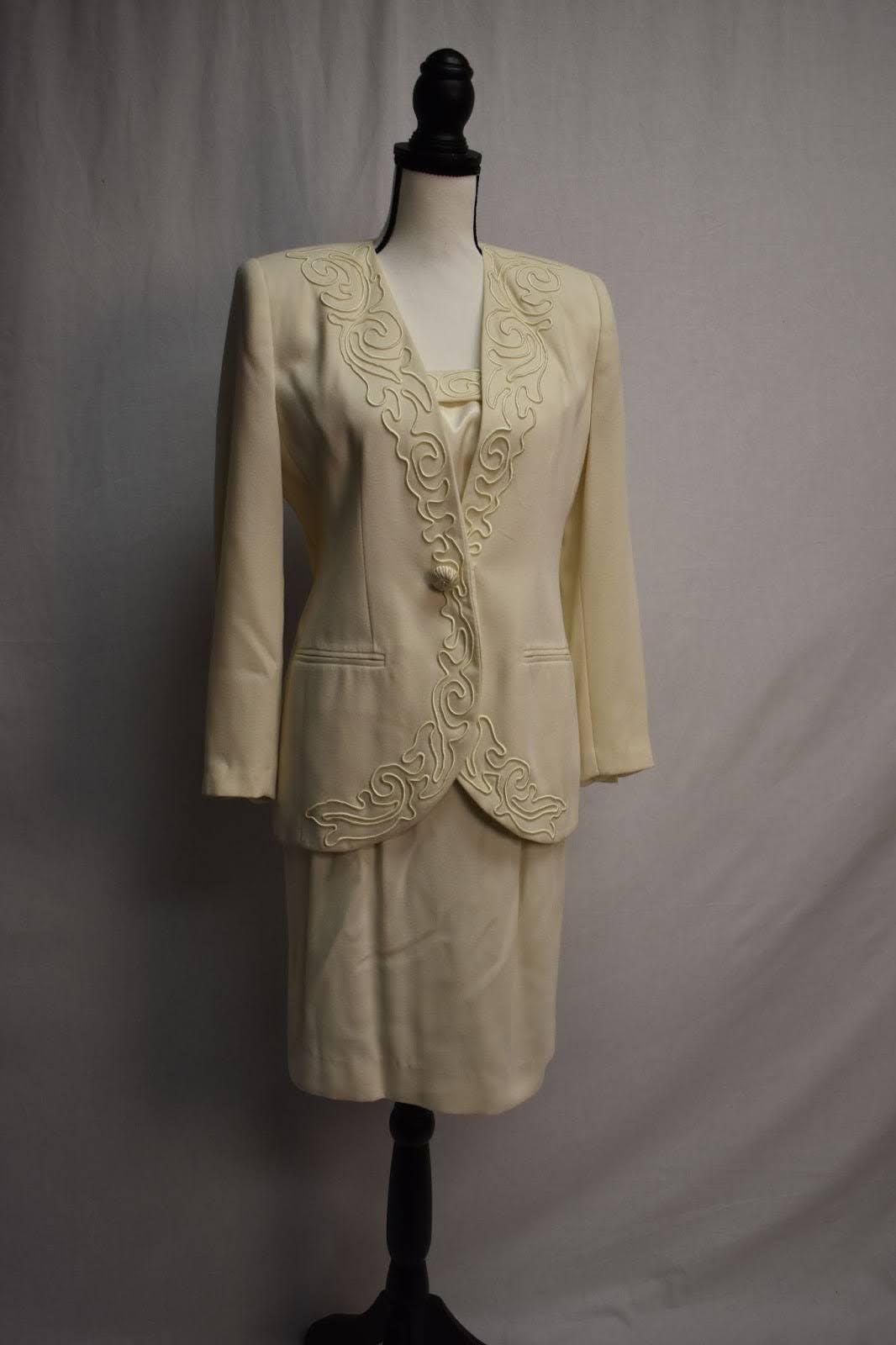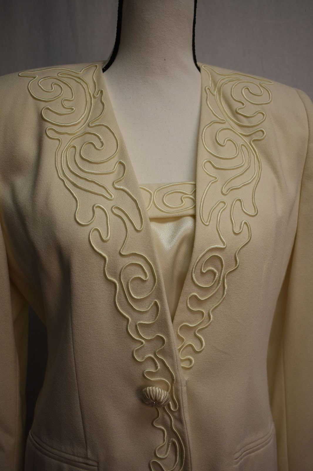 Cream crepe suit with a knee length skirt and collarless jacket with welt pockets. Three-piece ensemble also has a satin tunic. The ensemble has applique detail on the jacket front, tunic, and skirt waist.