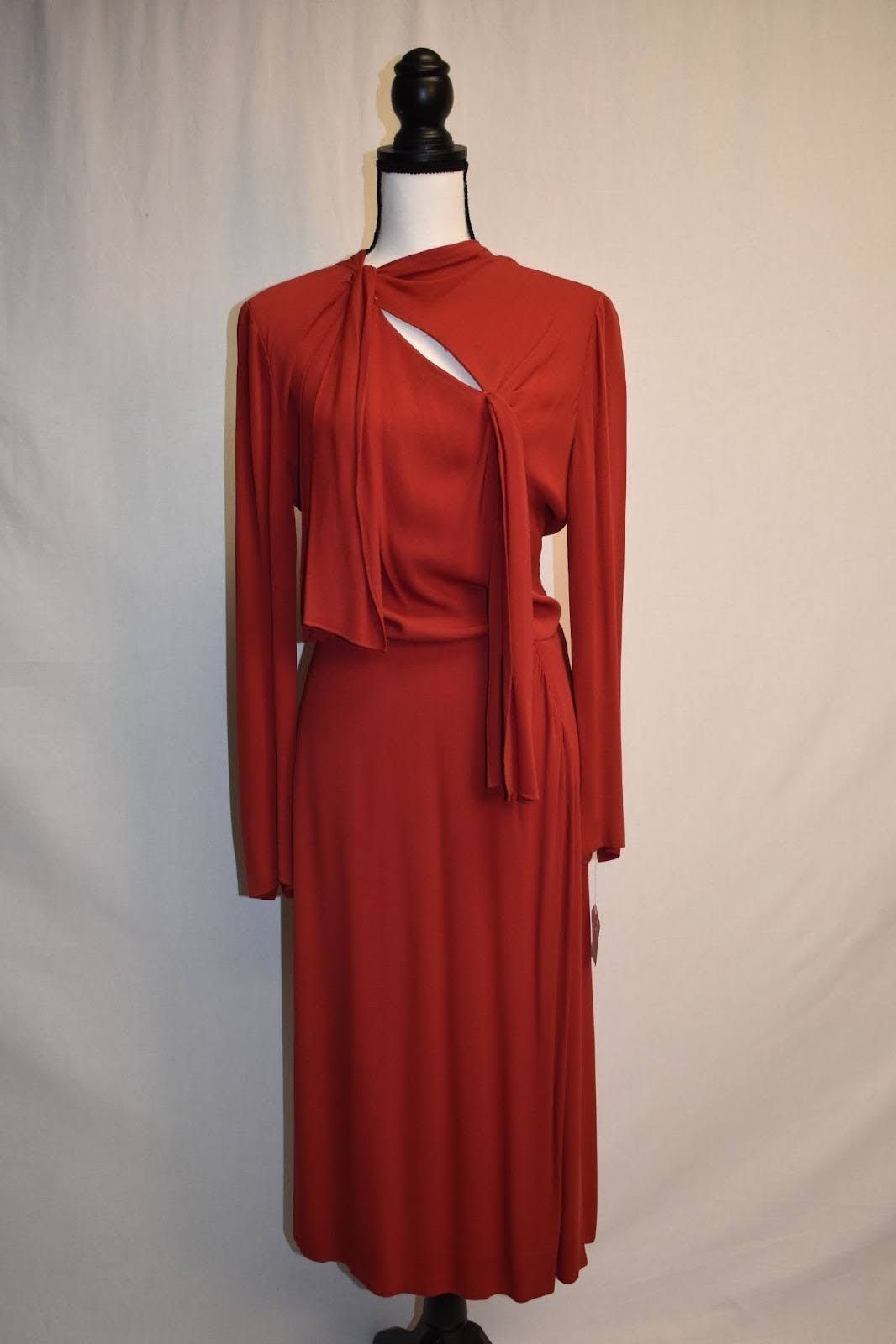 Red asymmetrical long sleeve dress with chest cut-out and two ties.