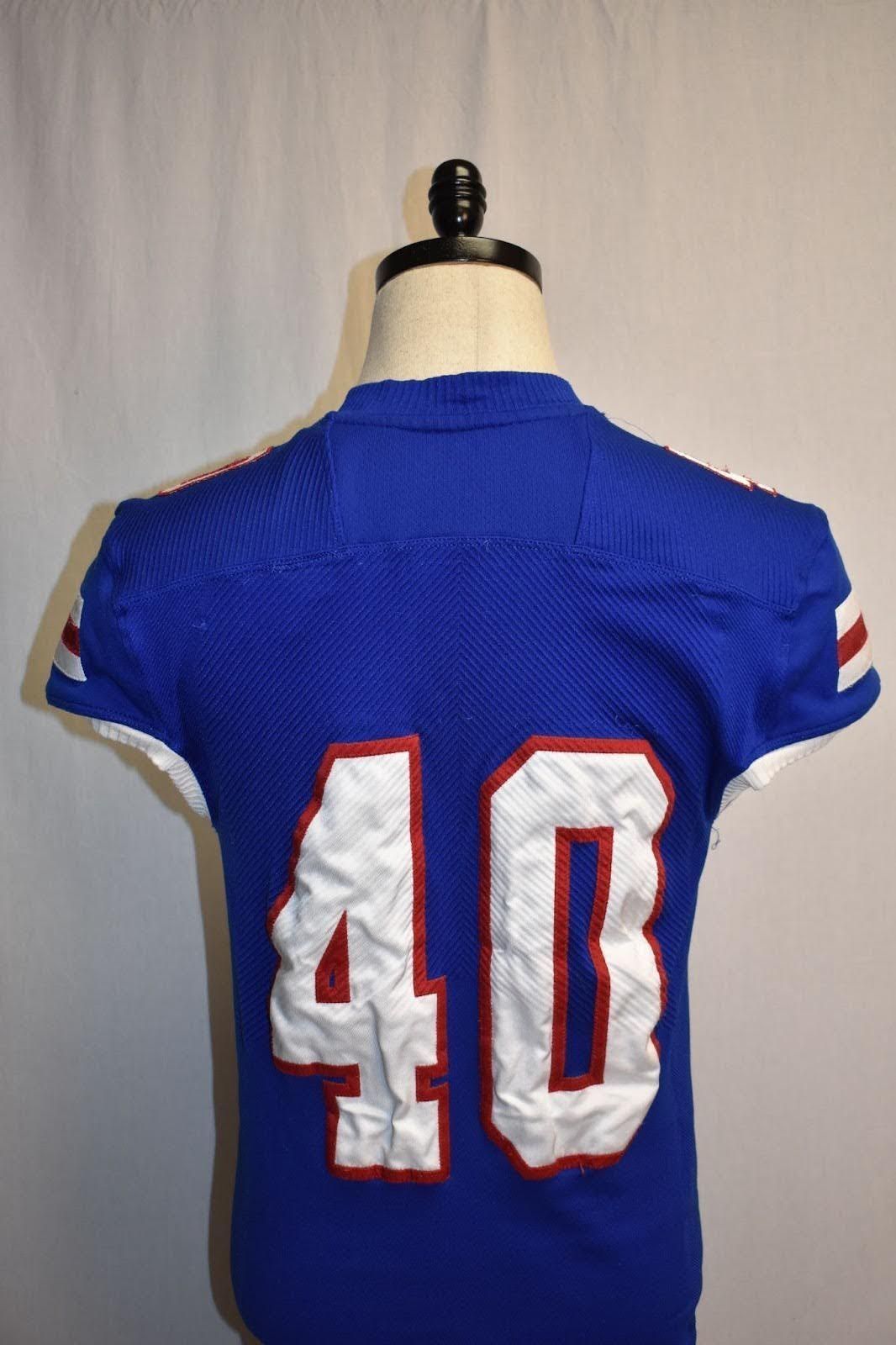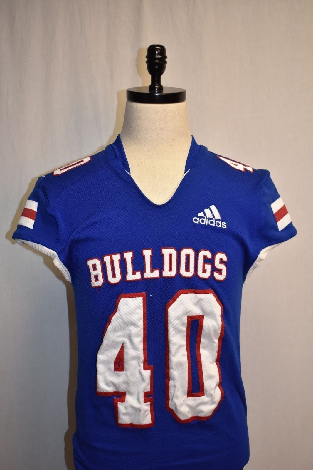 Louisiana Tech Football jersey. The jersey is Tech blue with white letters and numbers that are outlined in red and appliqued to the jersey. It is constructed of a knit fabric to provide adequate stretch for wearing over shoulder pads. The two white stripes and one red stripe on the sleeves change with different designs of the jerseys. This jersey was worn from 2019- 2022.