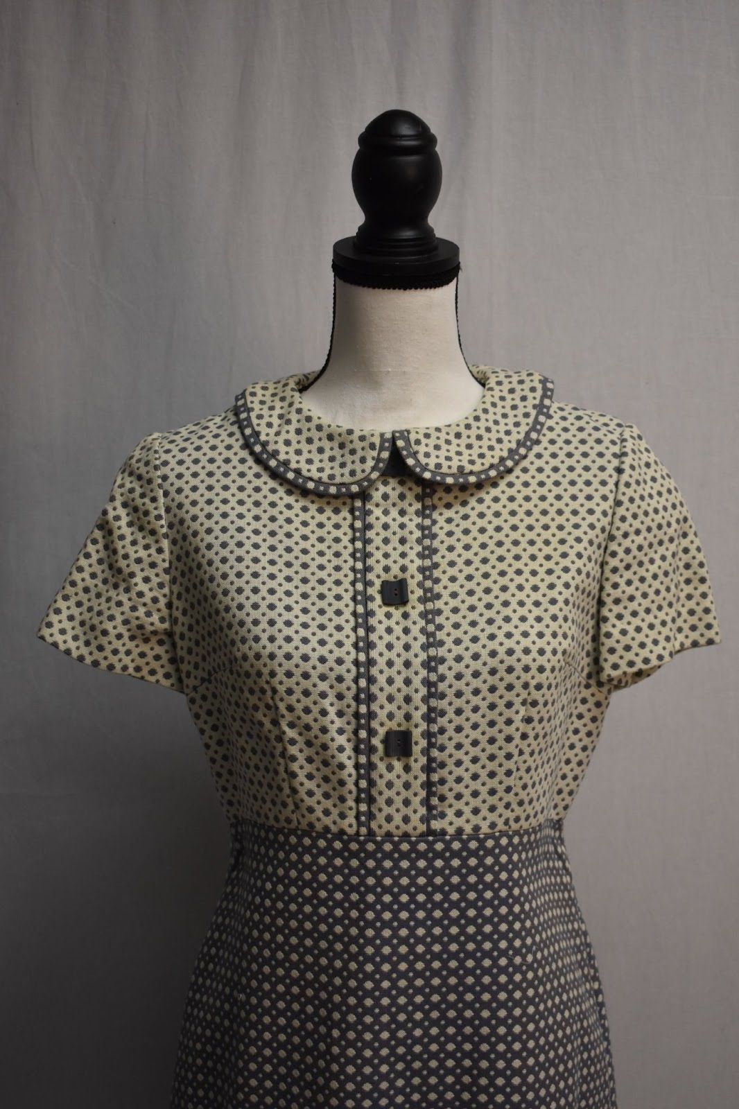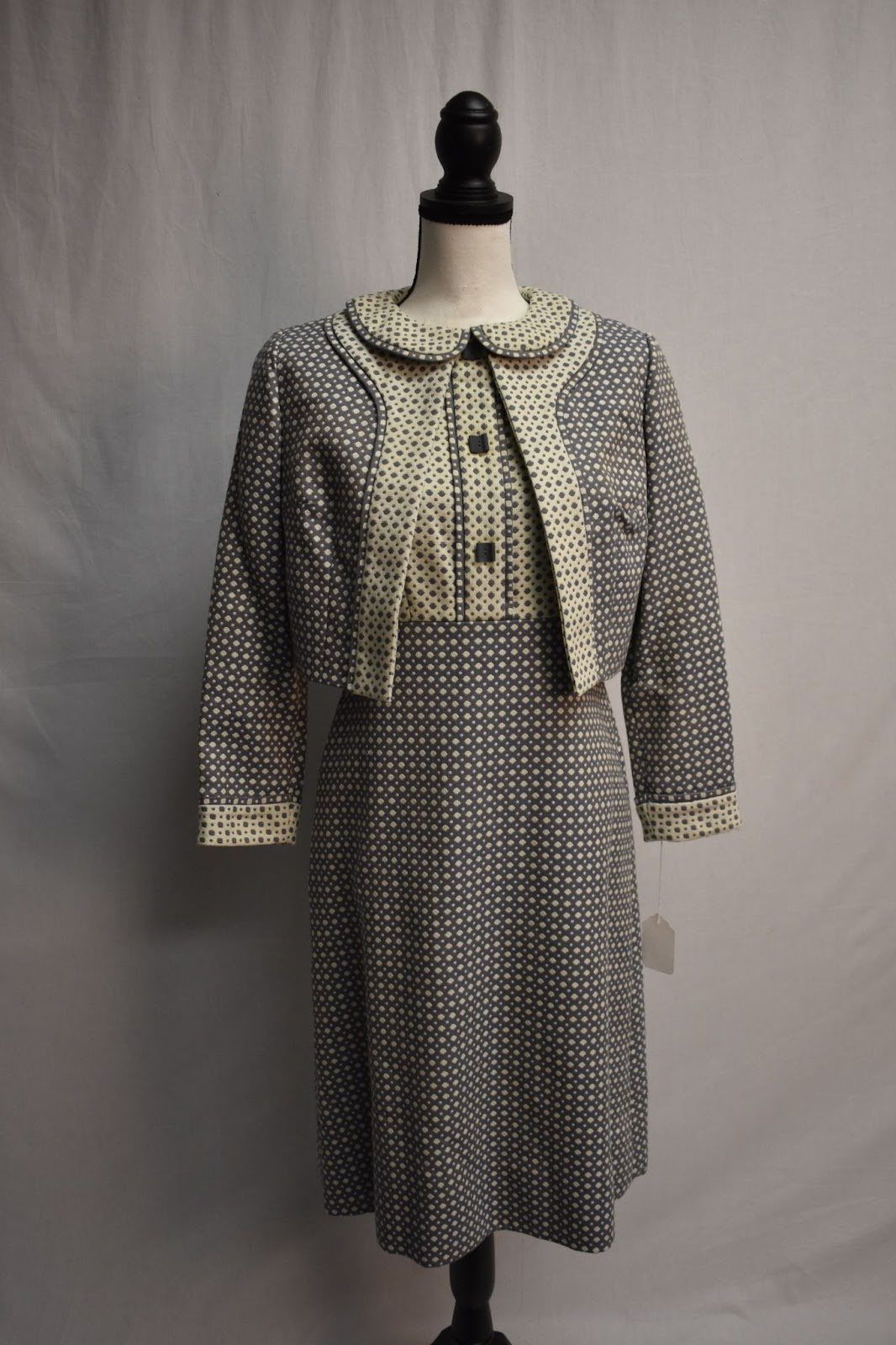 Smoky blue and cream geometric print dress and jacket. Dress has raised waistline, Peter Pan collar, front bodice placket with piping trim and square buttons, and flared knee length skirt. Short boxy jacket with reverse print front placket and cuffs.