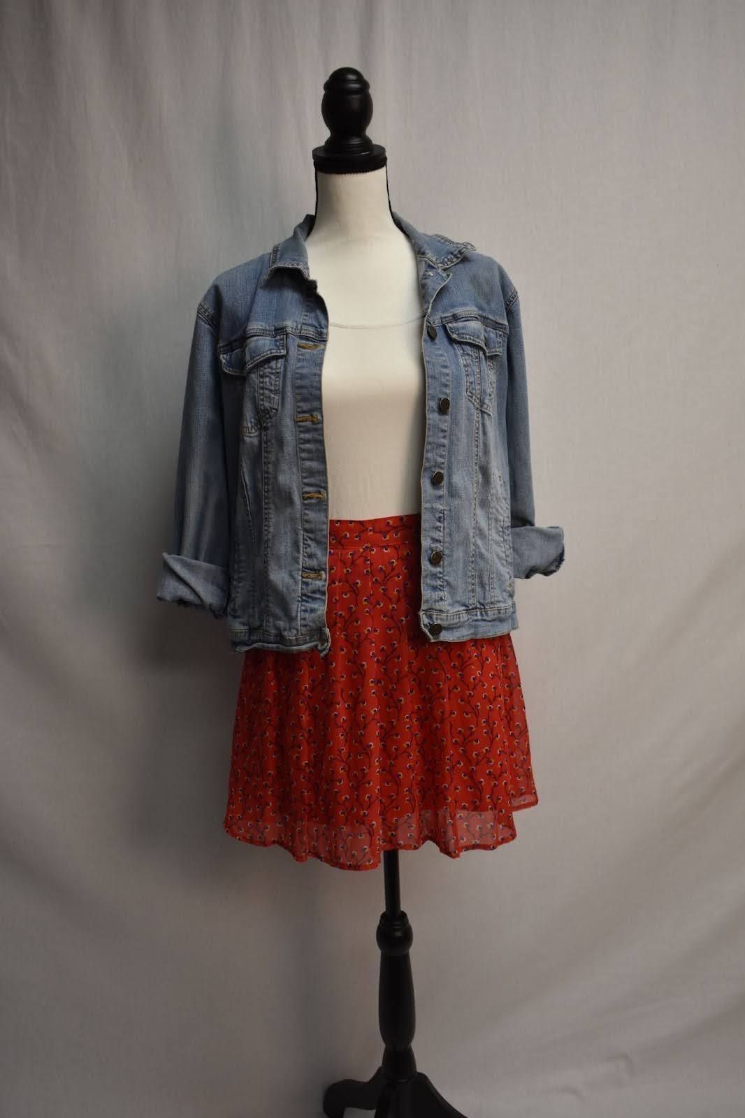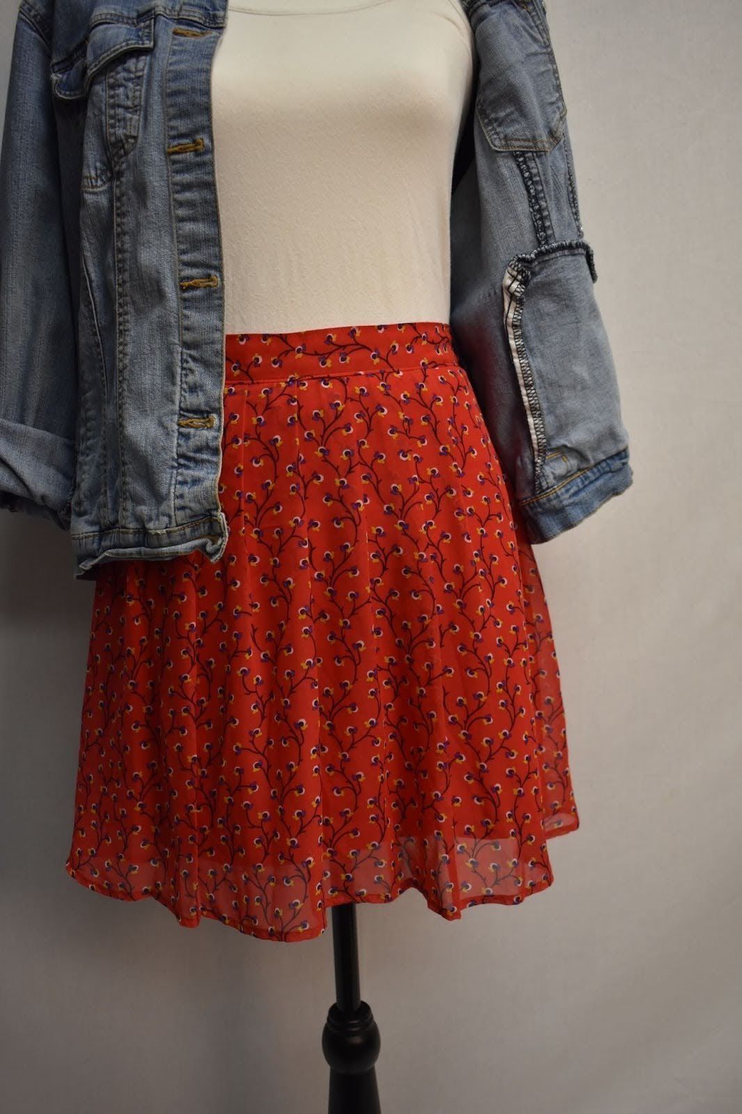 Red abstract floral printed skirt with accordion pleats. The miniskirt is constructed of a sheer fabric with a red knit underskirt.
