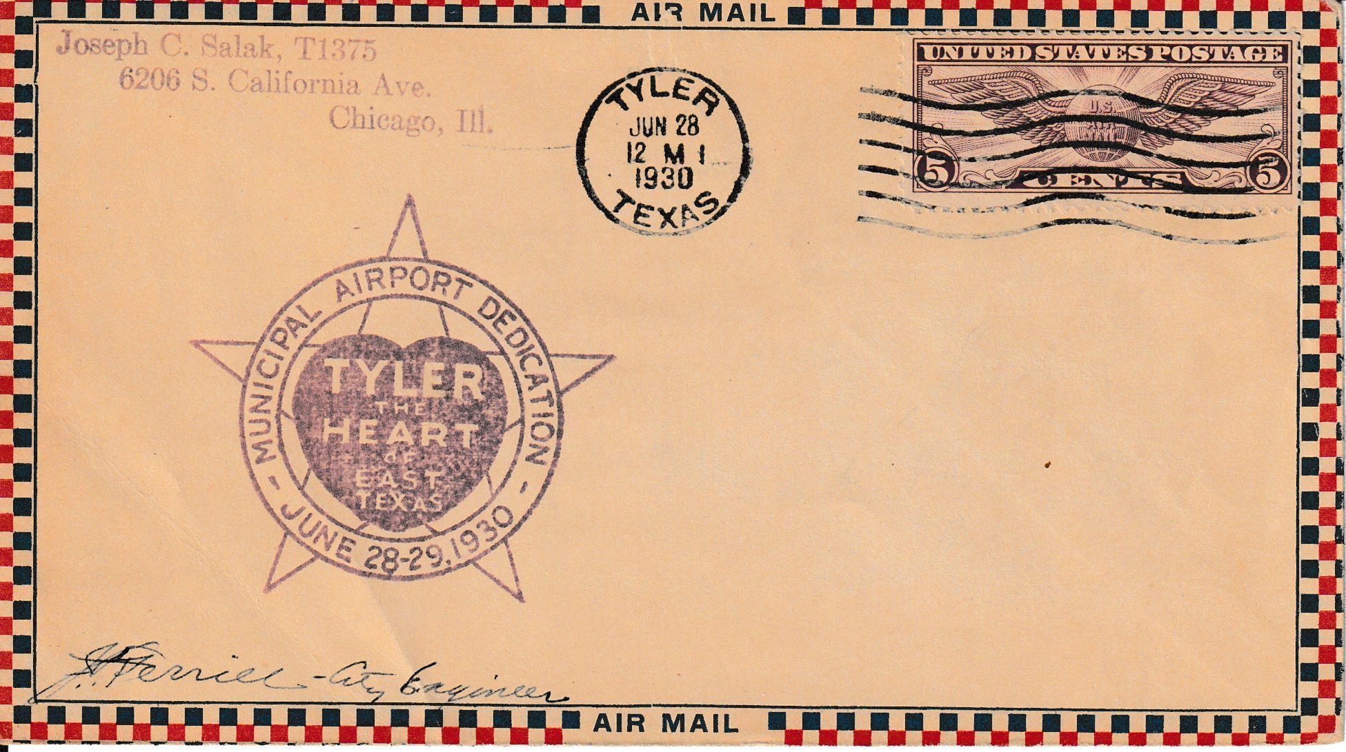 A Tyler Municipal Airport "Dedication" cover postmarked on June 28, 1930 in Tyler, Texas and signed by the postmaster.Context