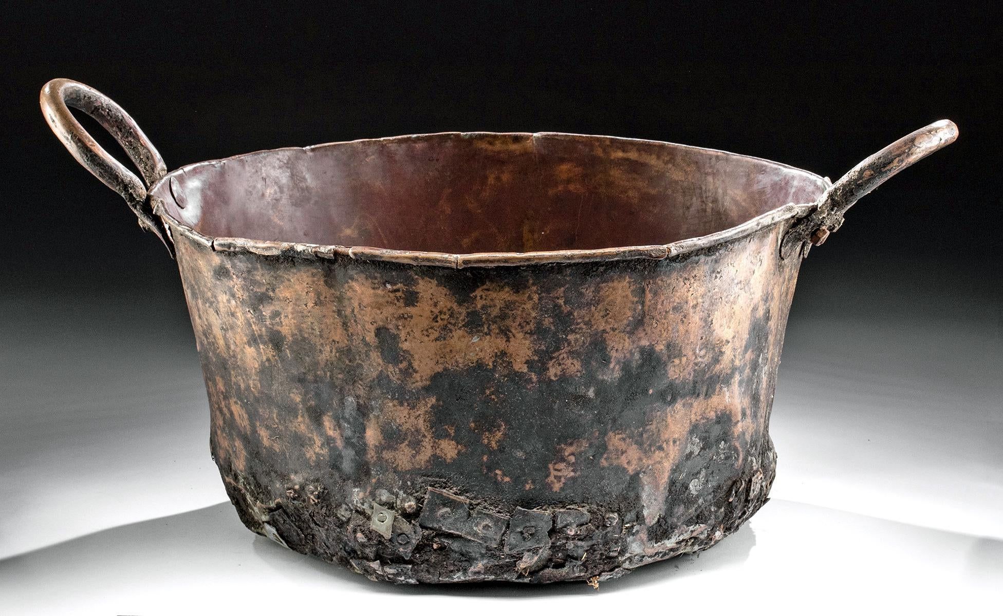 The deep vessel features a rounded base, tall walls that curl at the top to form the rim, and a pair of riveted handles on the sides. The vessel has formed attractive patina and exhibits thick layers of soot on the exterior from heavy use.Context
