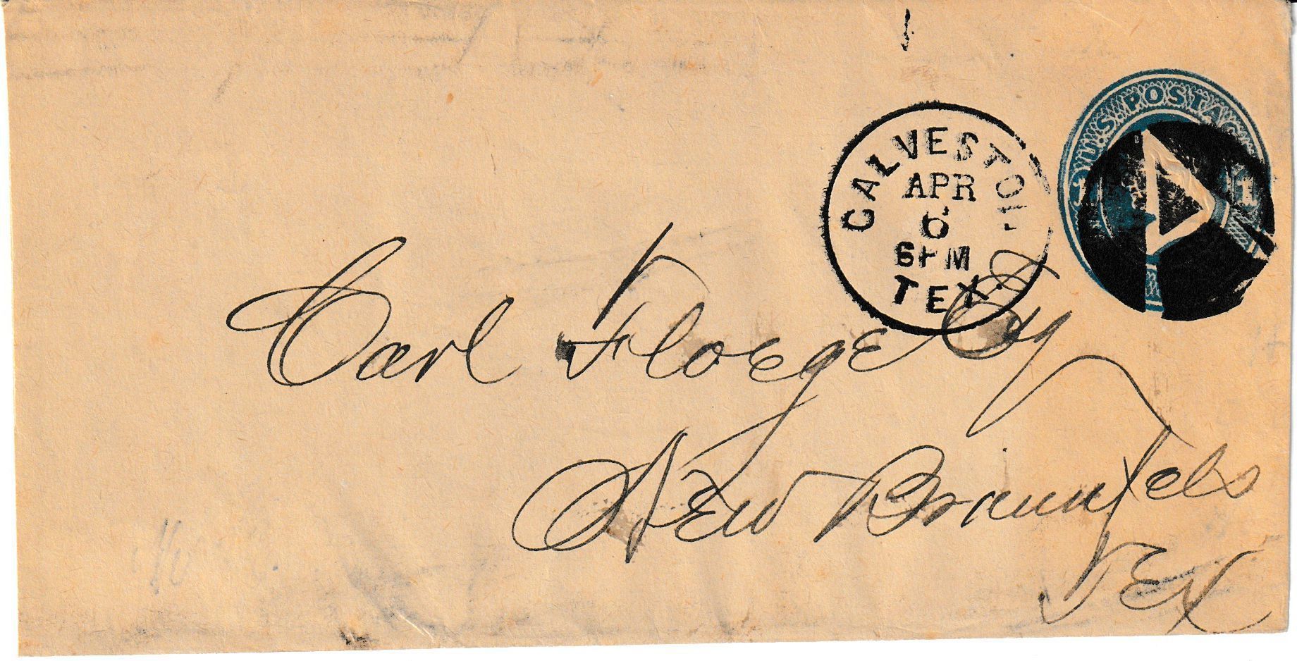 Cover addressed to "Carl Floege Esq / New Braunfels / Tex" and postmarked "GALVESTON / APR 6 / TEX."Context