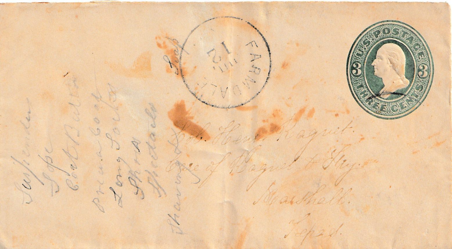 Circa 1873 – 1877 cover addressed to “Col Henry Raguet / Care of Raguet & Logan / Marshall / Texas.” Postmarked "FARMDALE / JUL 12."Context