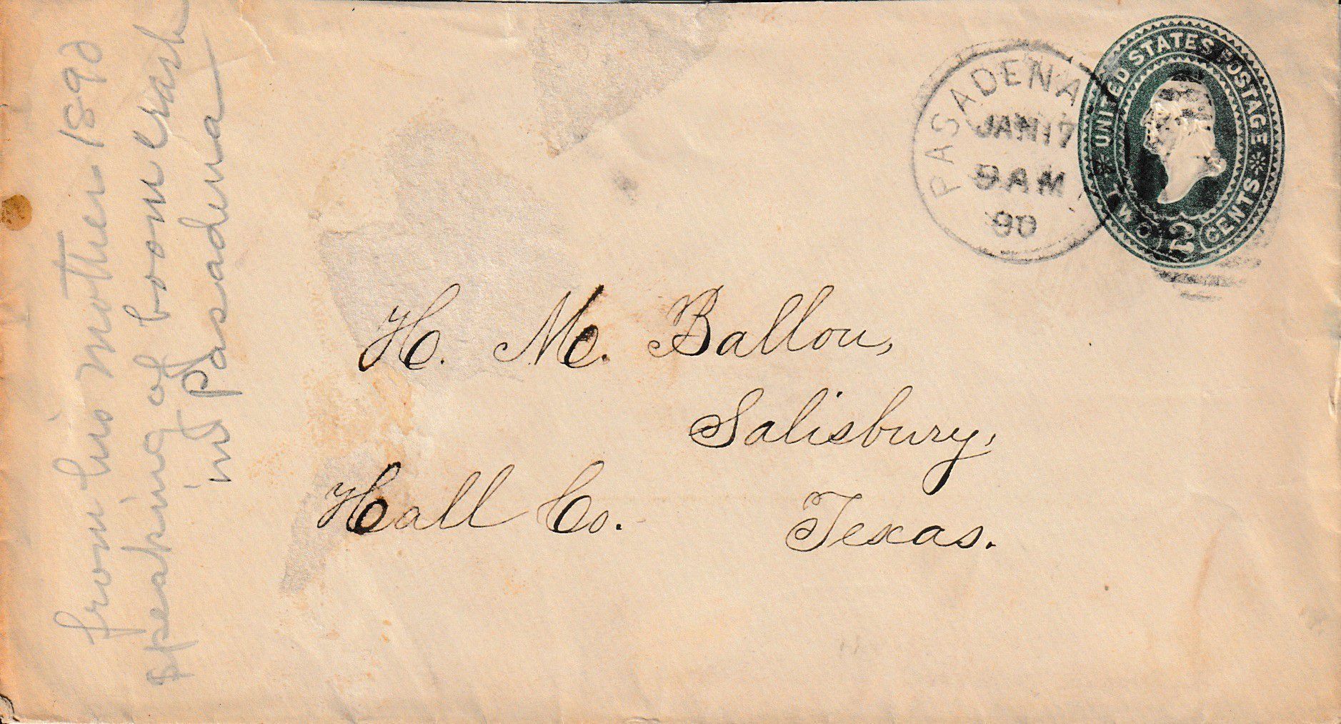 Cover addressed to "H. M. Ballou, / Salisbury / Hall Co. Texas." Postmarked "PASADENA / JAN 17 / 90." - the only full year of the city.Context