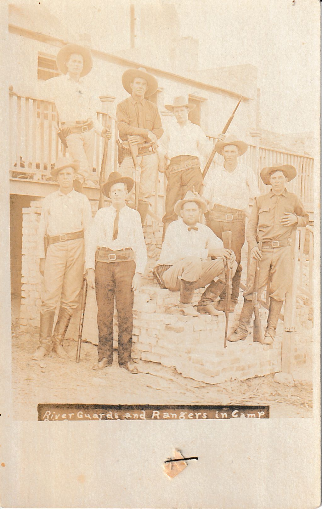 1907 real picture postcard of “River Guards and Rangers in Camp.” The back of the postcard identifies the man sitting in the front row as “Guapo.”Context