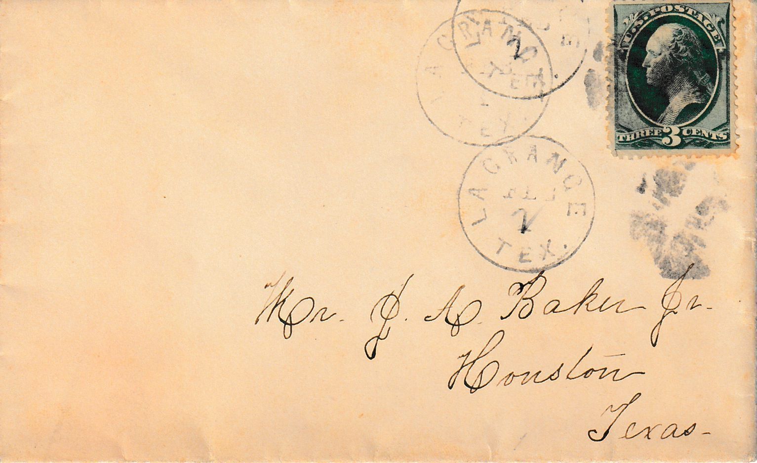 Late 1870s cover from LaGrange, Texas addressed to “Mr. J. A. Baker Jr., / Houston / Texas."Context
