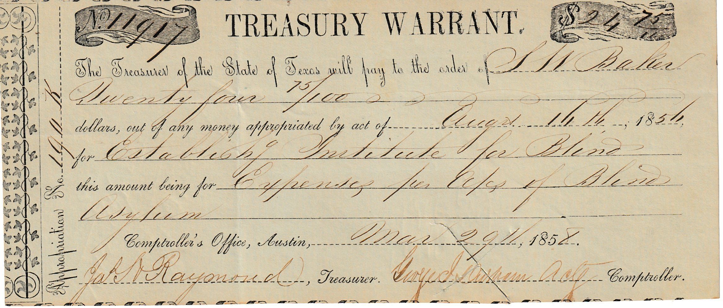 The Treasurer of the State of Texas will pay to the order S. W. Baker Twenty-four 75/100 dollars, out of any any money appropriated by act of Augst 14th, 1856 for Establishg Institute for Blind this amount being for Expenses for ??? of Blind Asylum.